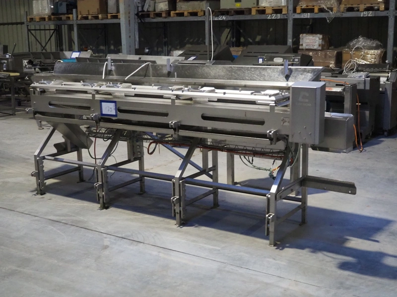 Carsoe trimming table, s/s frame, plastic belt, type: TRIMMING TABLES X 3, SO-number: SO 14153, year of construction: 2018, 3x400 V, 0.18 kW, belt width: (2x) 130 mm, total dimensions: 3600 mm x 900 mm x 1300 mm, dimensions switch cabinet: 800 mm x 220 mm x 1050 mm.
