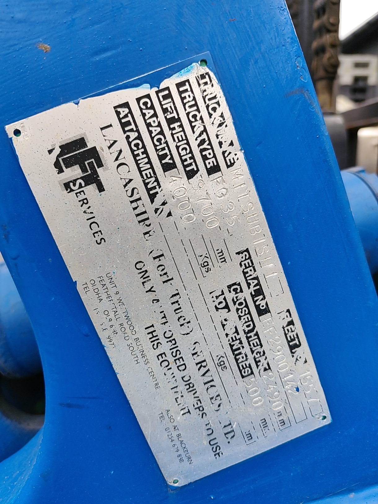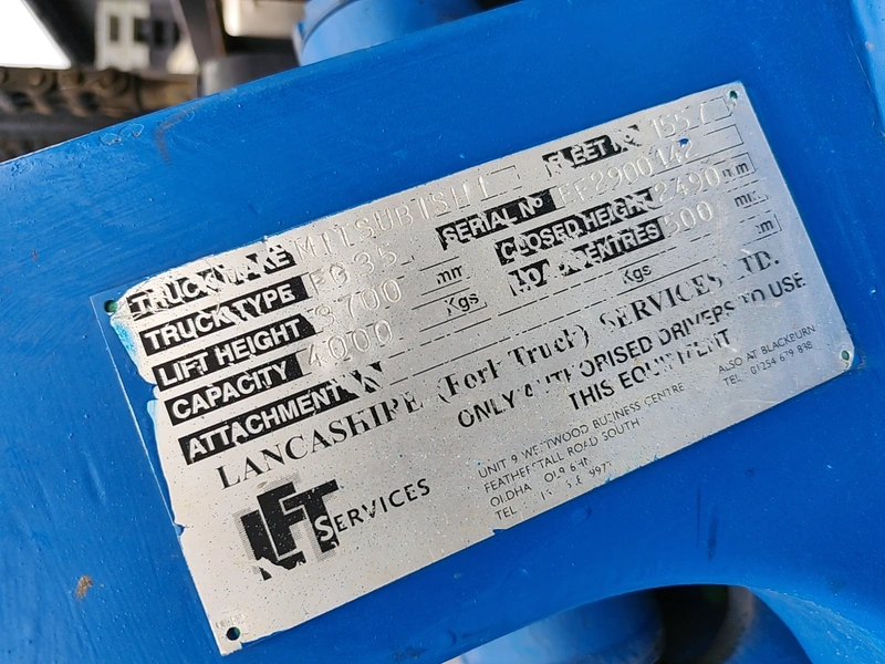 Mitsubishi forklift truck, type: FG35, serial number: EF2900142, lift height: 3700mm, closed height: 2490 mm, capacity 4000kg, load centre 1500 mm.