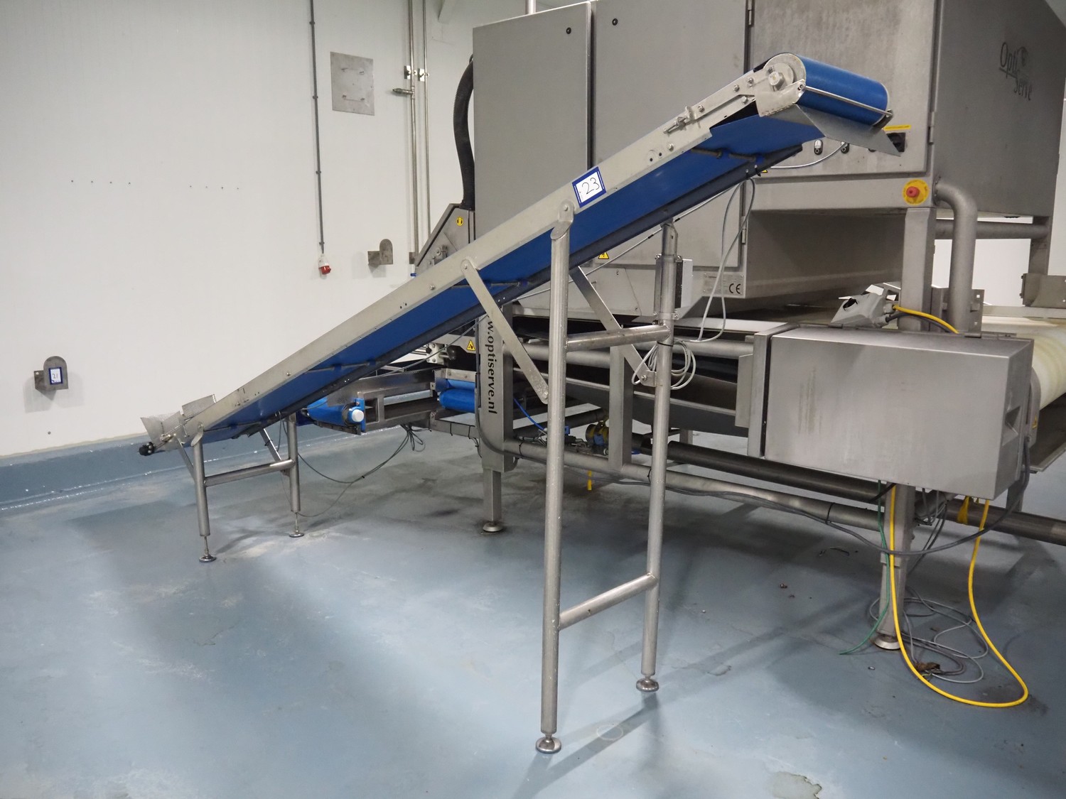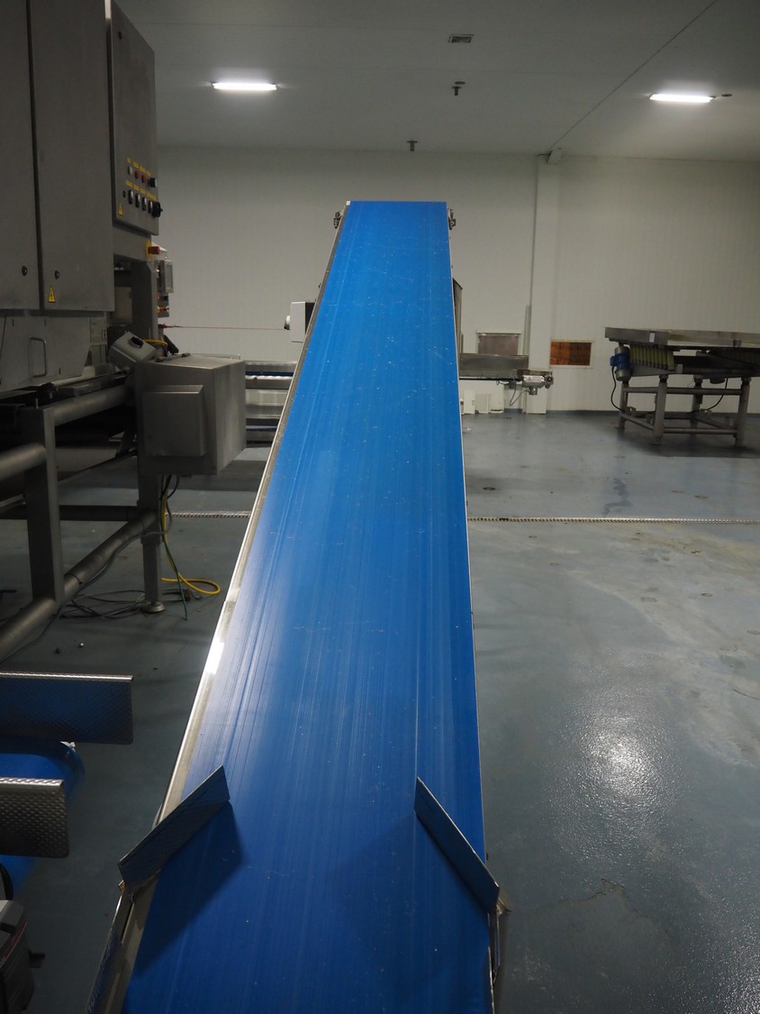 Elevating belt, s/s frame, plastic belt, belt width: 440 mm, elevating height: 1960 mm, total dimensions: 3800 mm x 700 mm x 1980 mm.