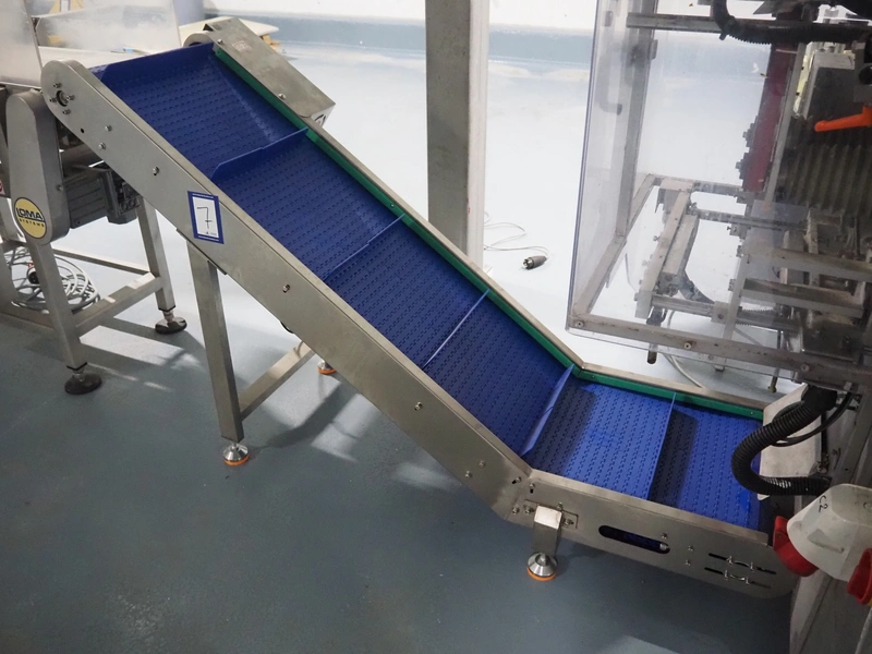 Elevating belt, s/s frame, plastic belt with dividers, belt width: 400 mm, divider height: 50 mm, distance between dividers: 300 mm, elevating height: 900 mm, total dimensions: 1600 mm x 600 mm x 950 mm.