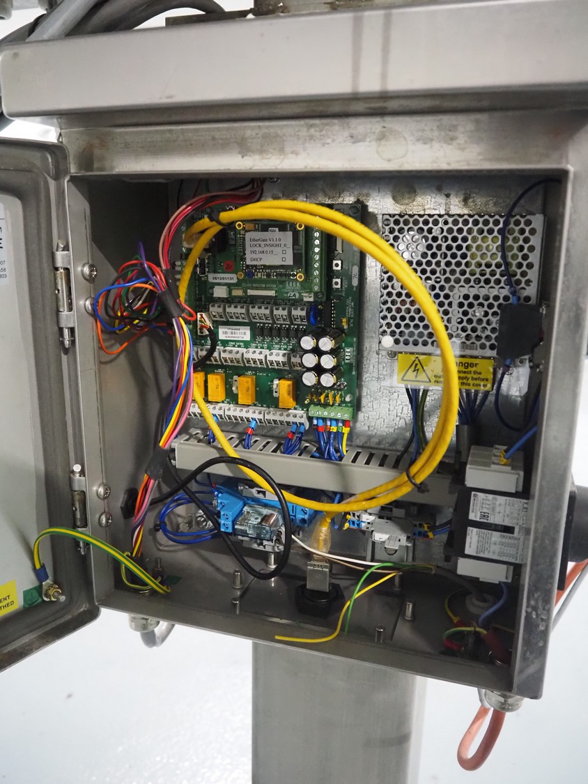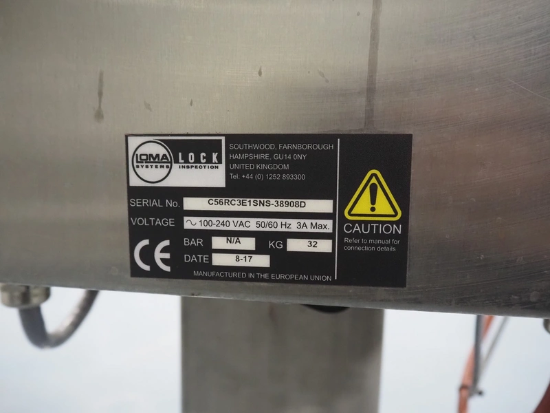 Loma Systems fall through metal detector, serial number: C56RC3E1SNS-38908D, year of construction: 8-17, 100-240 V, 50/60 Hz, 3 A, clearance: Ø 120 mm, dimensions metal detector head: 300 mm x 400 mm x 220 mm, dimensions control cabinet: 300 mm x 175 mm x 400 mm.