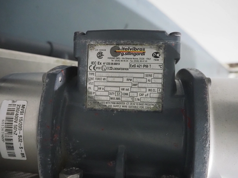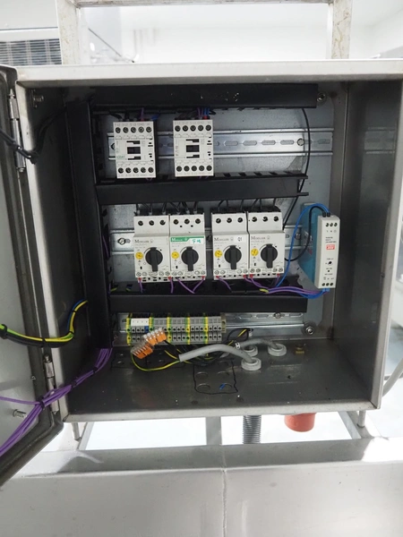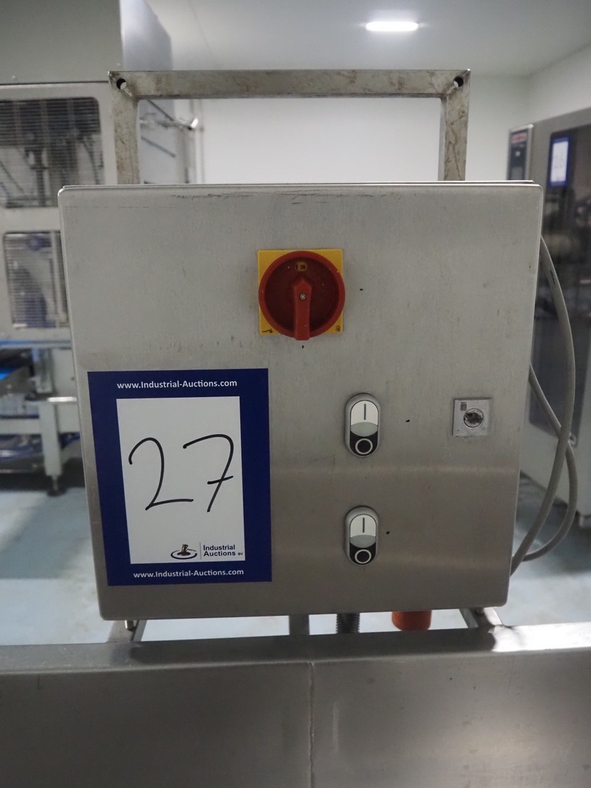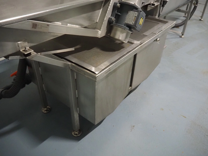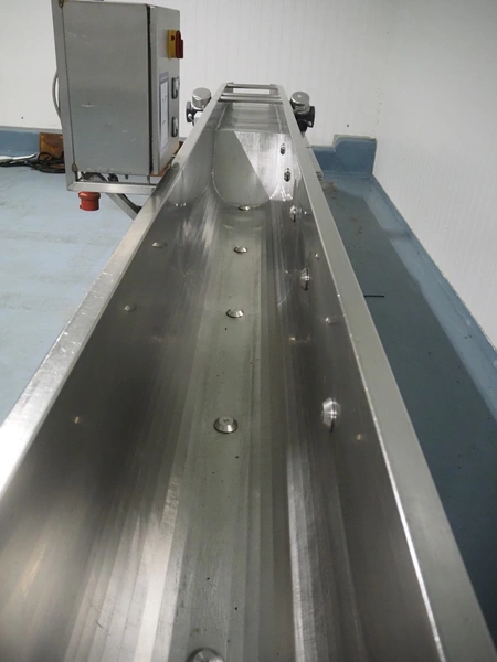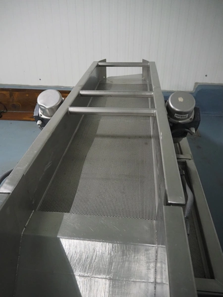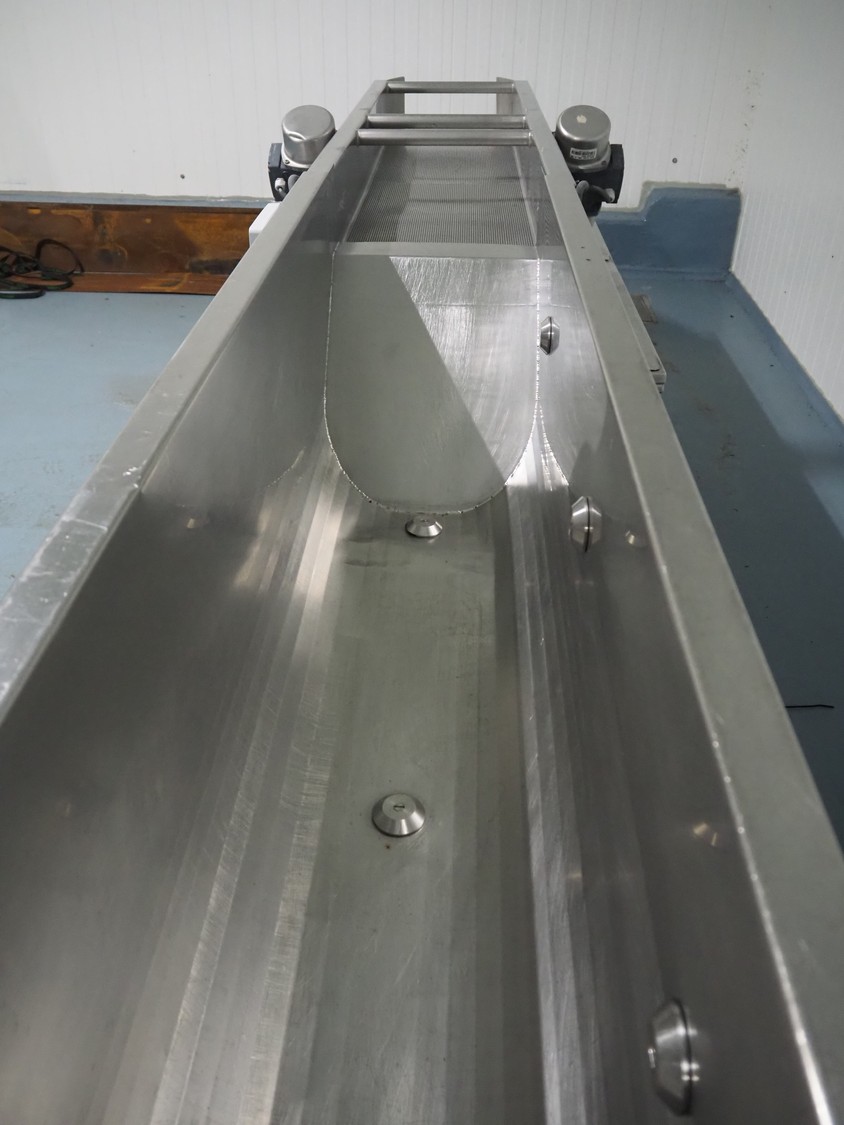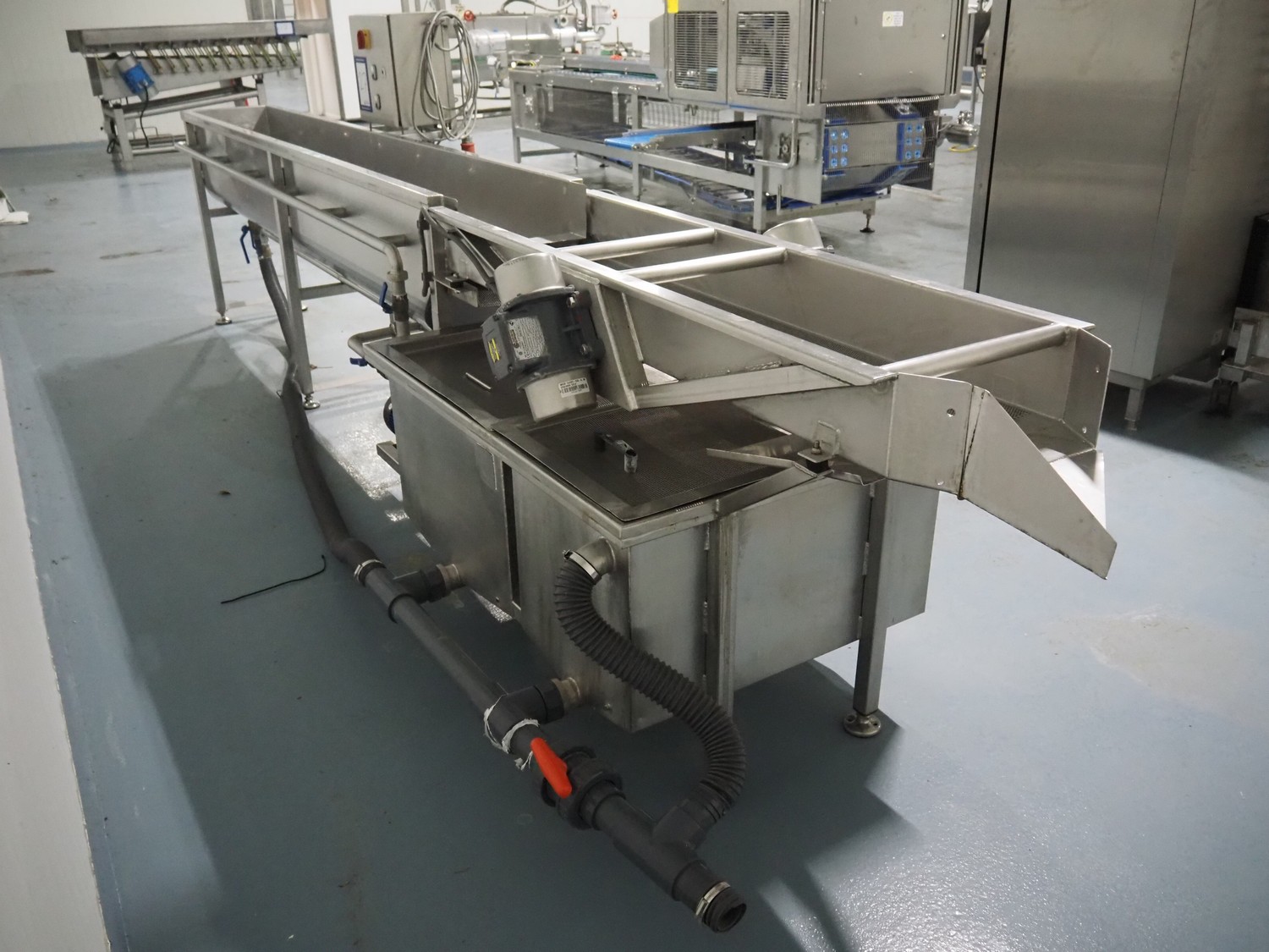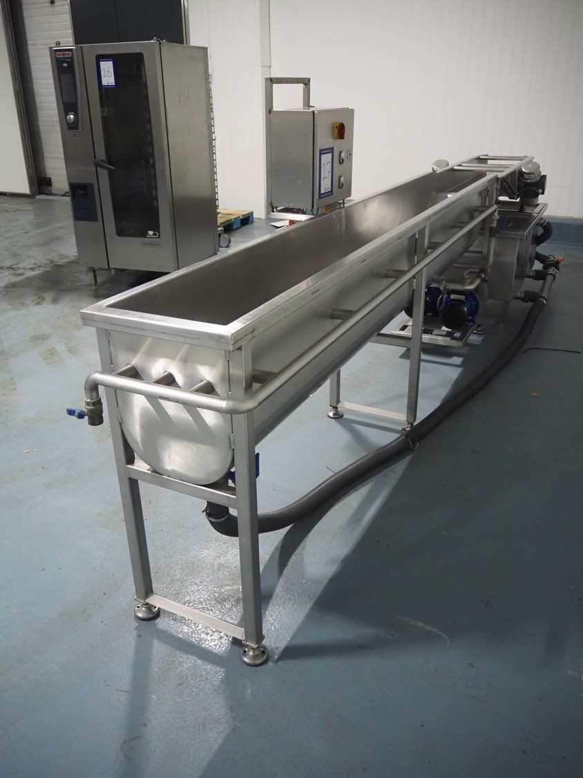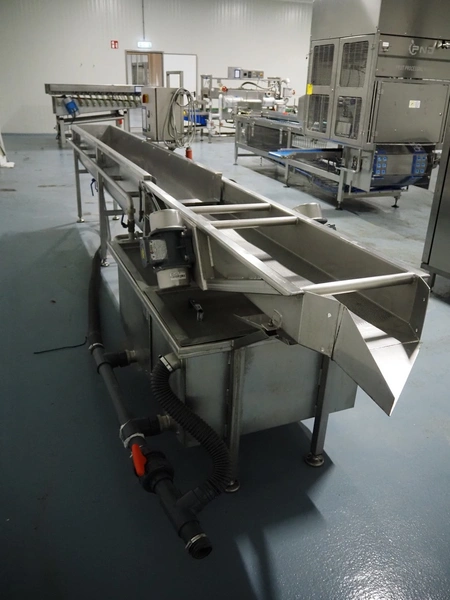 Vegetable washer, 400 V, 3 Ph, 50 Hz, 8.82 A, 16 kW, inside dimensions: 350 mm x 2700 mm x 420 mm, total dimensions: 4900 mm x 1000 mm x 1540 mm.
