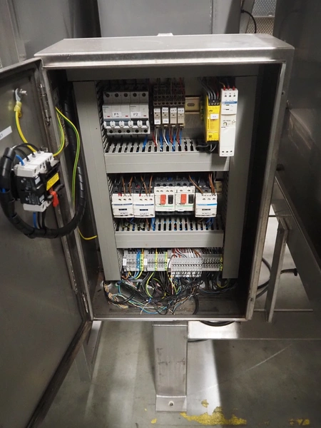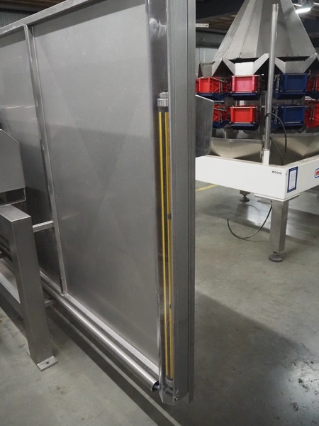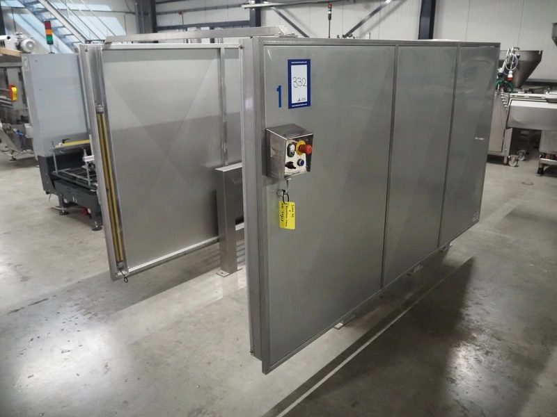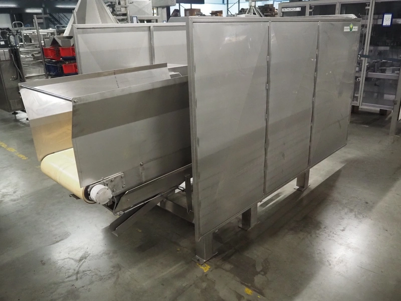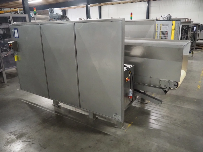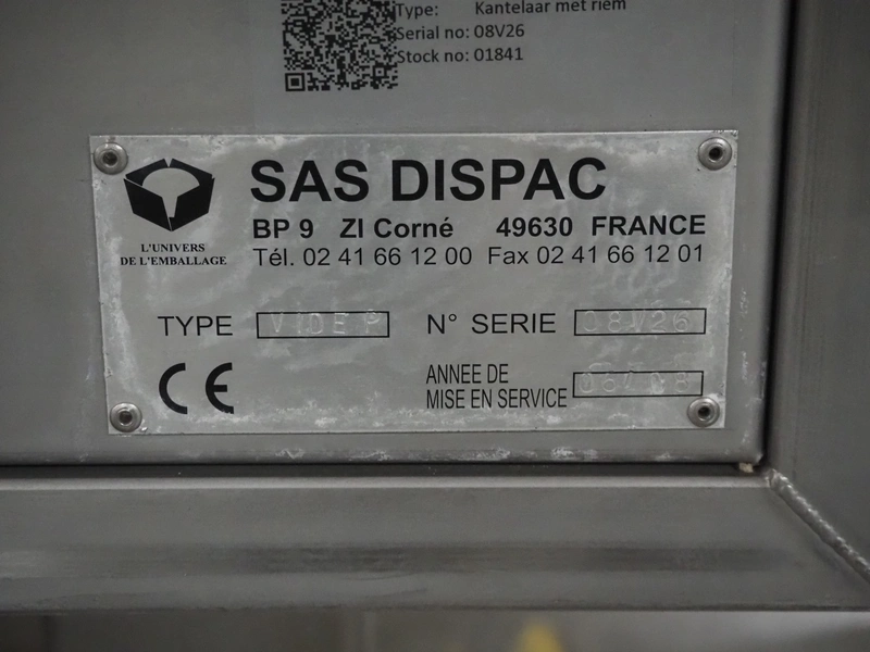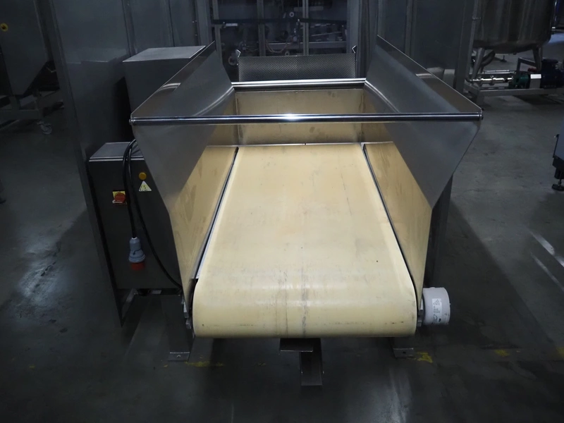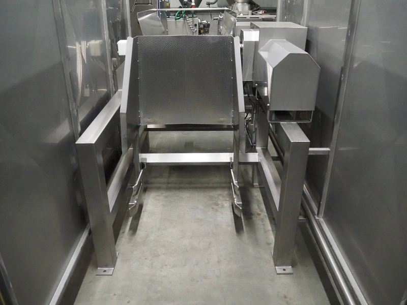 SAS DISPAC tilting device for 200 liter meat bins with outfeed belt, type: VIDEP, serial number: 08V26, year of construction: 06/08, plastic belt, belt width: 600 mm, total dimensions: 3400 mm x 1580 mm x 1810 mm.