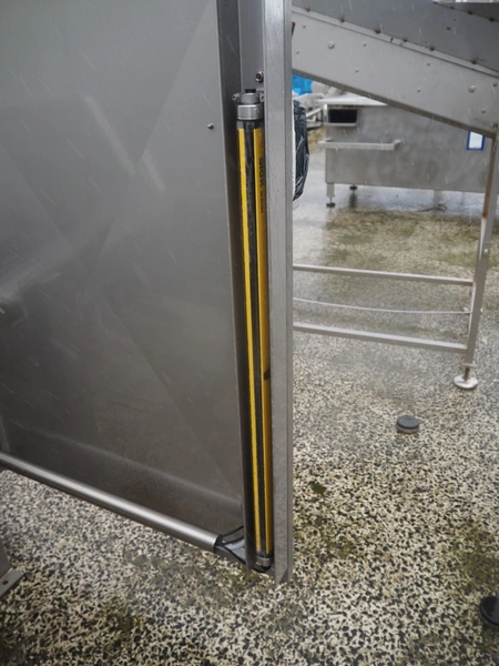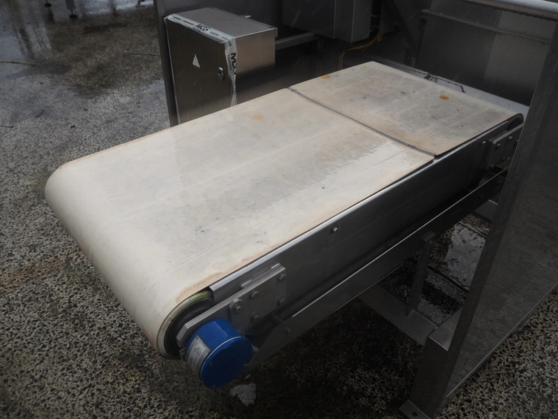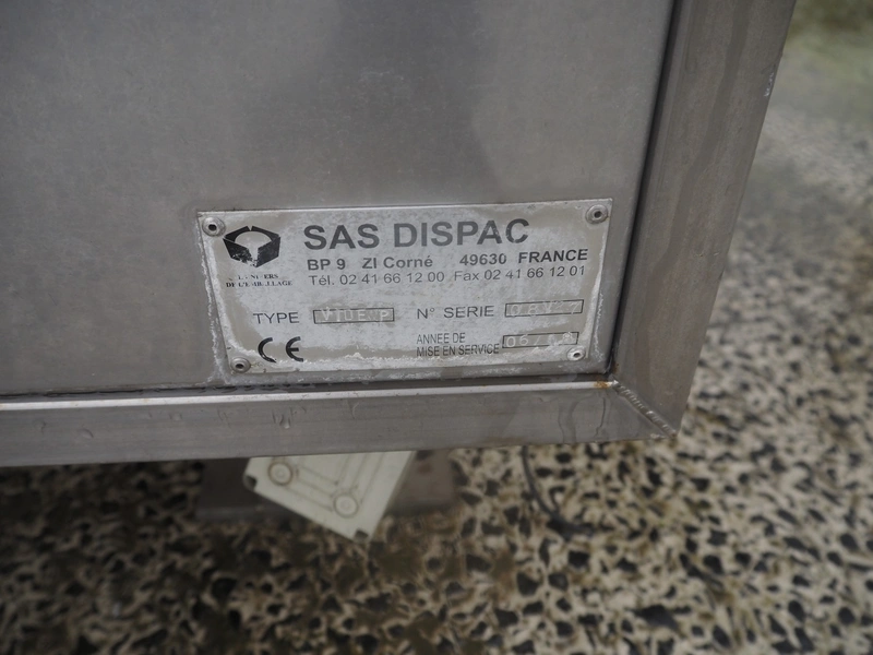 SAS DISPAC tilting device for 200 liter meat bins with outfeed belt, type: VIDEP, serial number: 08V27, year of construction: 06/08, plastic belt, belt width: 600 mm, total dimensions: 3400 mm x 1580 mm x 1810 mm.