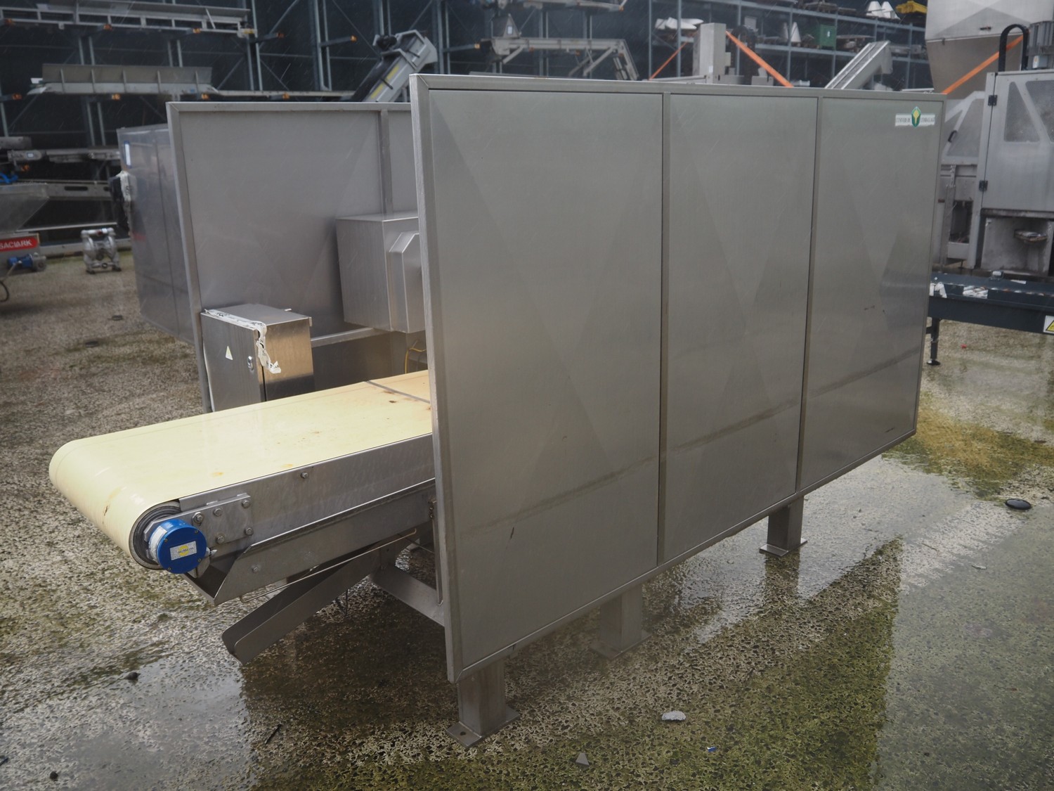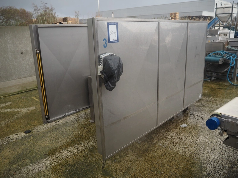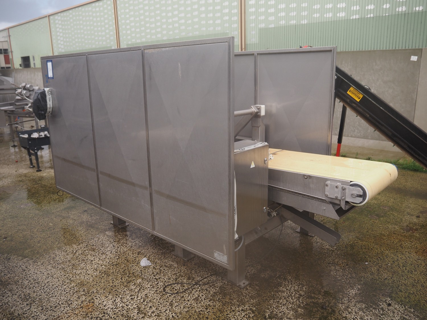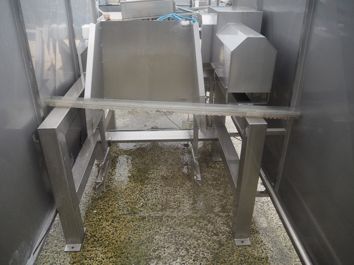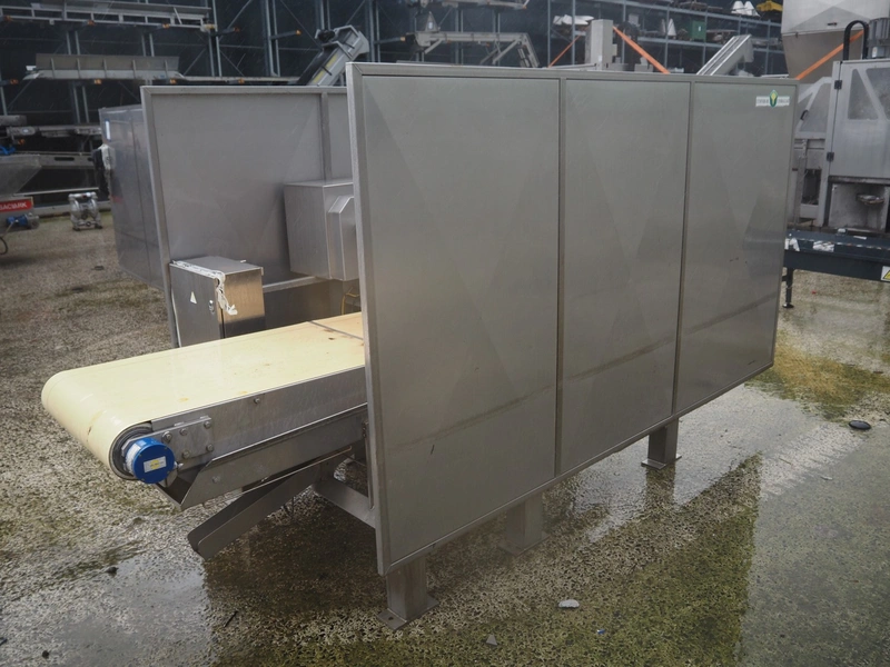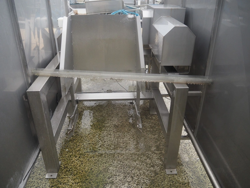 SAS DISPAC tilting device for 200 liter meat bins with outfeed belt, type: VIDEP, serial number: 08V28, year of construction: 06/08, plastic belt, belt width: 600 mm, total dimensions: 3400 mm x 1580 mm x 1810 mm.