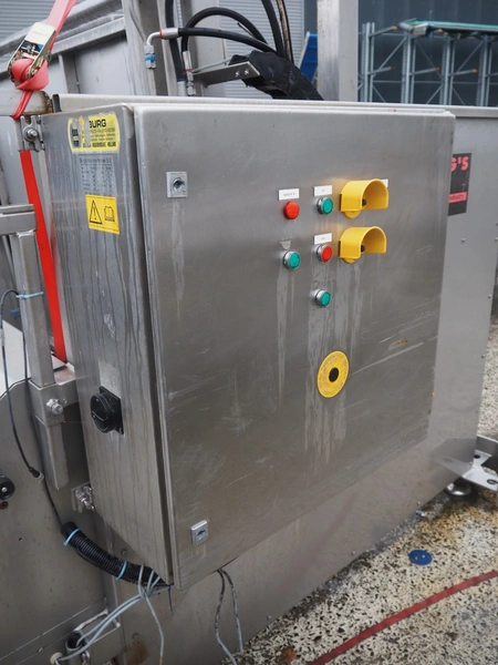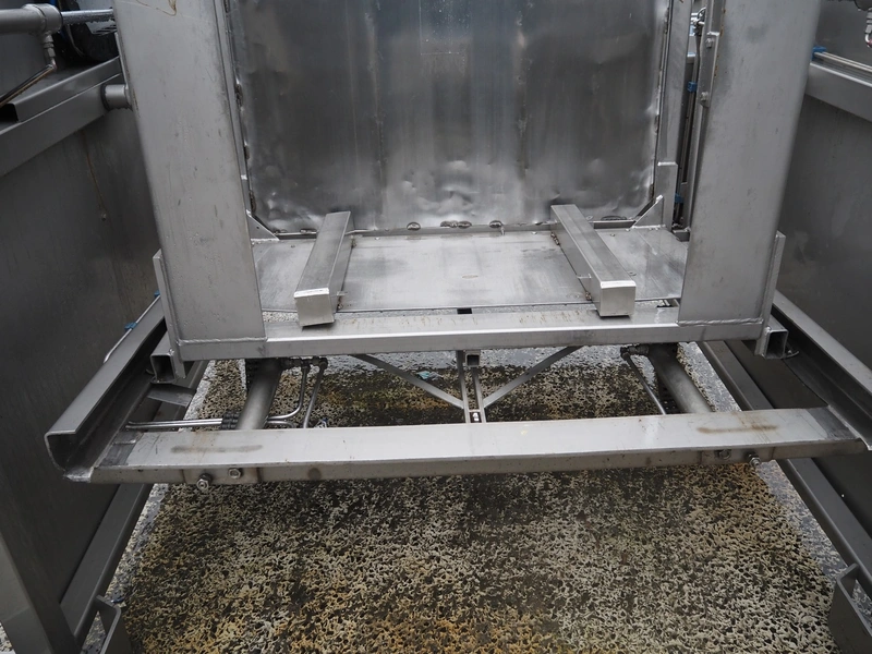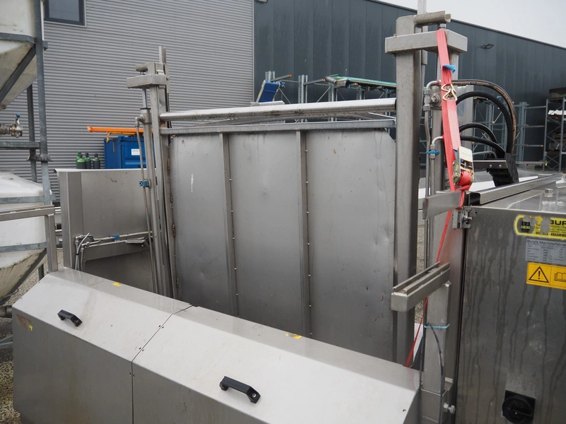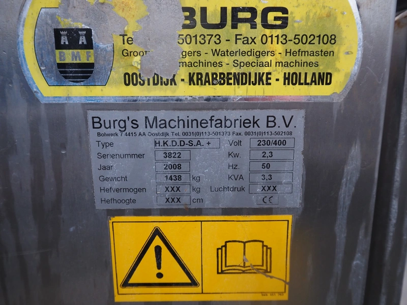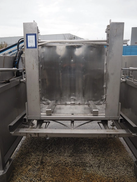 Burg's Machinefabriek tilting device for pallet boxes, type: H.K.D.D-S.A.+, serial number: 3822, year of construction: 2008, 230/400 V, 50 Hz, 2.3 kW, 3.3 KVA, weight: 1438 kg, clearance: 1350 mm x 800 mm, total dimensions: 2100 mm x 2070 mm x 2250 mm.