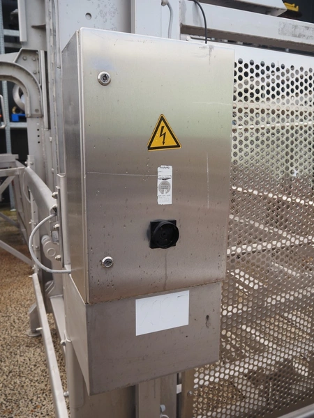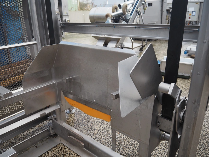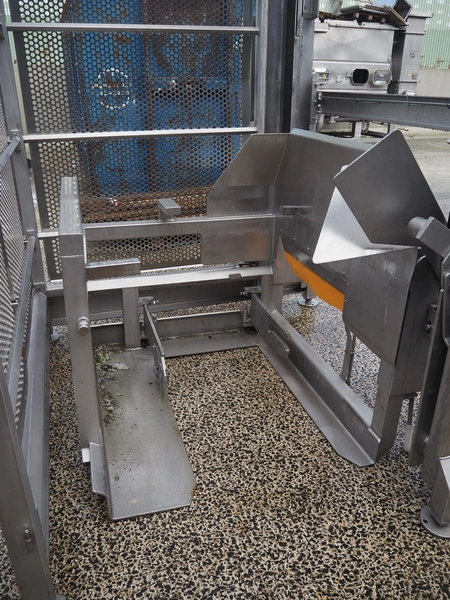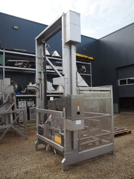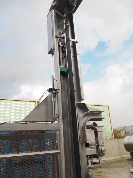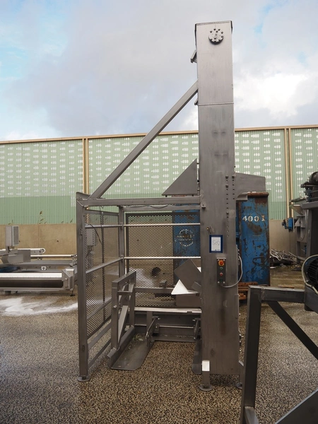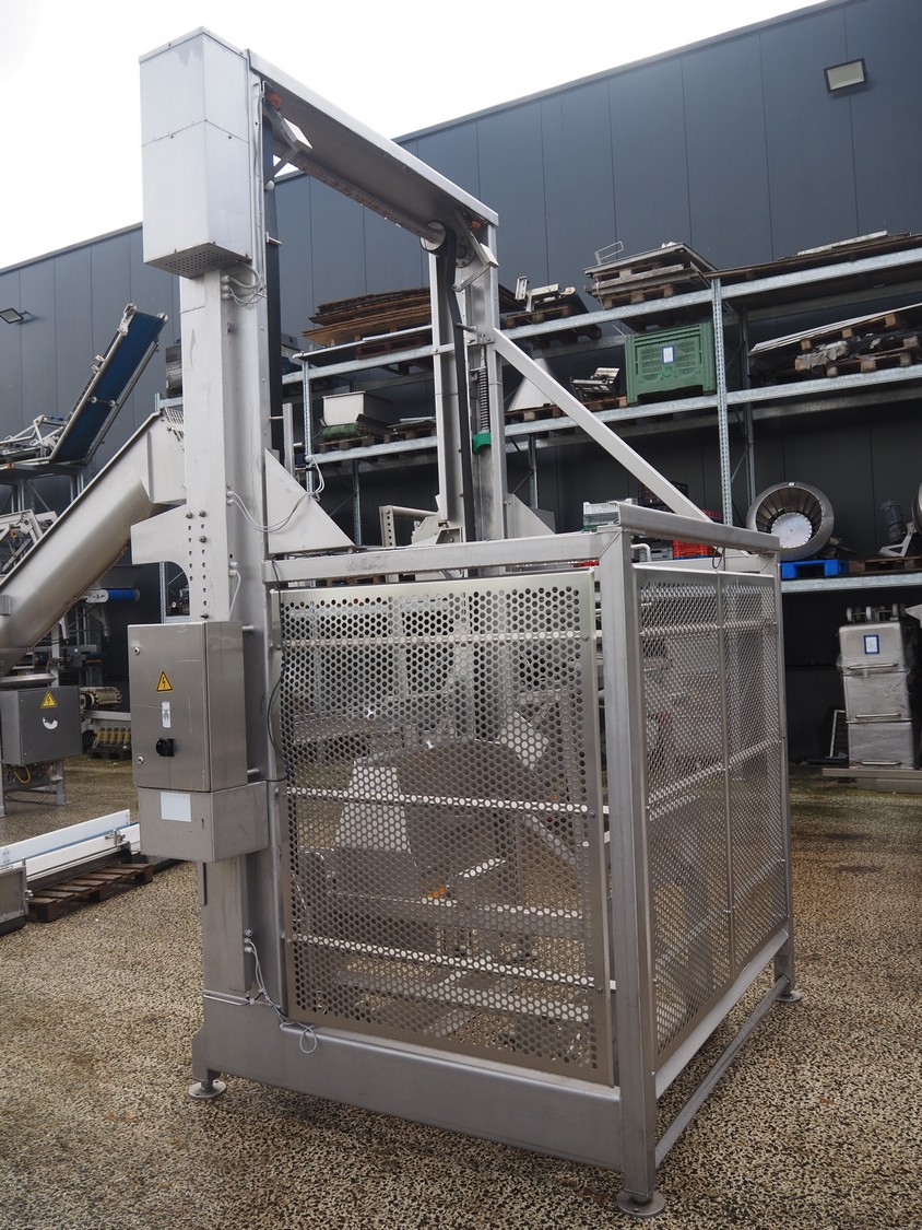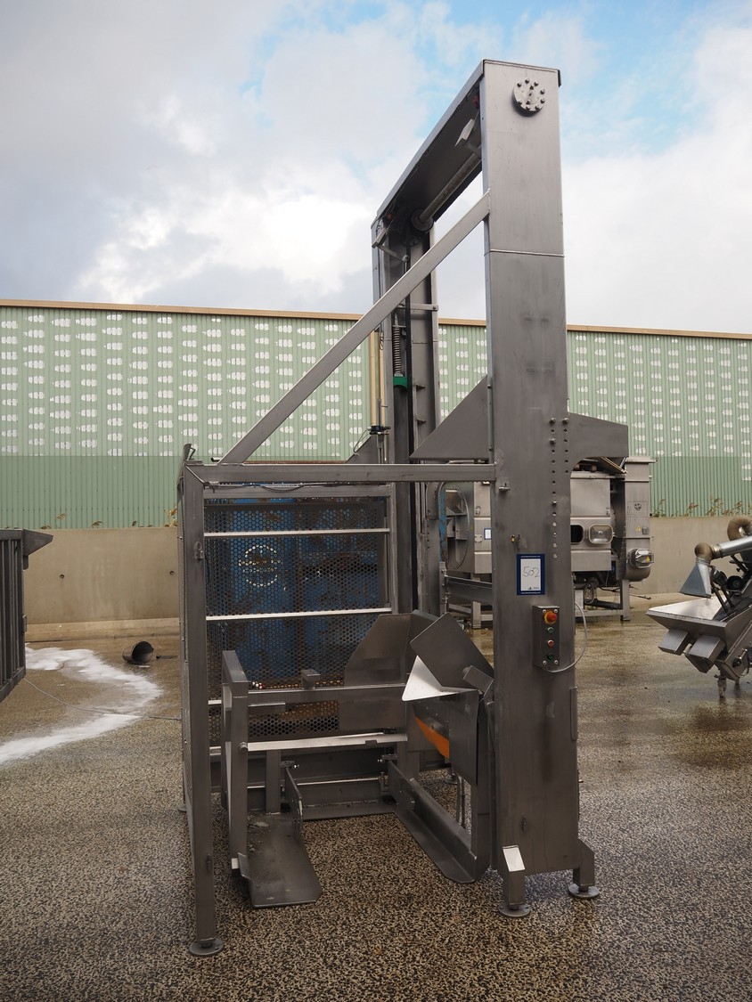 Syspal lifter for 200 liter meat bins, type: GE100-1018, serial number: K3574-2, year of construction: 2011, safe working load: 200 kg, lifting height: 2650 mm, total dimensions: 1150 mm x 1150 mm x 4170 mm. Damaged.