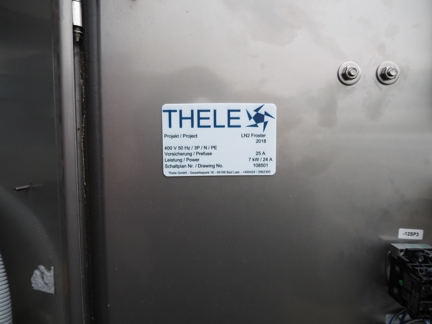 Thele nitrogen belt freezer, model: LN2 Froster, year of construction: 2018, 400 V, 3 Ph, 50 Hz, 25/24 A, 7 kW, maximum belt width: 660 mm, dimensions: (1x) 3900 mm x 1400 mm x 2400 mm, (1x) 4400 mm x 1600 mm x 1800 mm. Incomplete.