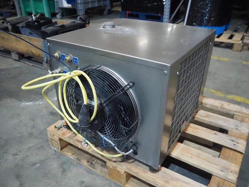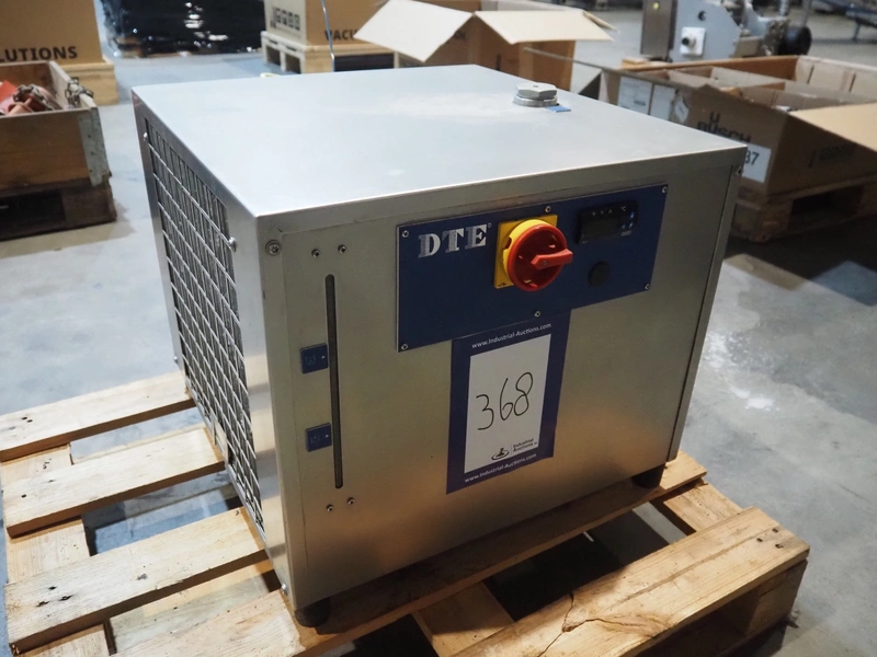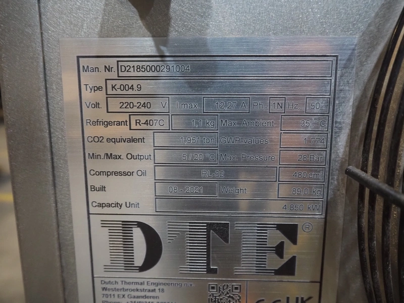 DTE chiller, type: K-004.9, manufacturing number: D2185000291004, year of construction: 08-2021, 220-240 V, 1 Ph, 50 Hz, 12.27 A, refrigerant: R-407C, 1.1 kg, dimensions: 700 mm x 550 mm x 500 mm.
