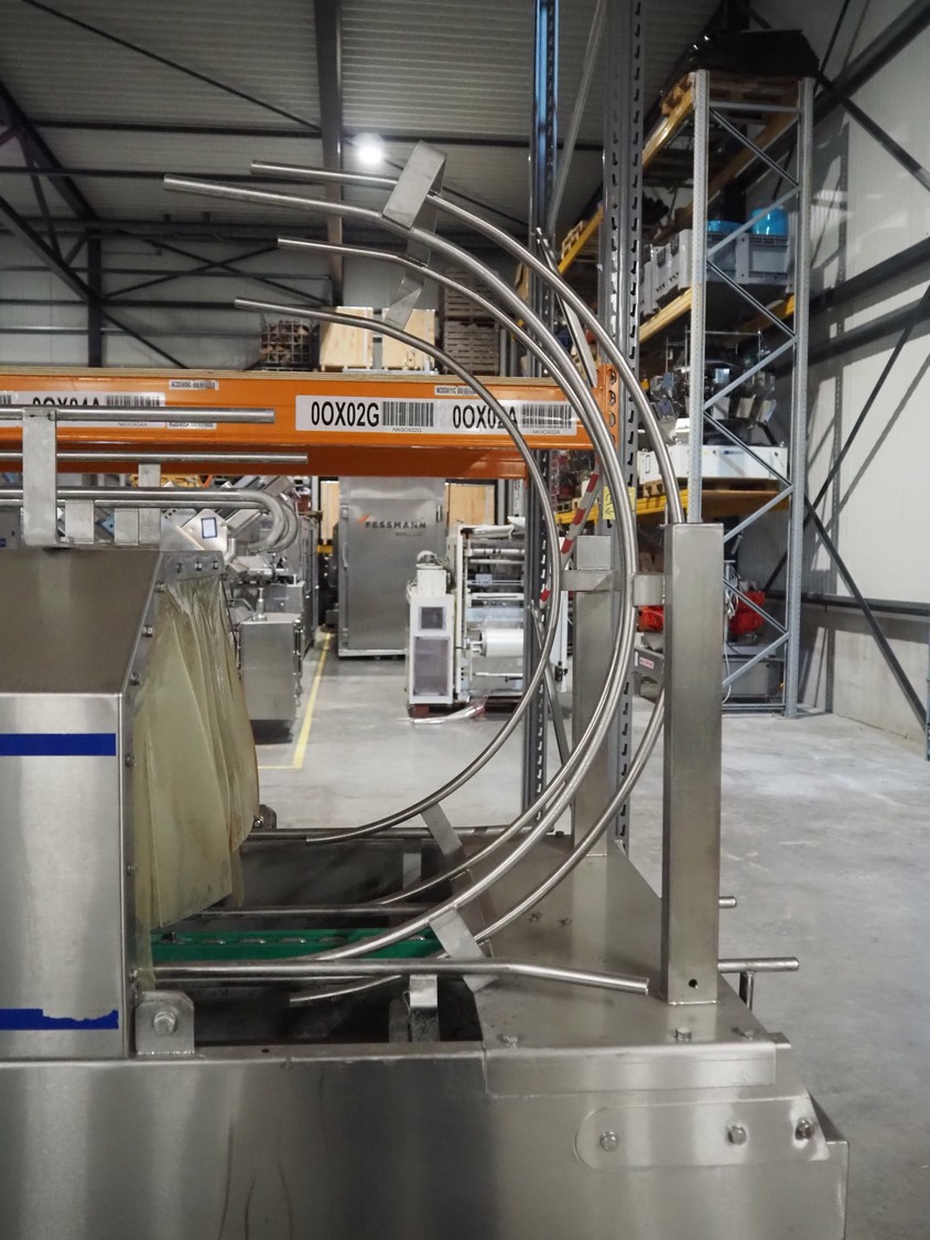 Cretel crate washing machine, s/s chain conveyor with dividers, belt width: 450 mm, distance between dividers: 760 mm, divider height: 15 mm, total dimensions: 3650 mm x 1000 mm x 1720 mm. Including blower.