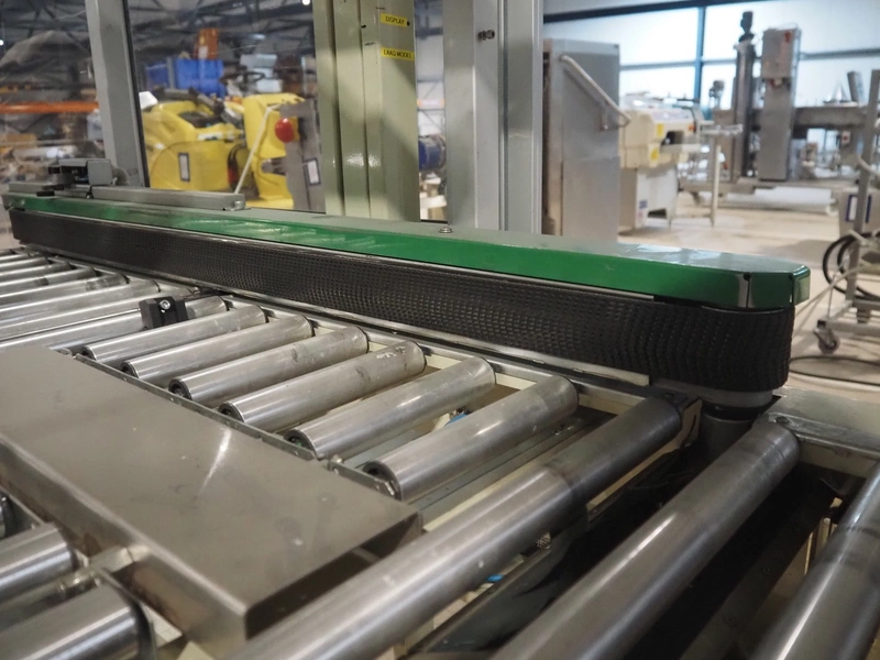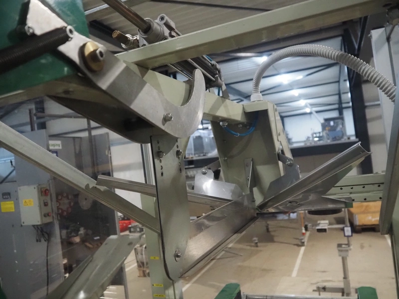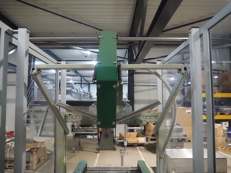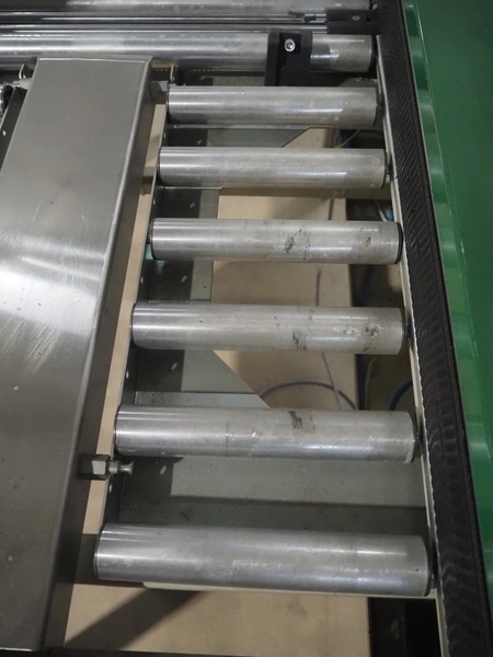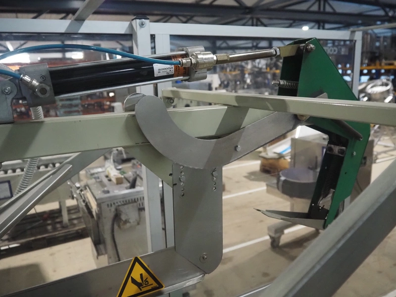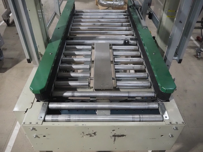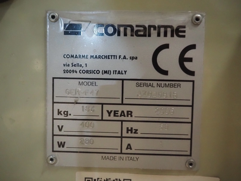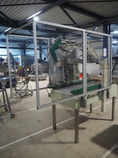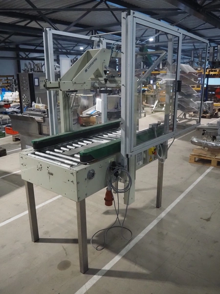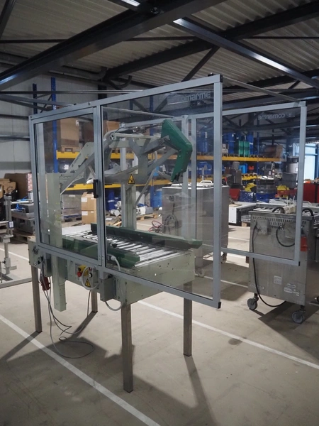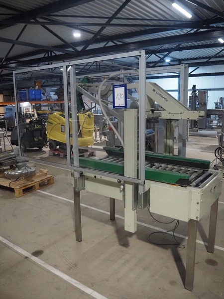 Comarme box closing machine with top taper, model: GEM-f47, serial number: AZ025815, year of construction: 2005, 400 V, 50 Hz. 1 A, 280 W, weight: 186 kg, steel rollers, roller width: 520 mm, plastic belt, belt width: 50 mm, total dimensions: 2200 mm x 980 mm x 1960 mm.