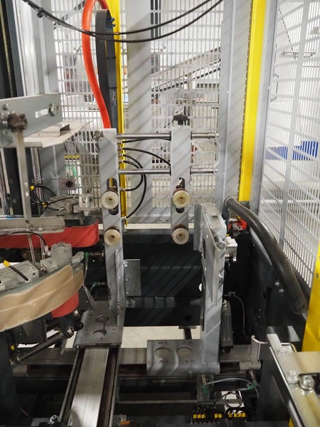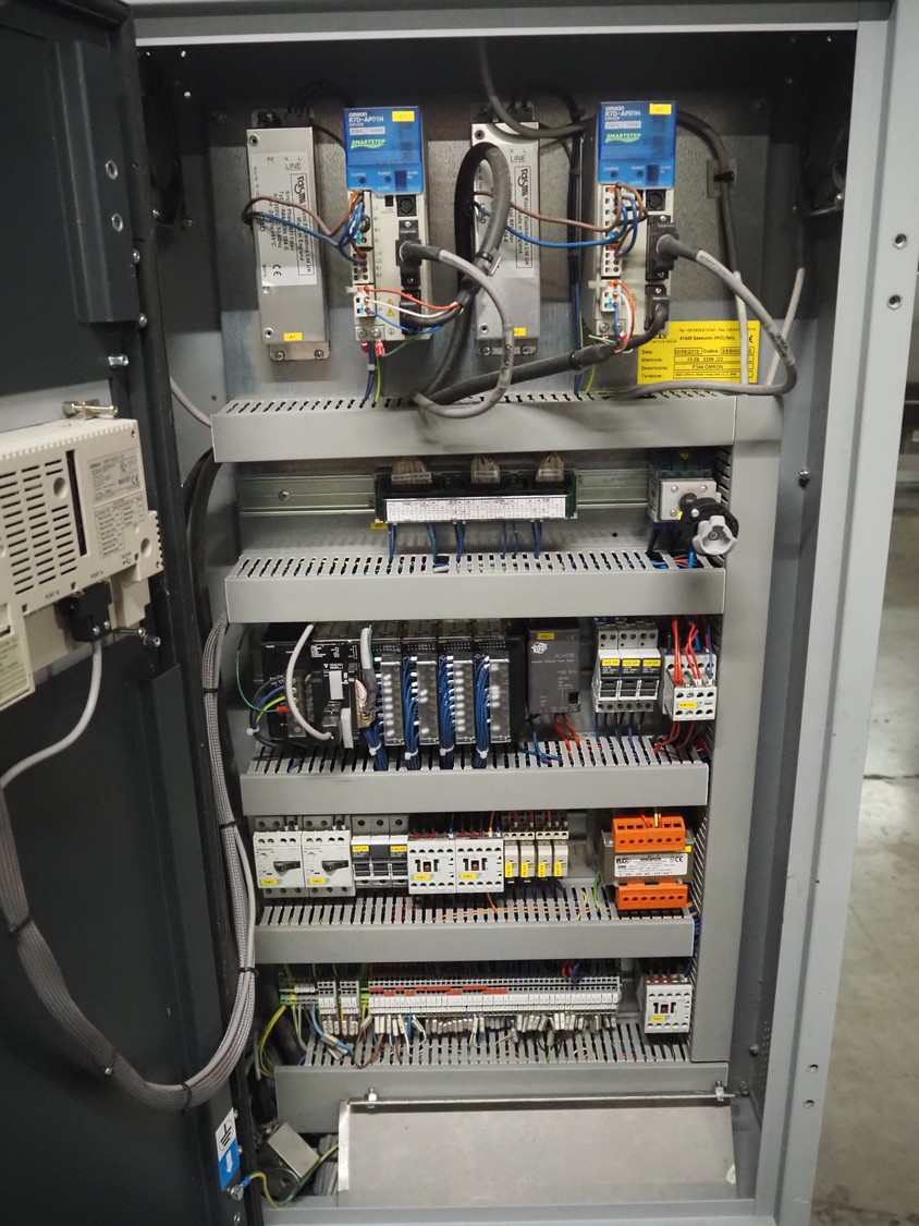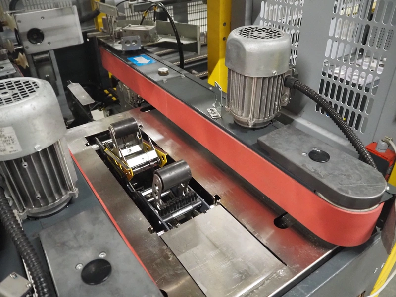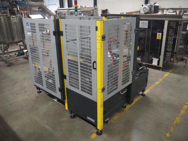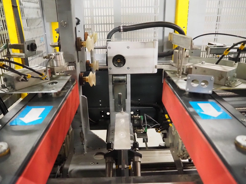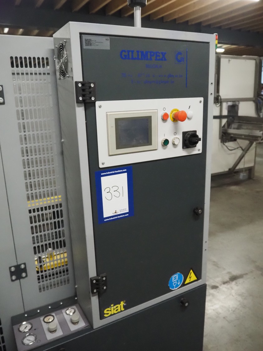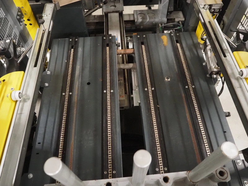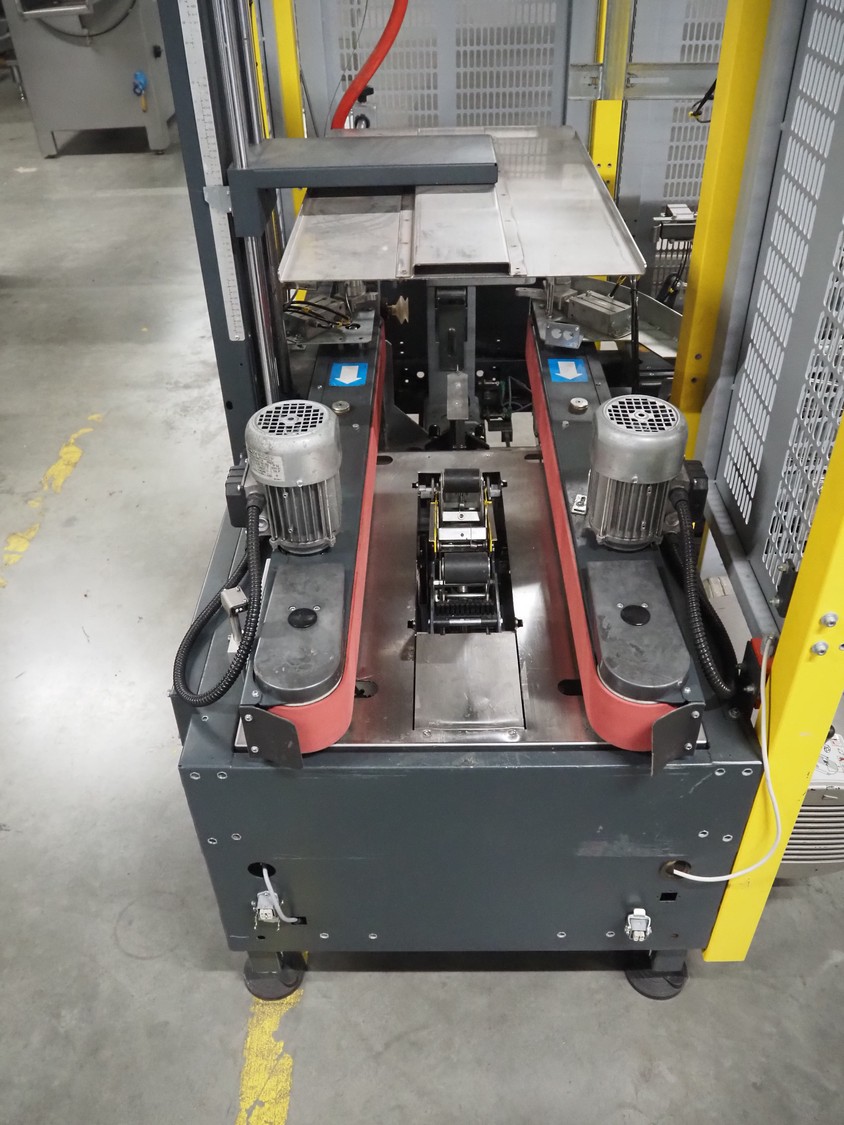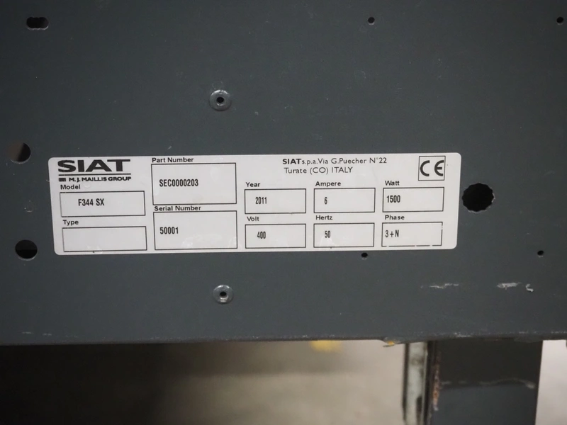 Siat box folding and closing machine, model: F344 SX, serial number: 50001, year of construction: 2011, 400 V, 3 Ph, 50 Hz, 6 A, 1500 W, Becker vacuum pump, infeed conveyor width: 690 mm, total dimensions: 2100 mm x 1750 mm x 2060 mm.