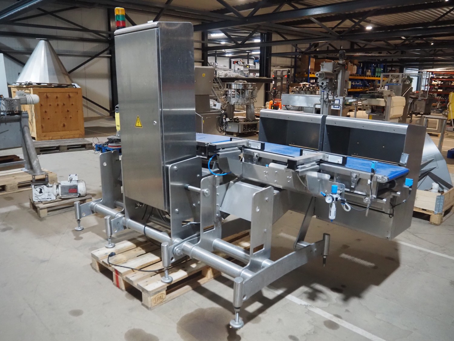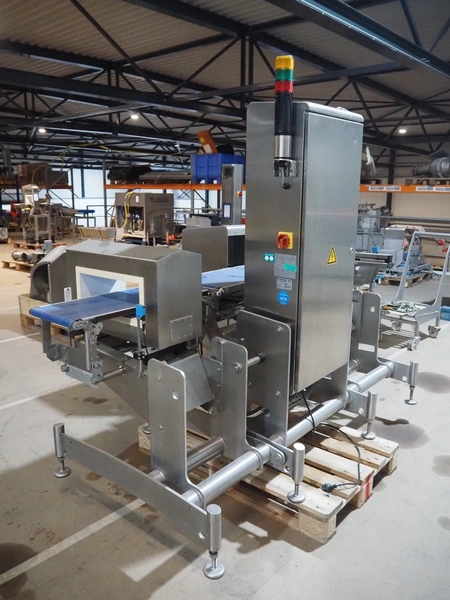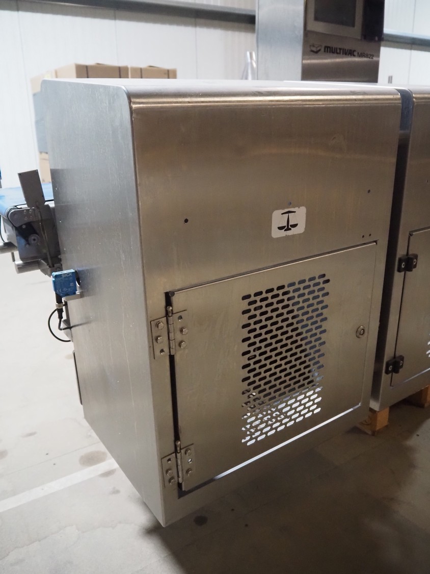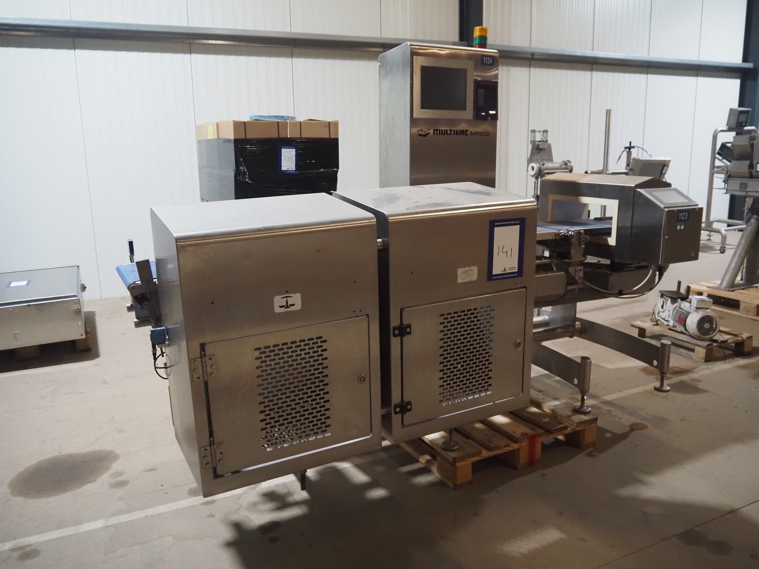 Multivac metal detector with checkweigher and 2 rejectors, metal detector type: GLS, serial number: 11406016720-H, 110/230 V, 50/60 Hz, 0.36/0.18 A, clearance: 400 mm x 100 mm, type Bizerba checkweigher: MR8, number: 10996651, 120/220/240 V, 50/60 Hz, 5.0/3.0 A, maximum capacity: 1500/3000 g, minimum capacity: 50 g, plastic belts, belt width: 300 mm, total dimensions: 2650 mm x 1350 mm x 1820 mm.