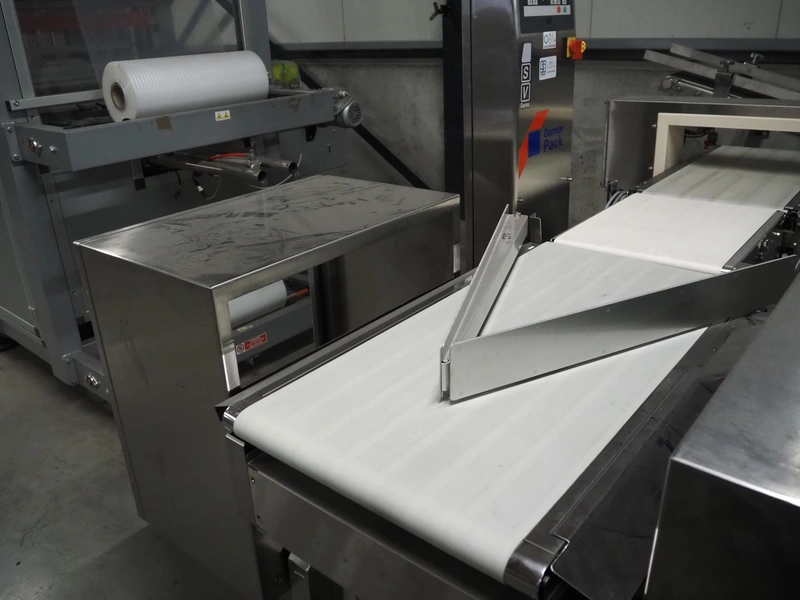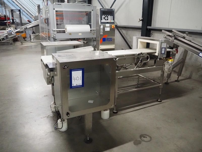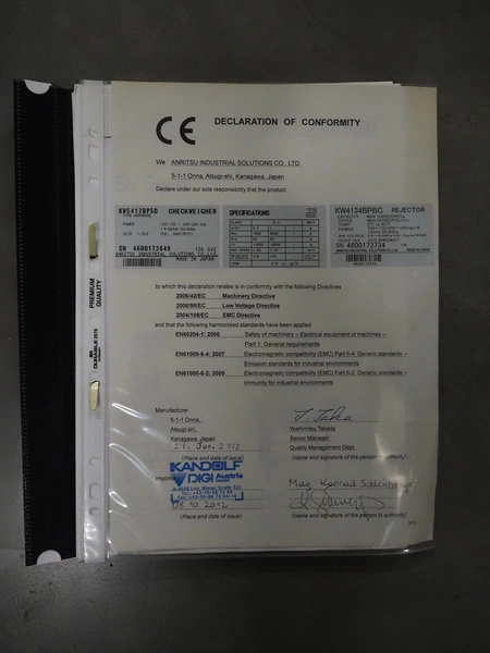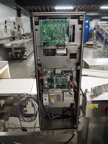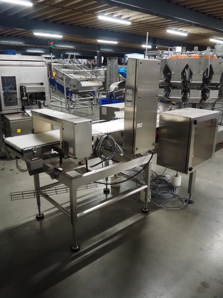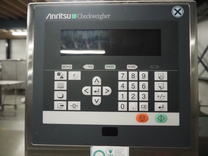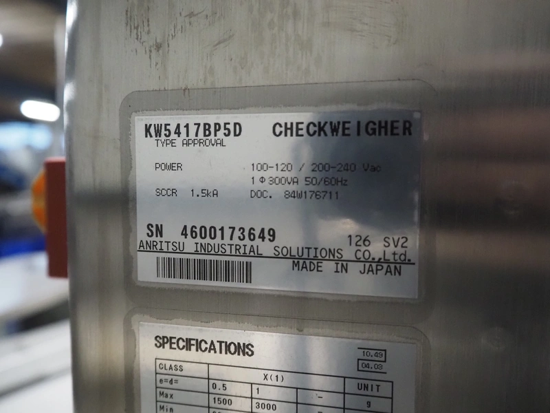 Anritsu checkweigher and metal detector with rejectors, type checkweigher: KW5417BP5D, serial number: 4600173649, year of construction: 2012, 100-120 / 200-240 Vac, 1 Ph, 50/60 Hz, maximum weight: 1500 / 3000 gram, minimum weight: 20 gram, e=d= 0.5 / 1 gram, T = -1500 / -3000 gram, type metal detector: KD1125AW, serial number: 4600162333, plastic belt, belt width: 350 mm, clearance: 450 mm x 130 mm, total dimensions: 2250 mm x 1450 mm x 1550 mm.