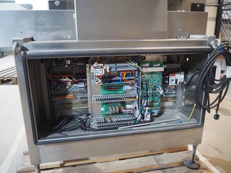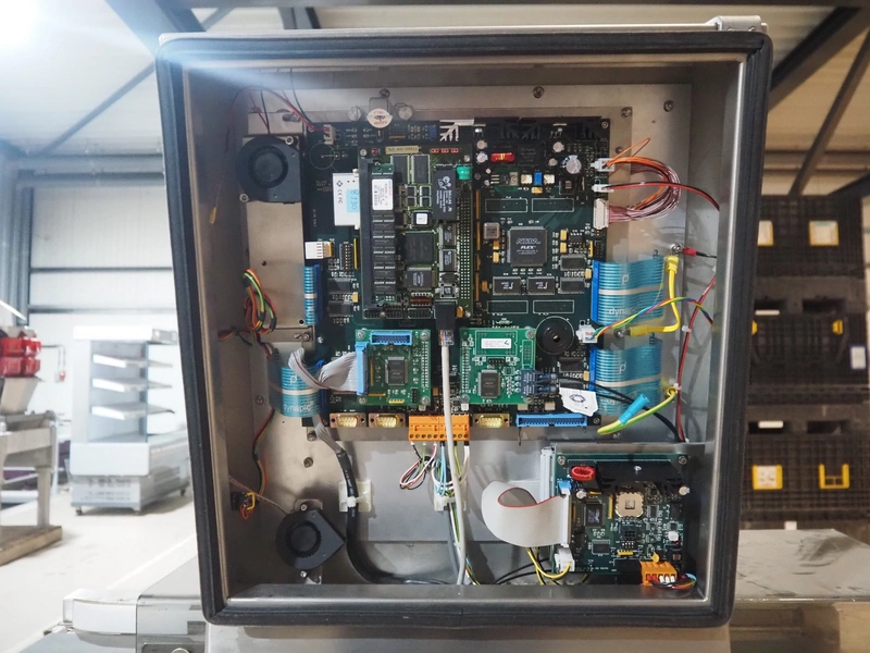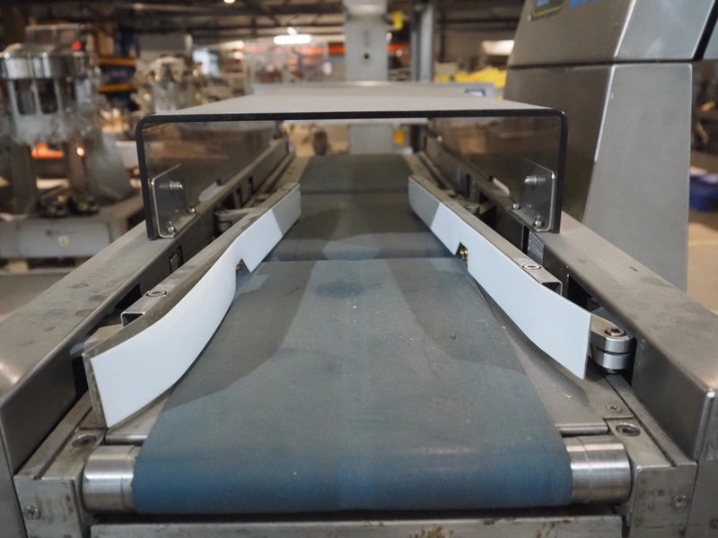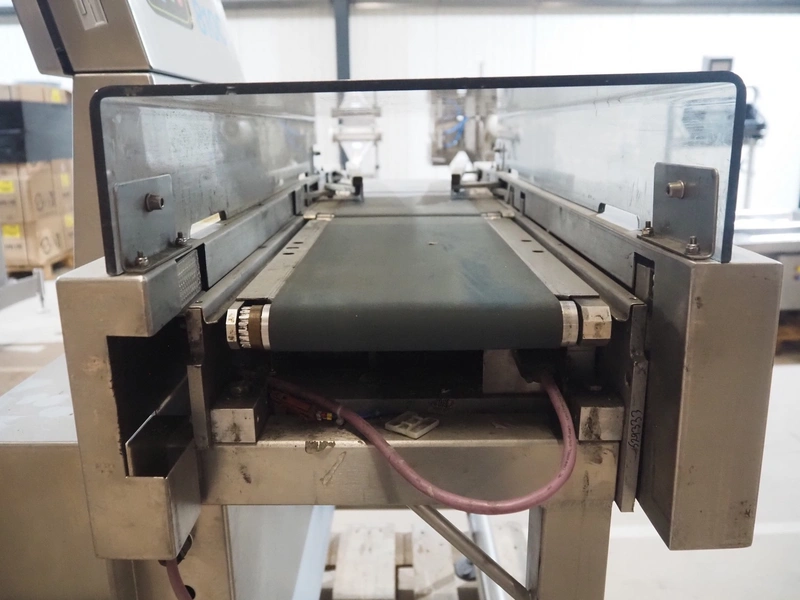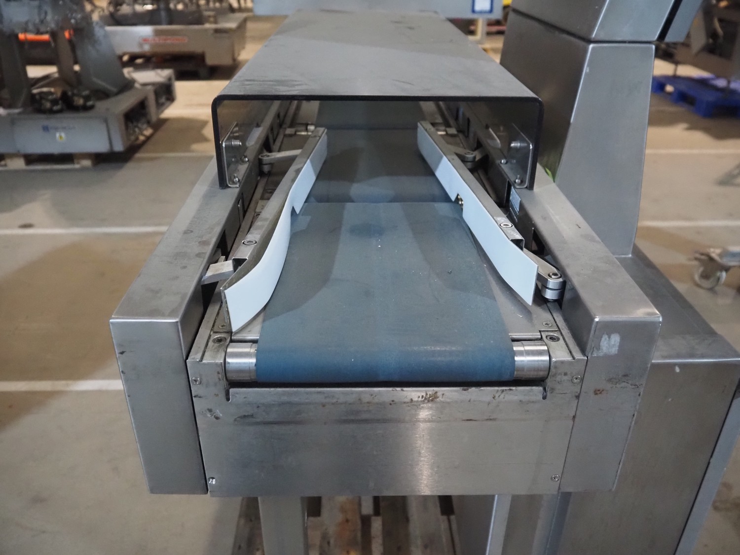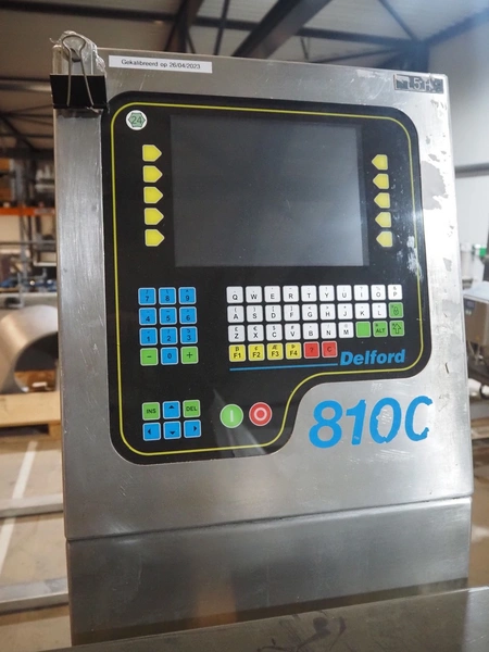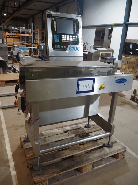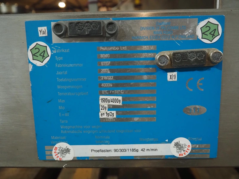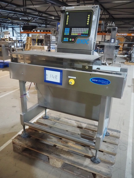 AEW Delford checkweigher with rejector, type: 8060, factory number: 81107, year of construction: 2005, 230 V, 50 Hz, maximum capacity: 1500/4000 g, minimum capacity: 20 g, e= 1/2 g, plastic belt, belt width: 200 mm, total dimensions: 1200 mm x 650 mm x 1550 mm.