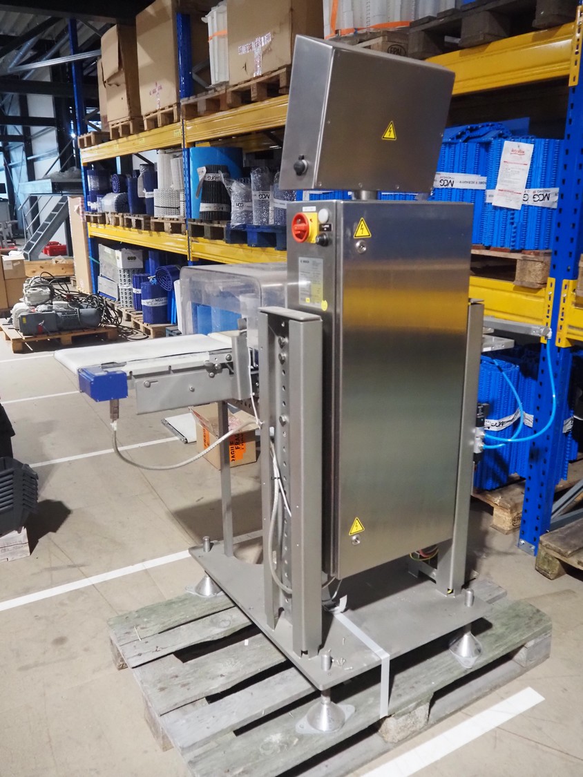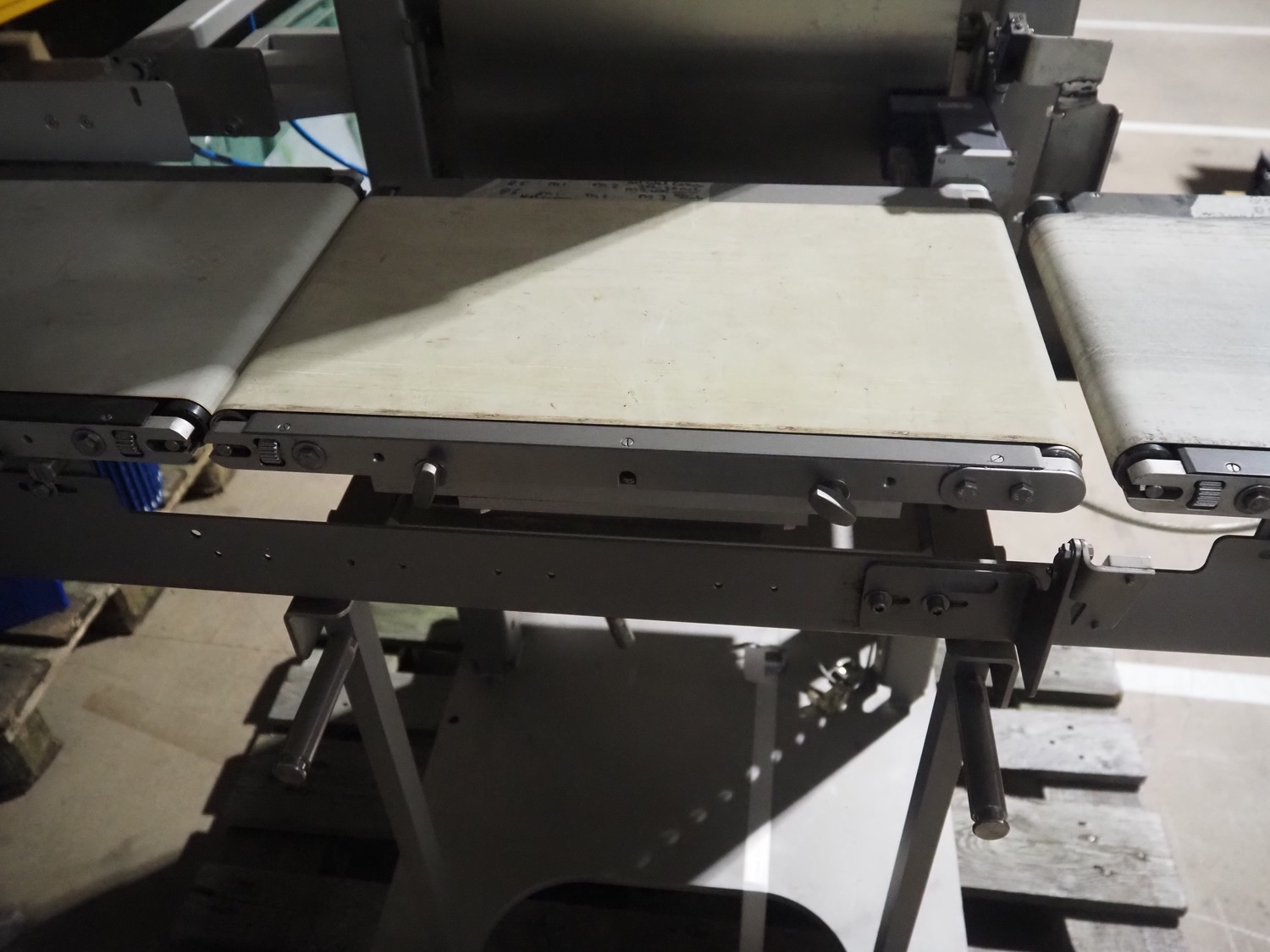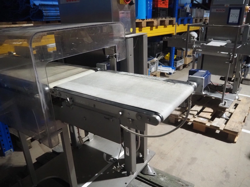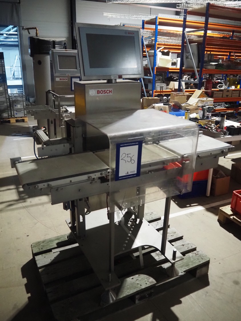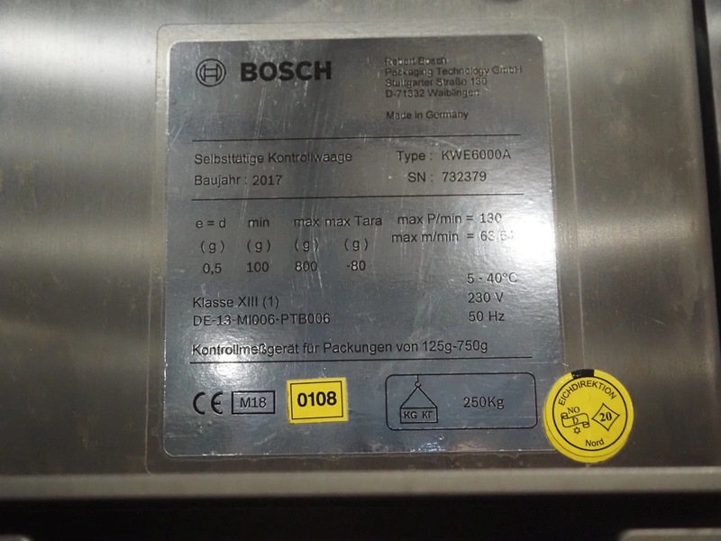 Bosch checkweigher, type: KWE 6000 A, serial number: 732379, year of construction: 2017, 230 V, 50 Hz, 24 VDC, max: 800 gram, min: 100 gram, e= 0.5 gram, plastic belt, belt width: 250 mm, total dimensions: 1200 mm x 800 mm x 1700 mm.