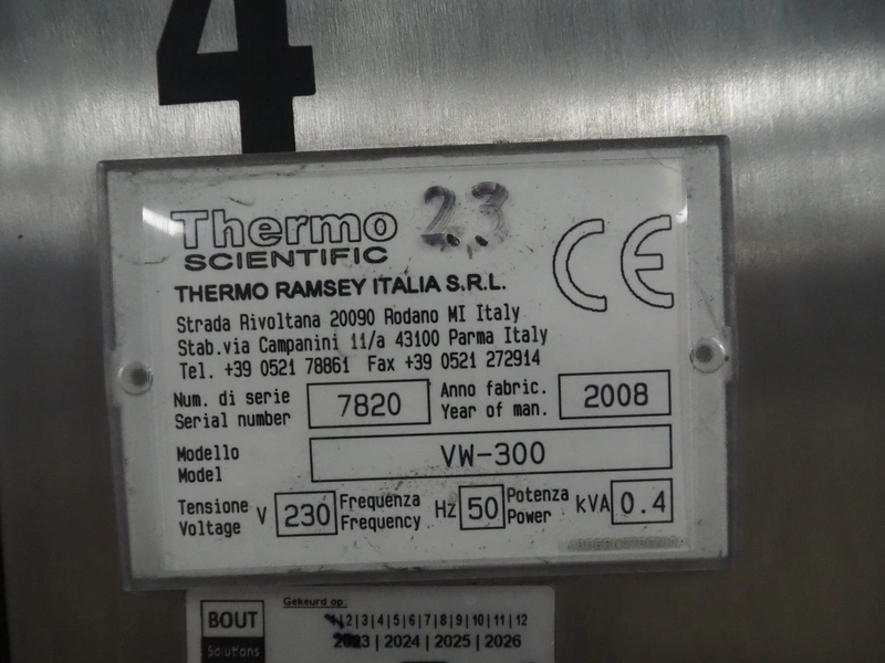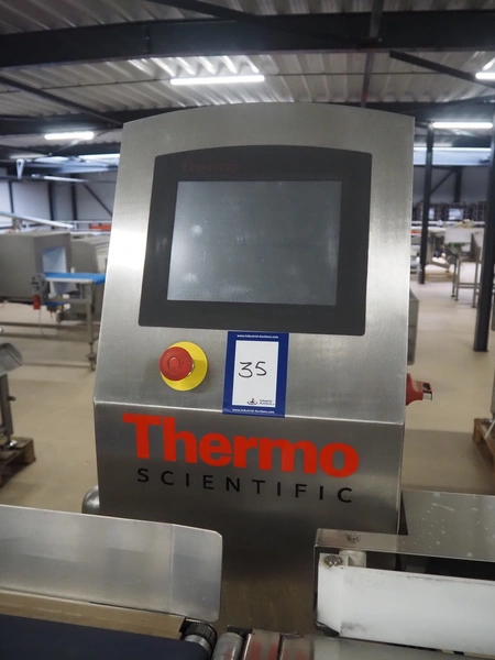 Thermo Scientific checkweigher, model: VersaWeigh, serial number: 7820, year of construction: 2008, 230 V, 50-60 Hz, minimum weight: 350 gram, maximum weight: 12000 gram, e=d= 5 gram, plastic belt, belt width: 290 mm, total dimensions: 1230 mm x 900 mm x 1550 mm. Technical condition unknown.