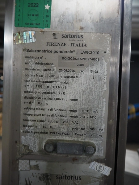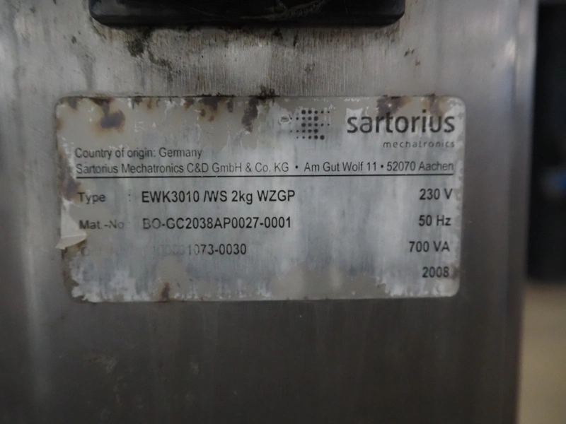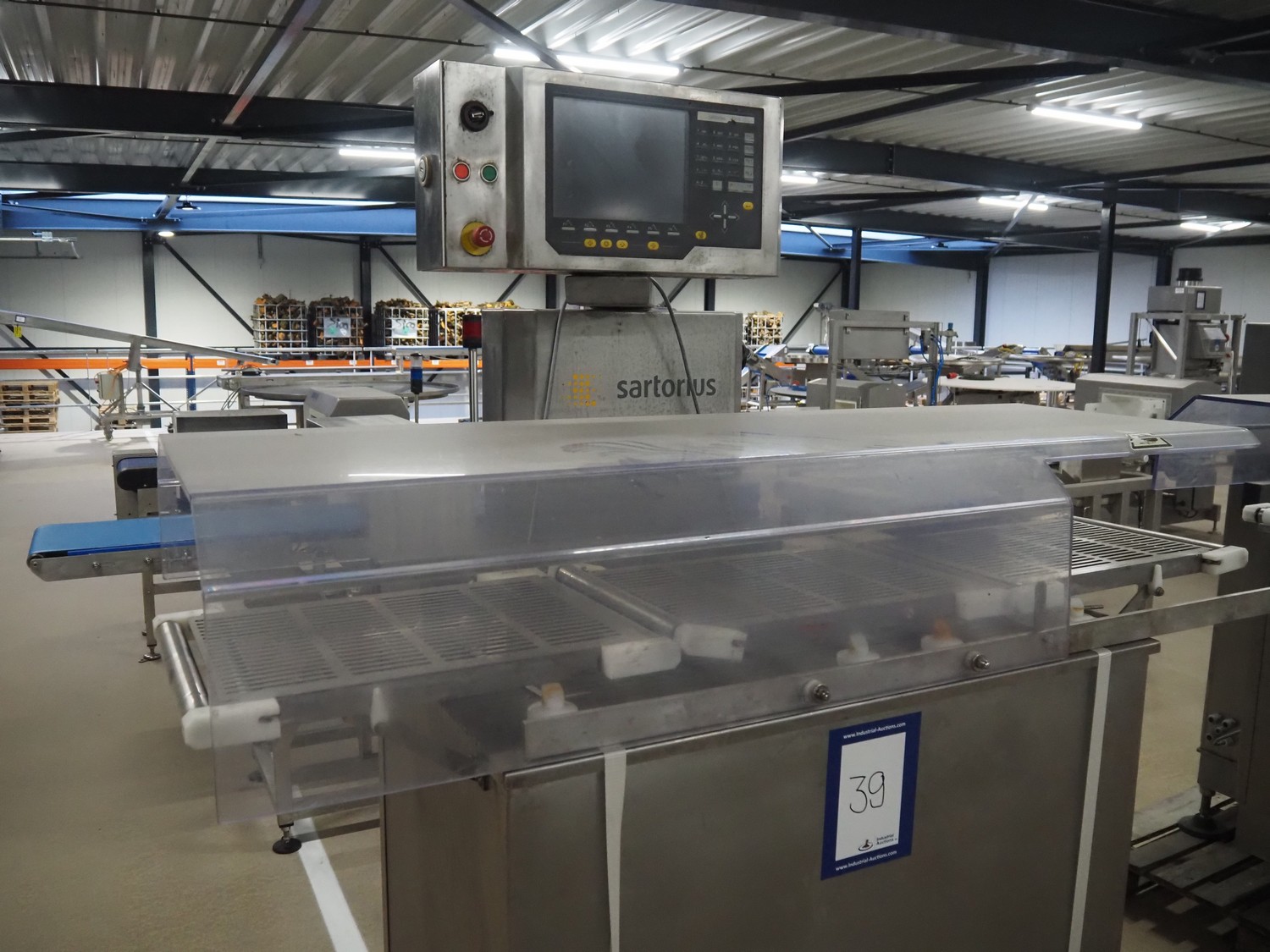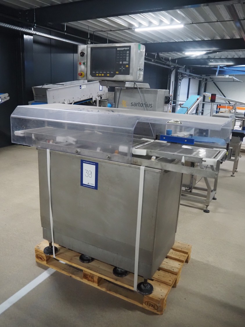 Sartorius checkweigher with rejector, type: EWK3010, number: BO-GC2038AP0027-001, year of construction: 2008, 230 V, 50 Hz, 700 vA, e=d= 0.2 gram, belt width: 300 mm, total dimensions: 1600 mm x 900 mm x 1700 mm. Missing belt.