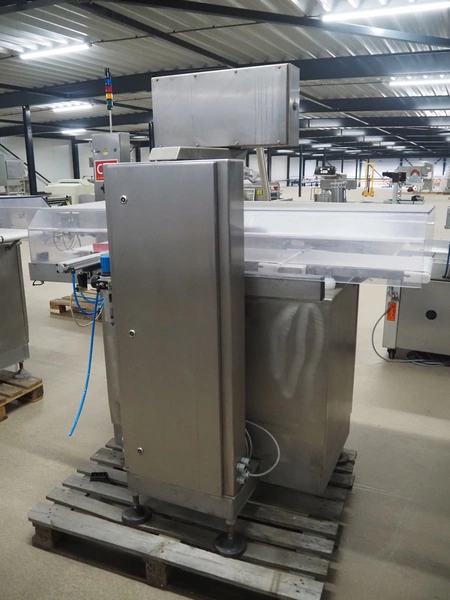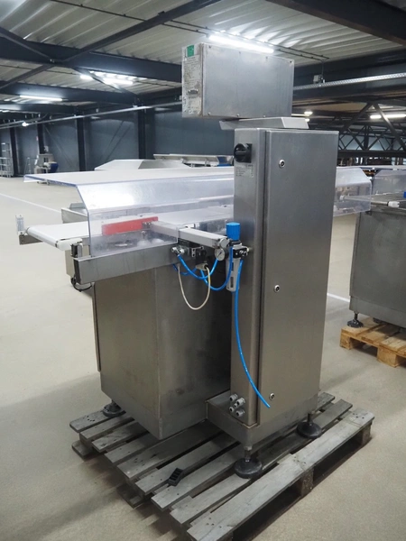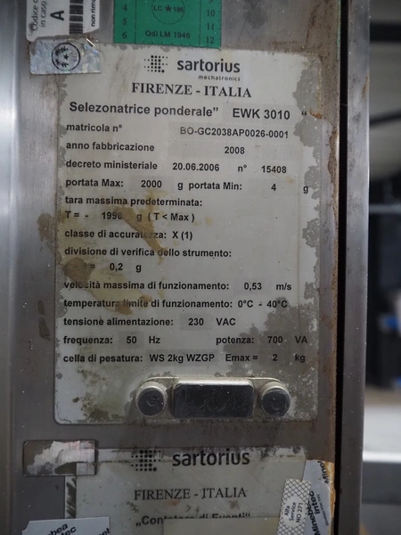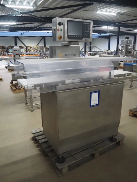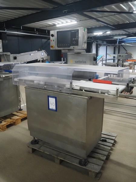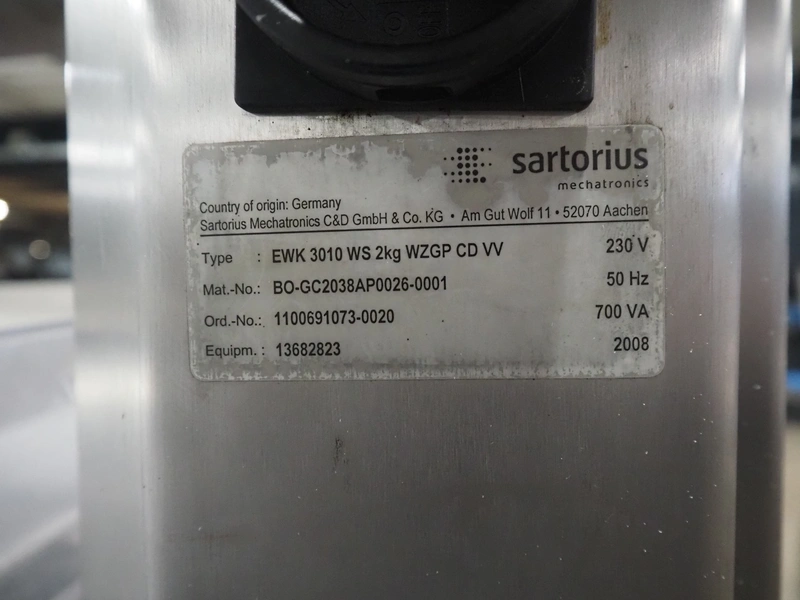 Sartorius checkweigher with rejector, type: EWK3010, number: BO-GC2038AP0026-001, year of construction: 2008, 230 V, 50 Hz, 700 vA, e=d= 0.2 gram, plastic belt, belt width: 300 mm, total dimensions: 1600 mm x 900 mm x 1700 mm.