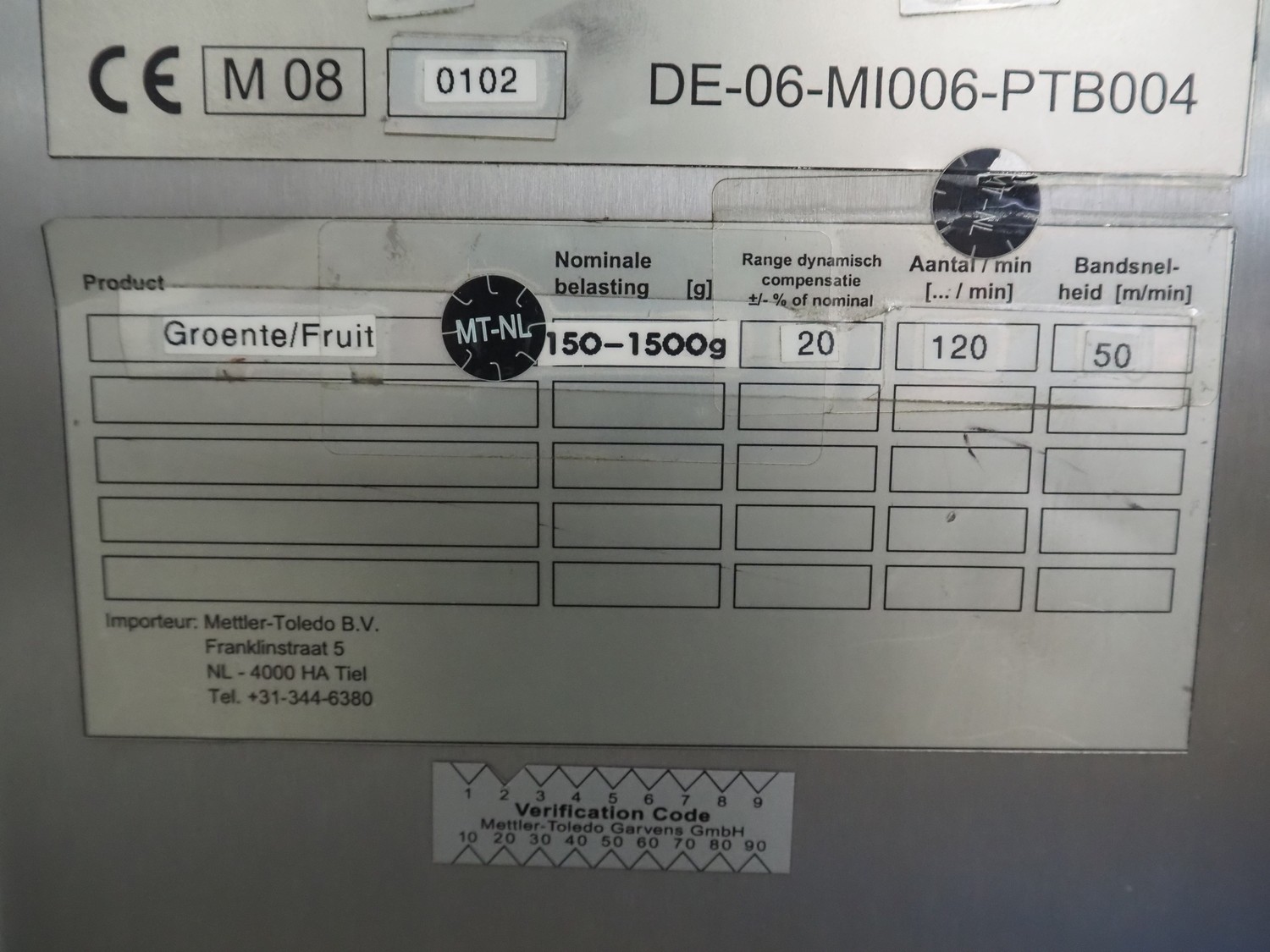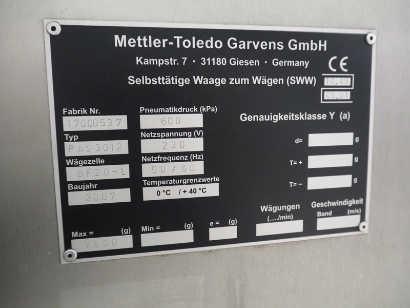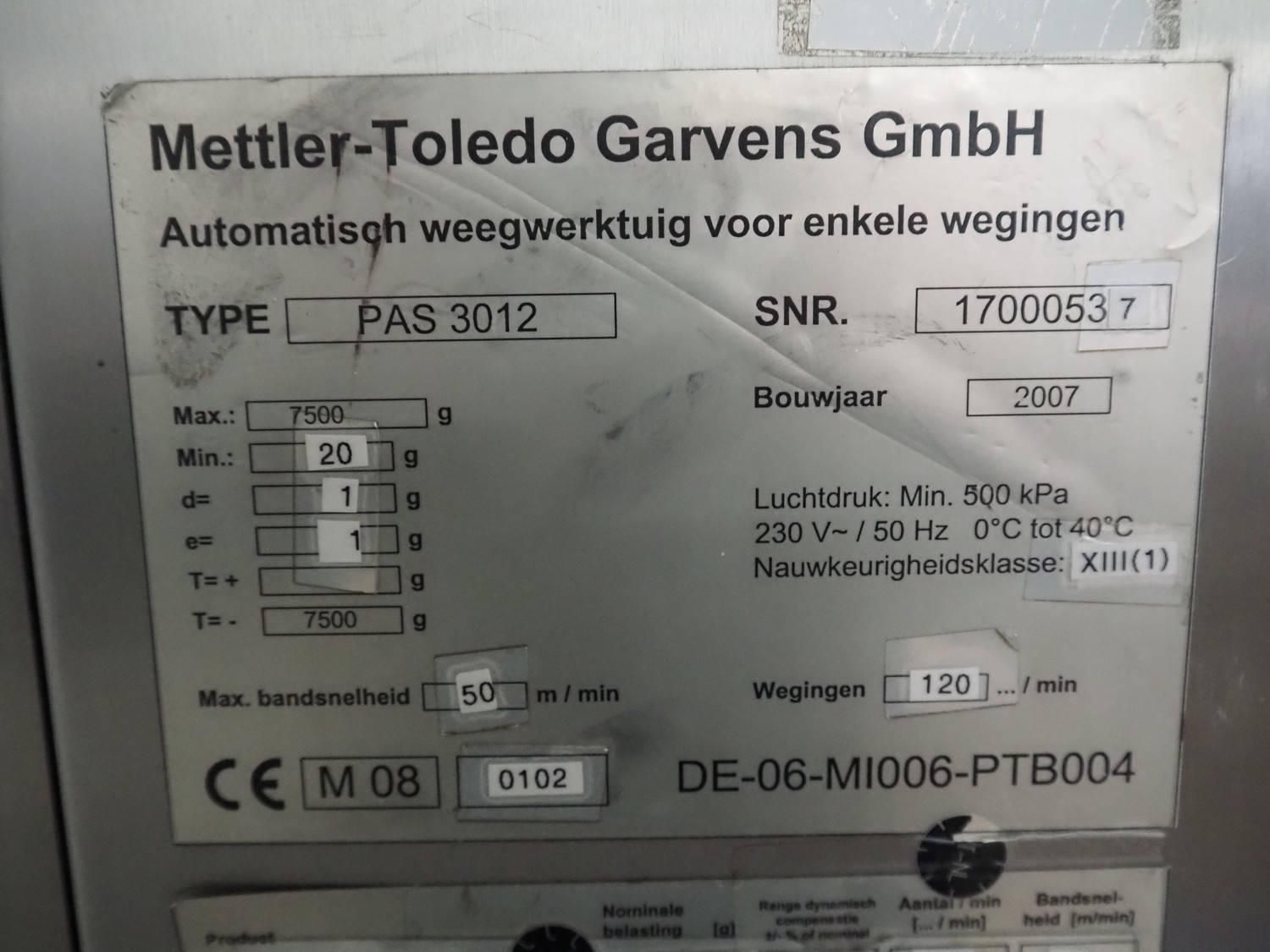 Mettler Toledo Garvens checkweigher with rejector, type: PAS3012, number: 17000537, year of construction: 2007, 230 V, 50/60 Hz, 600 kPa, maximum: 7500 gram, plastic belt, belt width: 300 mm, total dimensions: 1750 mm x 1000 mm x 1850 mm.