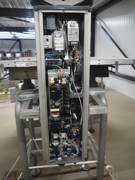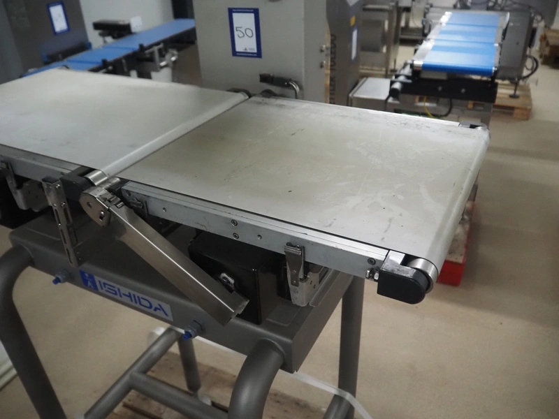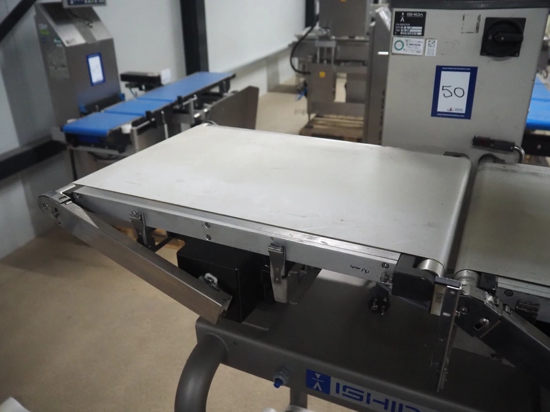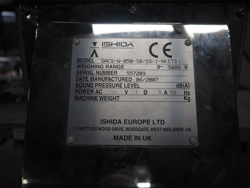 Ishida checkweigher , model: DACS-W-050-SB/SS-I-N(CTS), serial number: 557289, year of construction: 06/2007, 230 V, 1 Ph, 50 Hz, 3 A, maximum weighing range: 5000 gram, plastic belt, belt width: 370 mm, total dimensions: 1100 mm x 800 mm x 1800 mm.