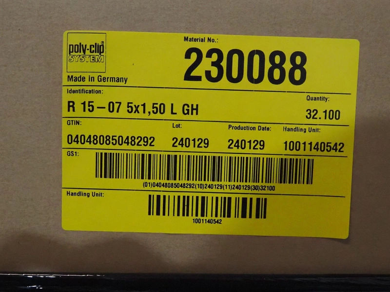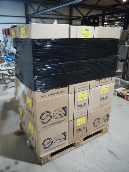 Pallet with Poly-Clip System clips, clip type: R 15-07 5x1.50 L GH, 32100 clips per box, 24 boxes, dimensions: 1200 mm x 800 mm x 1570 mm.