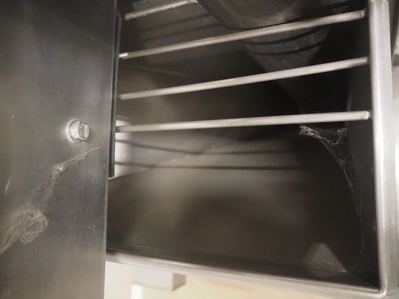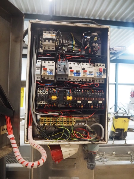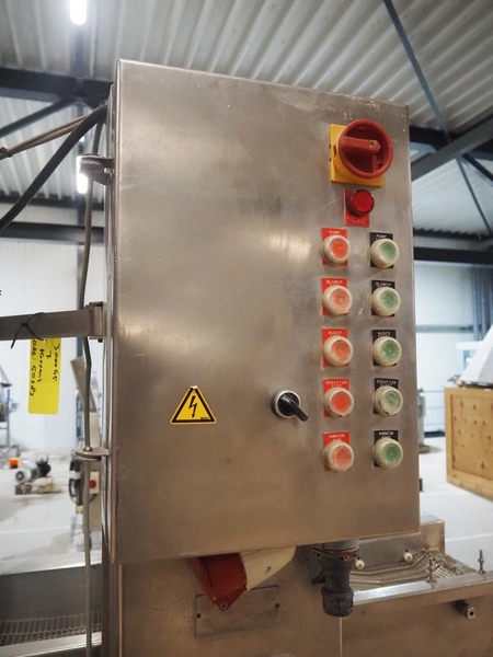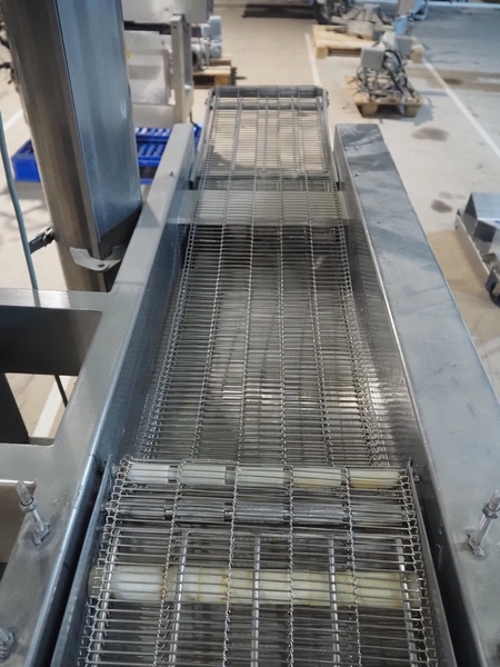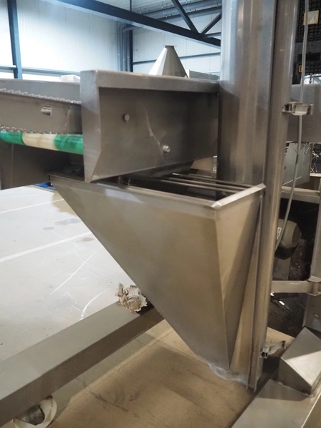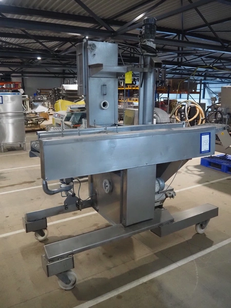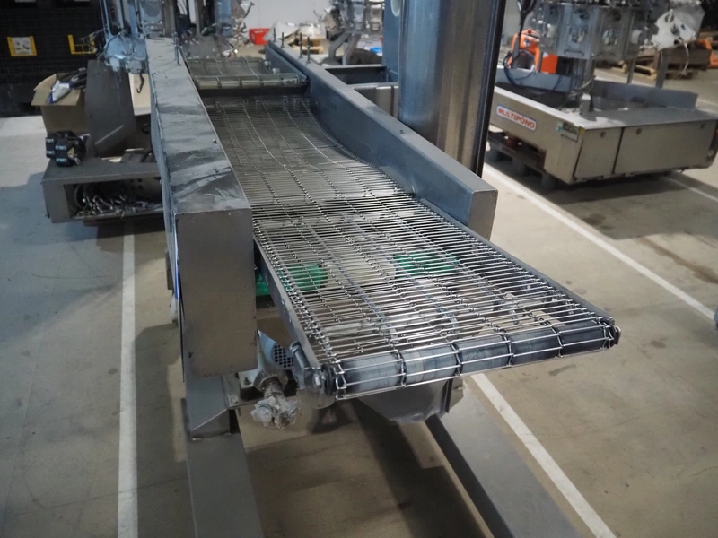 Mobile coating machine, s/s mesh belt, belt width: 300 mm, total dimensions: 2100 mm x 900 mm x 2230 mm. Incomplete.