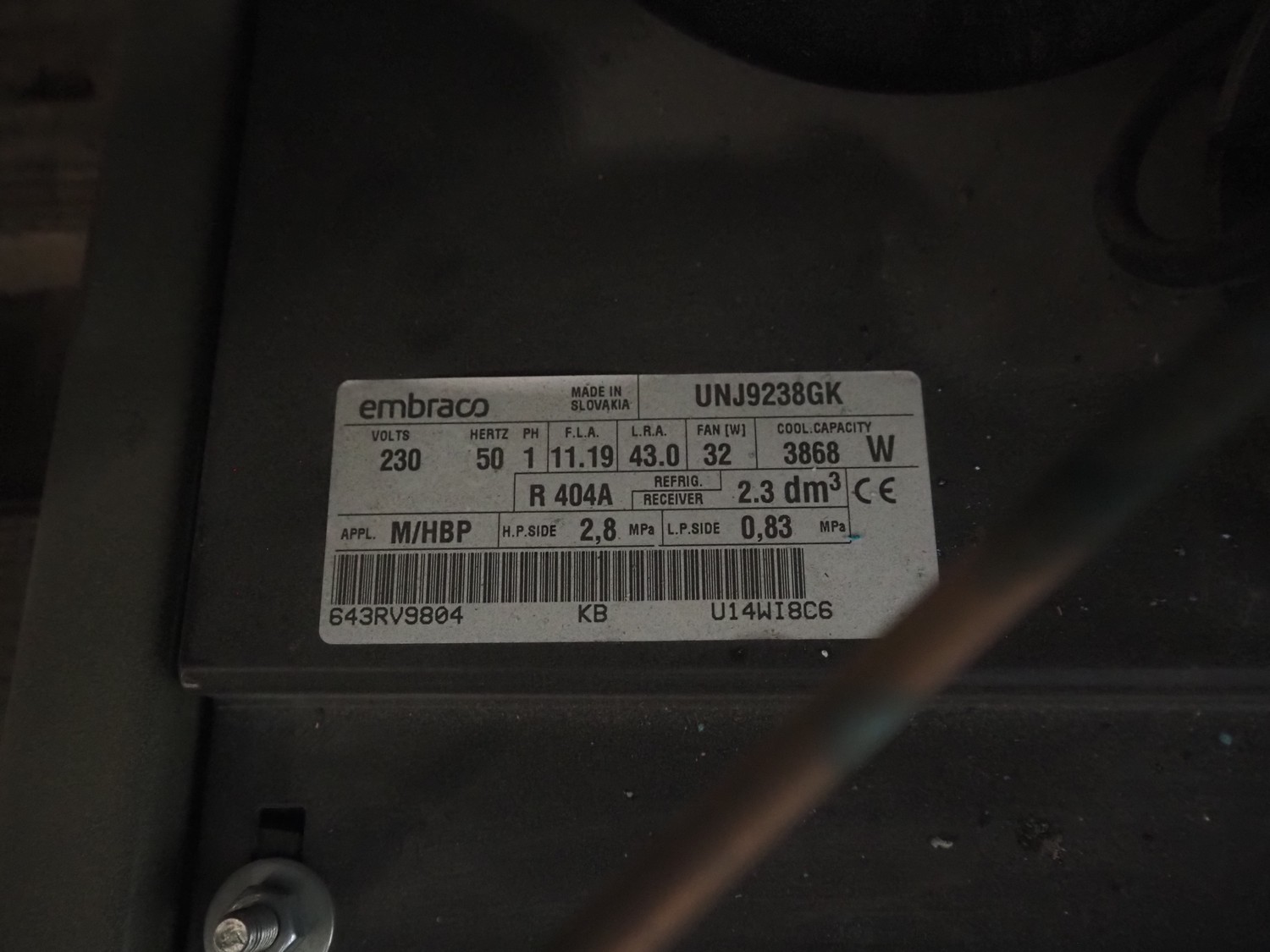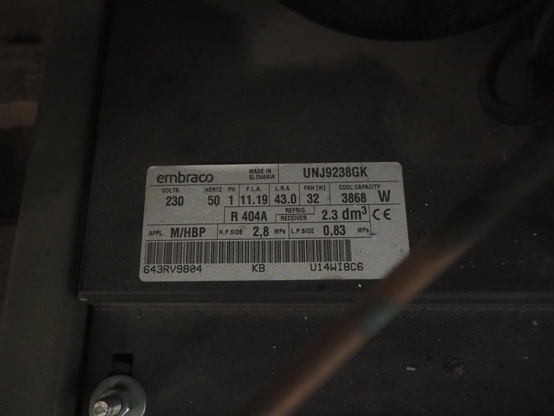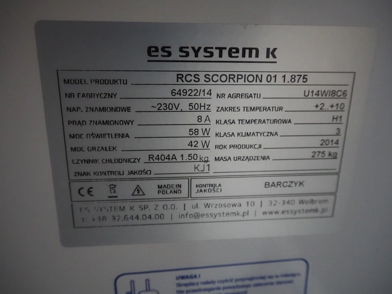 Refrigeration showcase, model: RCS SCORPION 01 1.875, number: 64922/14, 230 V, 50 Hz, 8 A, 42/58 W, dimensions: 900 mm x 2000 mm x 2050 mm.