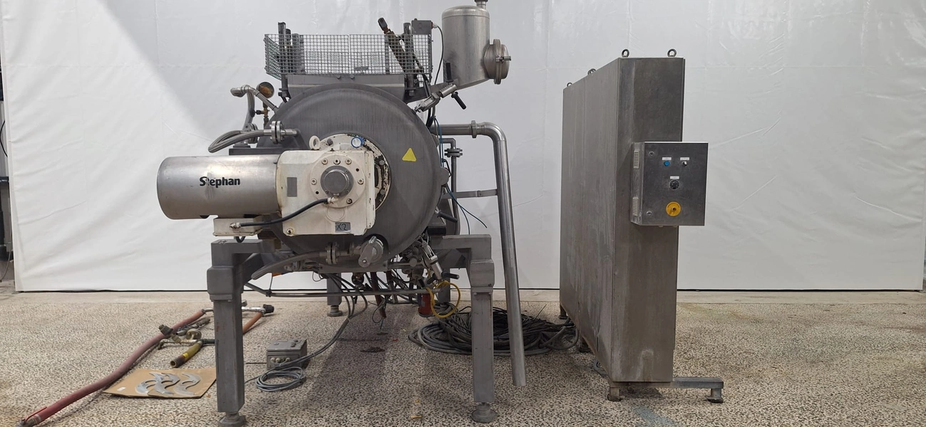 Stephan Combicut cheese processing machine, type: TC 300, machine number: 716.815, number: 2878172, year of construction: 1990, 380 V, 3 Ph, 50 Hz, 67 kW, 123 A, dimensions: 3500 mm x 1800 mm x 2400 mm. Including s/s switch cabinet, dimensions: 2350 mm x 700 mm x 2200 mm.