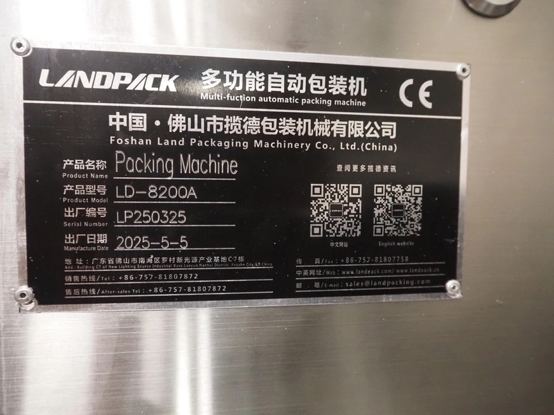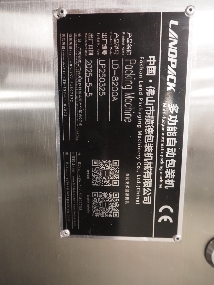 Landpack pouch filling machine, model: :D-8200A, serial number: LP250325, year of construction: 2025-5-5, plastic belt, belt width: 260 mm, dimensions: 2550 mm x 2000 mm x 1500 mm.