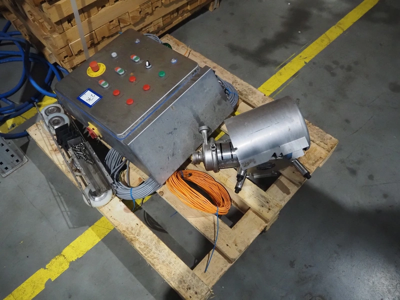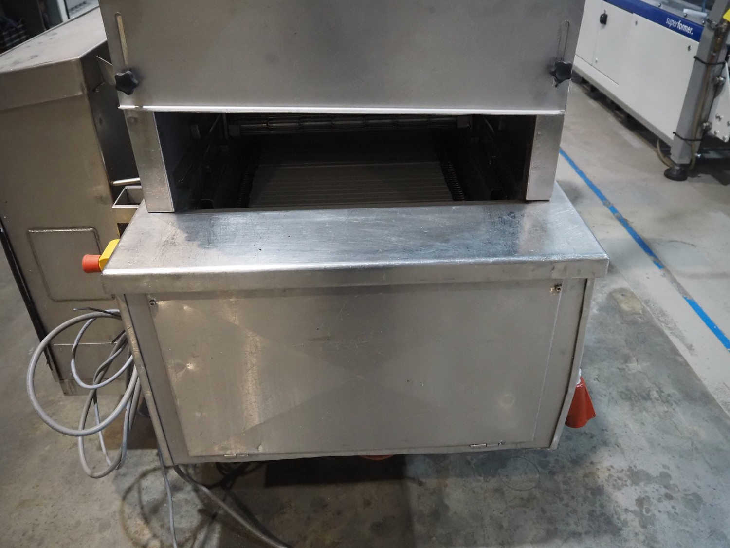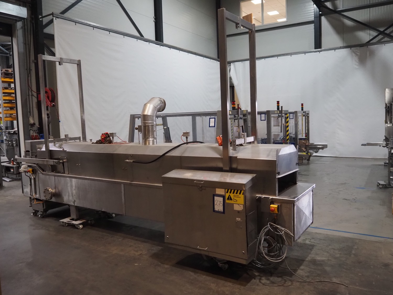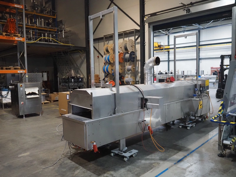 Koppens belt fryer, s/s mesh belt, belt width: 600 mm, total dimensions: 5500 mm x 1400 mm x 2950 mm. With Buls system and s/s frame with 2 silos for oil and pallet with switch cabinet and hoists, without rollies.