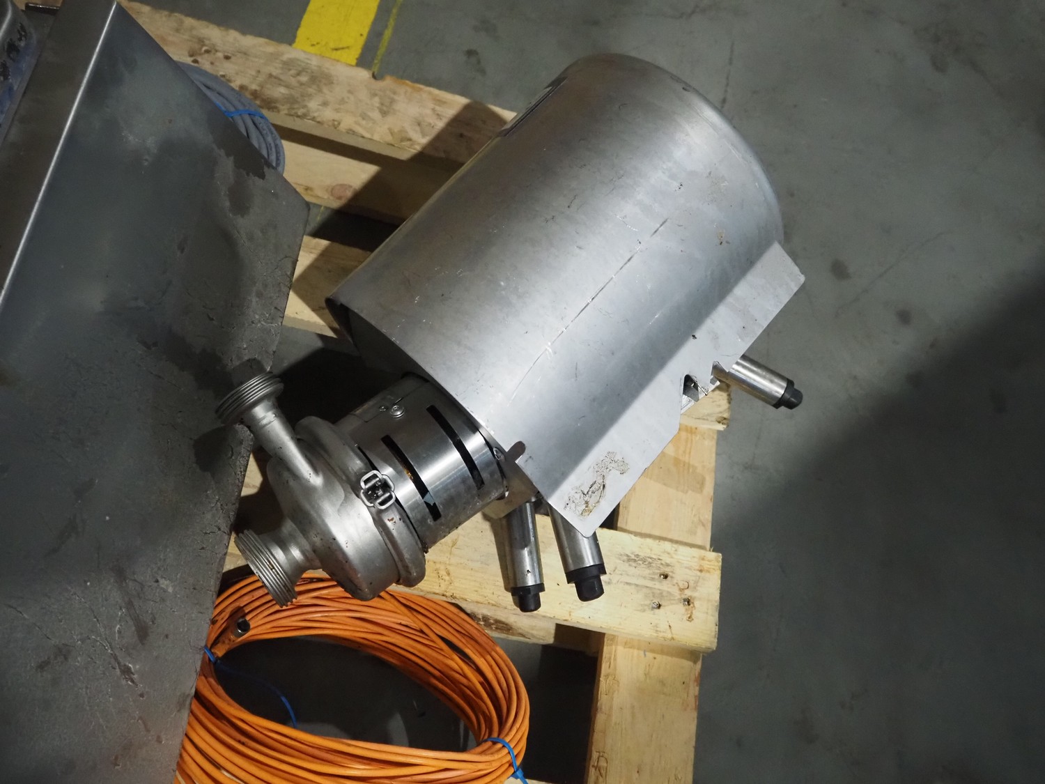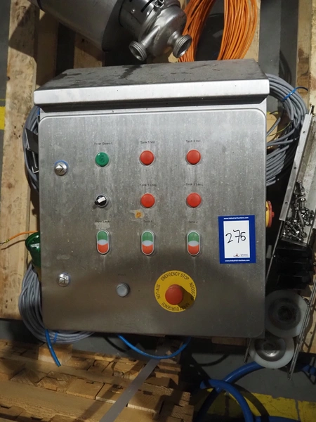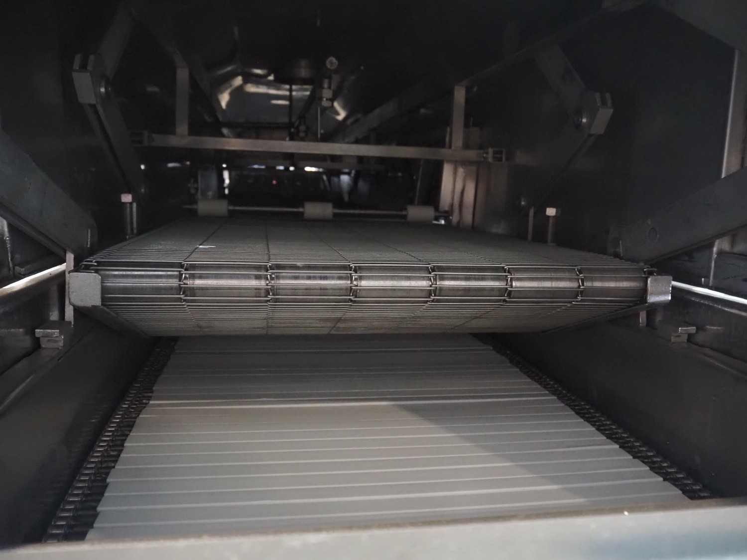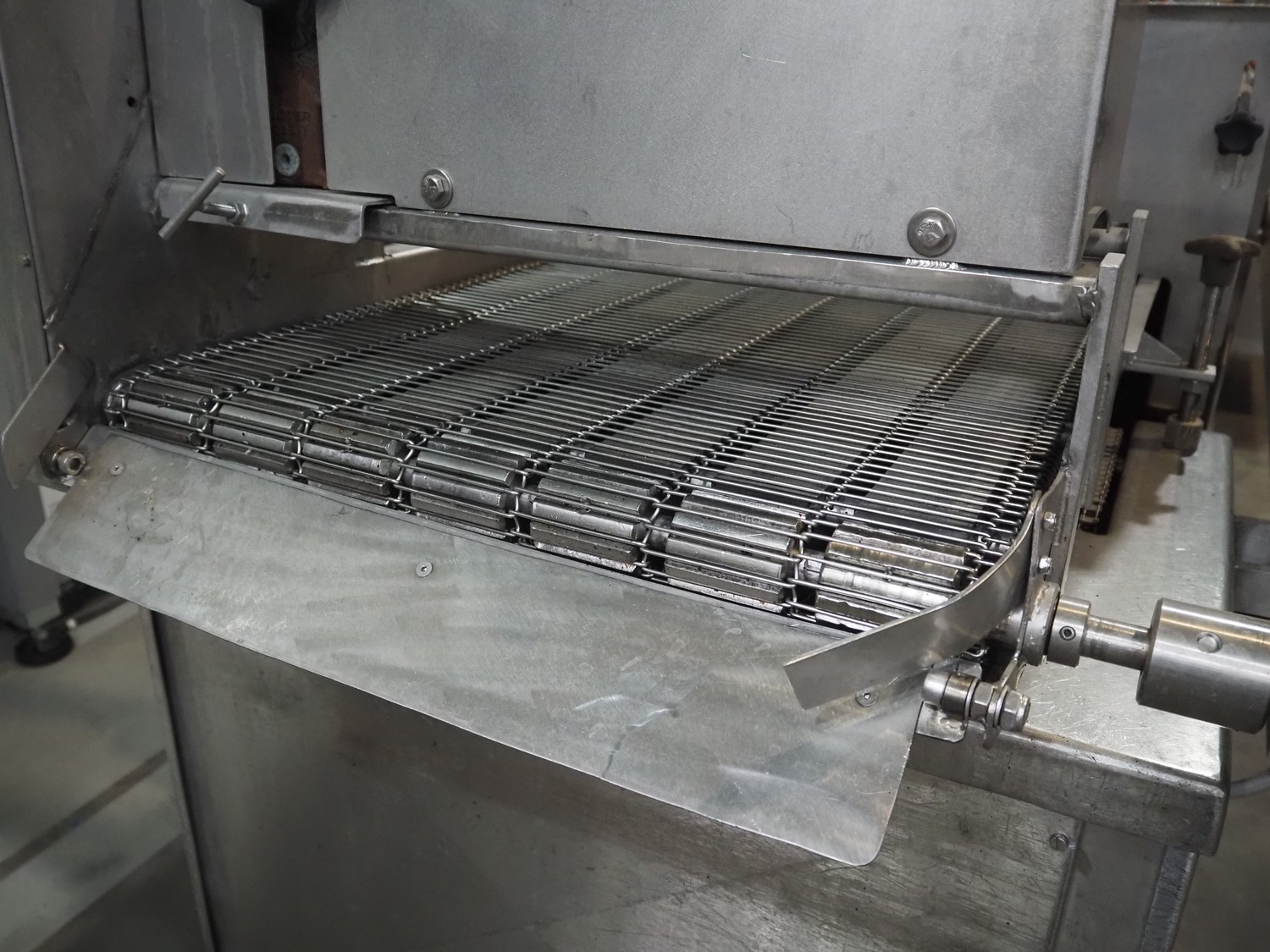 Koppens belt fryer, s/s mesh belt, belt width: 600 mm, total dimensions: 5500 mm x 1400 mm x 2950 mm. With Buls system and s/s frame with 2 silos for oil and pallet with switch cabinet and hoists, without rollies.