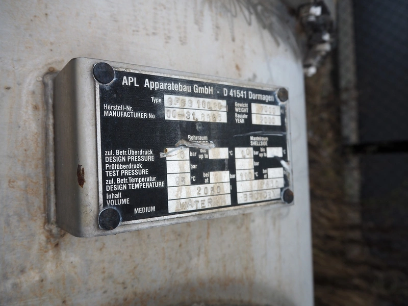 APL Apparatebau GmbH tubular heat exchanger, type: GFGG 100.80-I, manufacturing number: 00-31.6606, year of construction: 2000, volume: 2050 liter, 7000 kg, dimensions: 9400 mm x 2000 mm x 2000 mm.