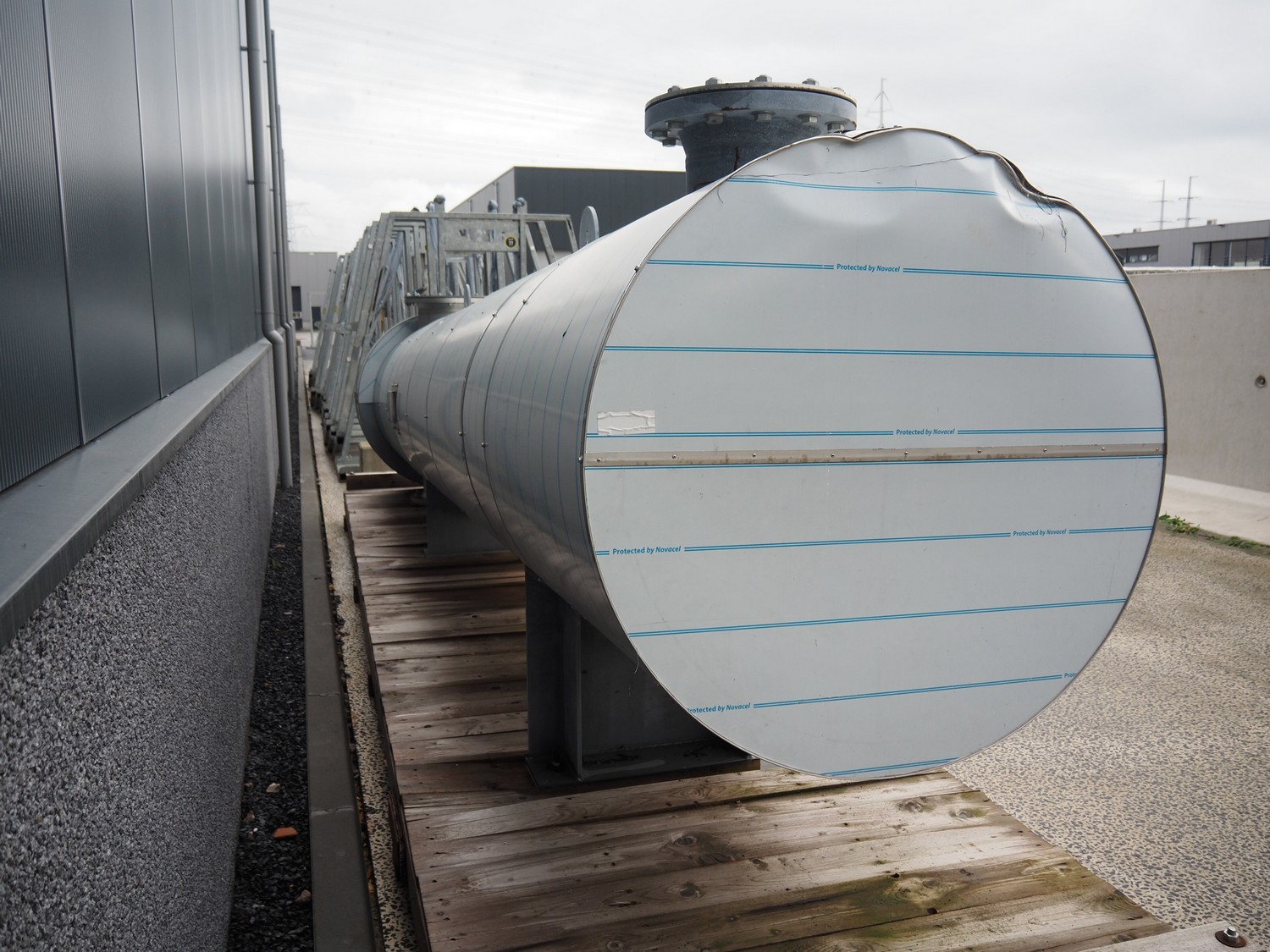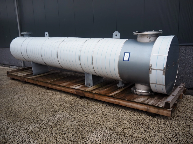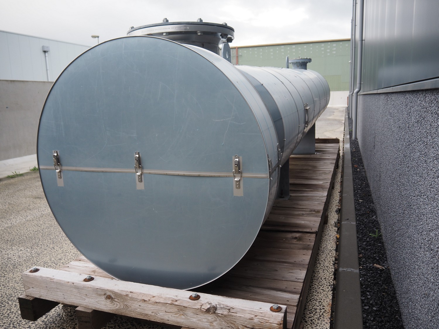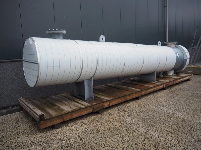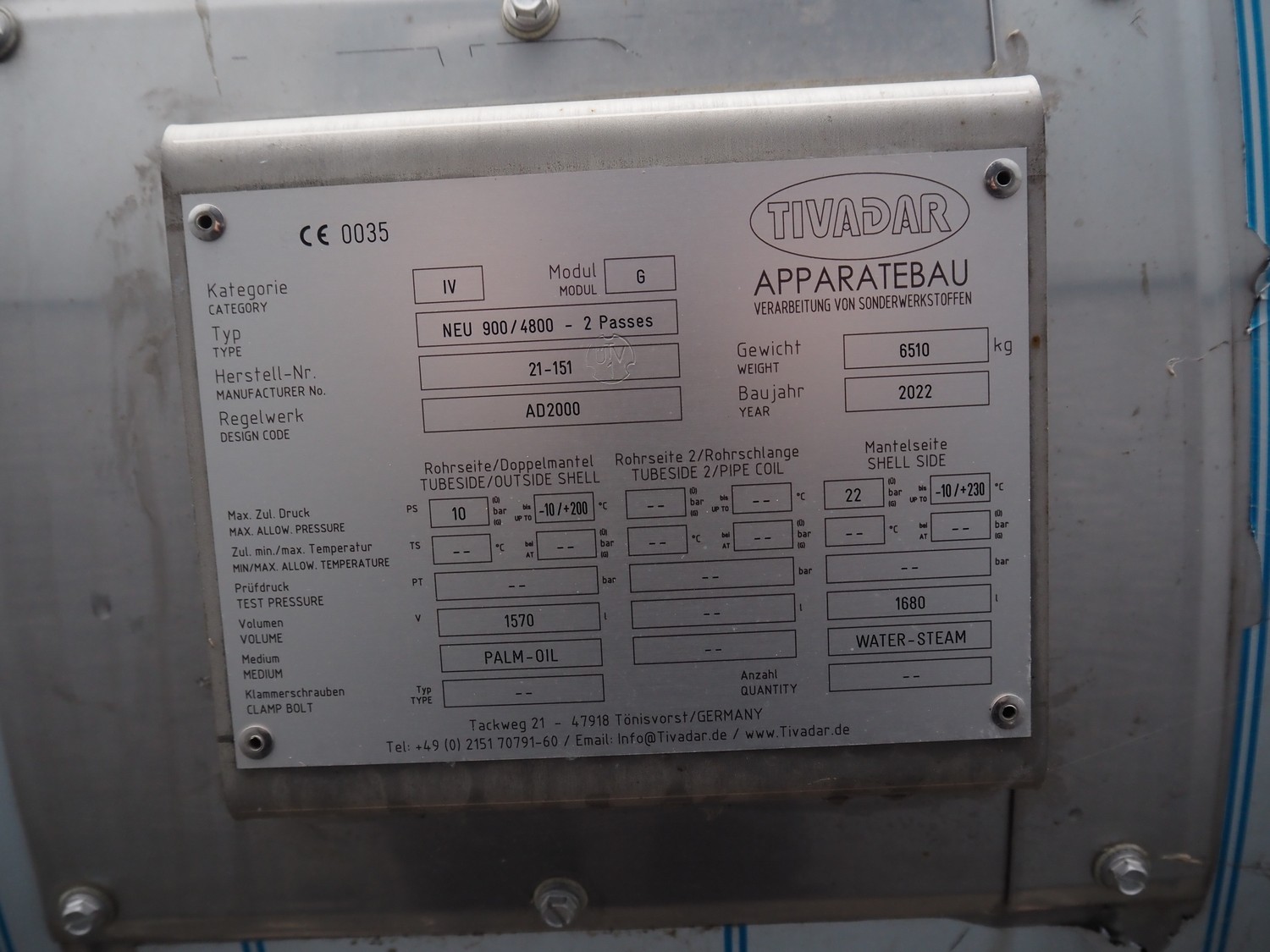 Tivadar Apparatebau tubular heat exchanger used for Palm Oil, type: NEU 900/4800 - 2 Passes, serial number: 21-151, year of construction: 2022, volume: 1680 litres, weight: 6510 kg, steam heated, dimensions: 6500 mm x 1300 mm x 1750 mm.