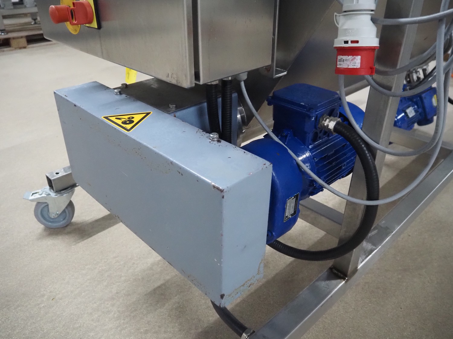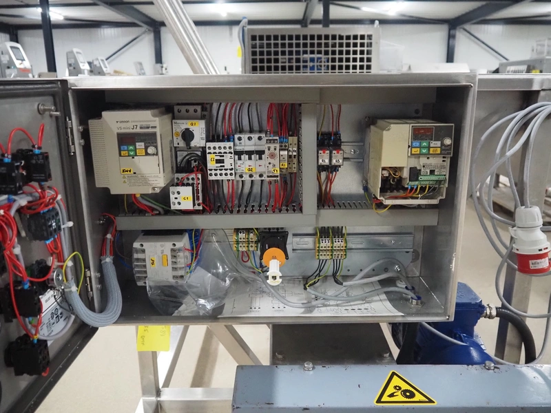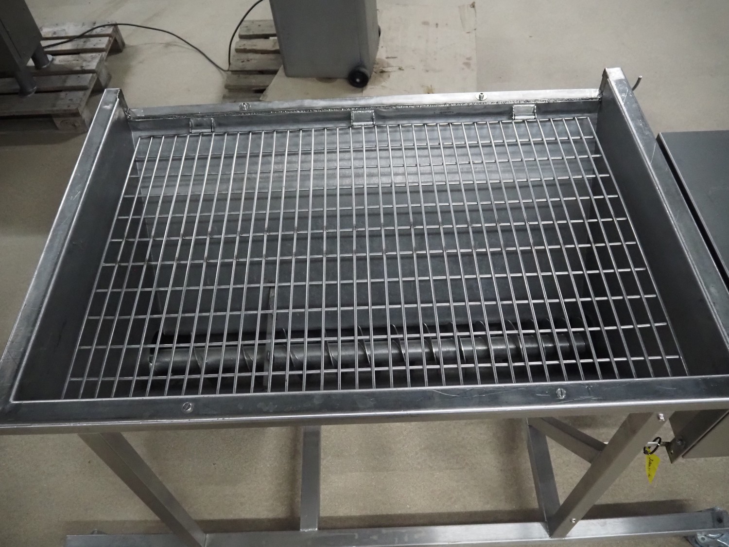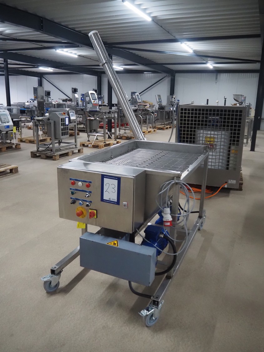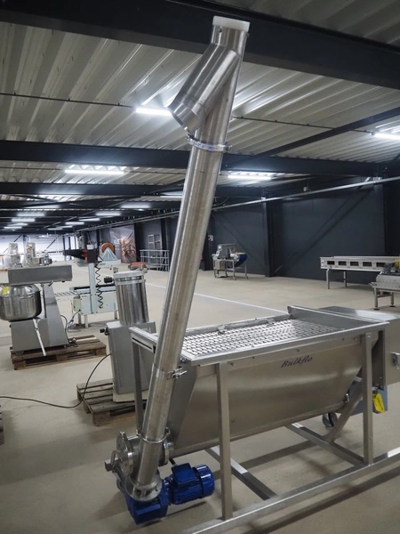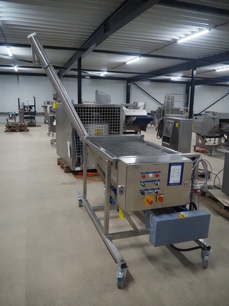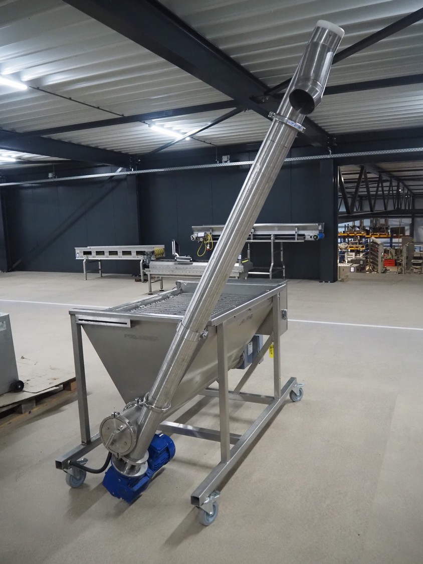 Guttridge mobile infeed bunker with outfeed screw, number: 322445, year of construction: 08/07, clearance: 1200 mm x 800 mm x 800 mm, elevating height: 1900 mm, total dimensions: 1800 mm x 1600 mm x 2300 mm.