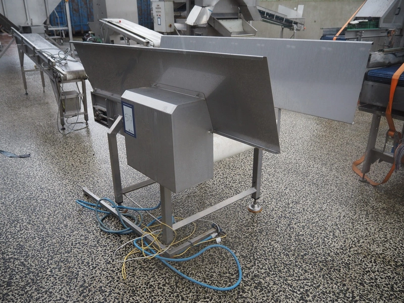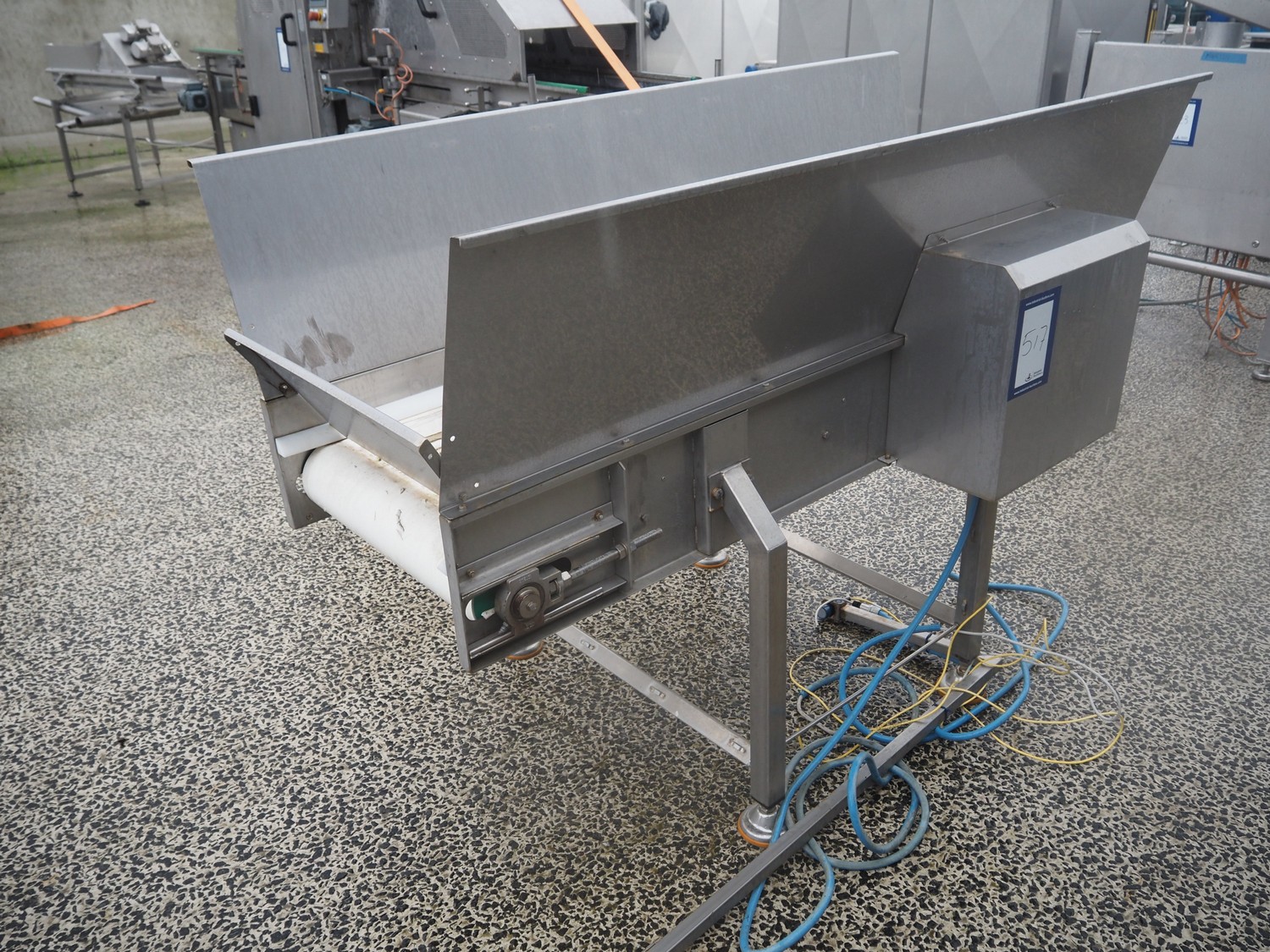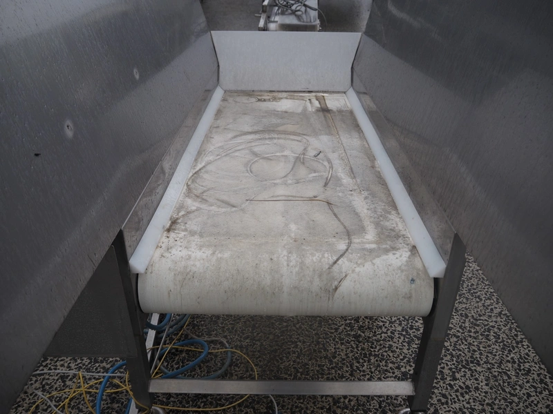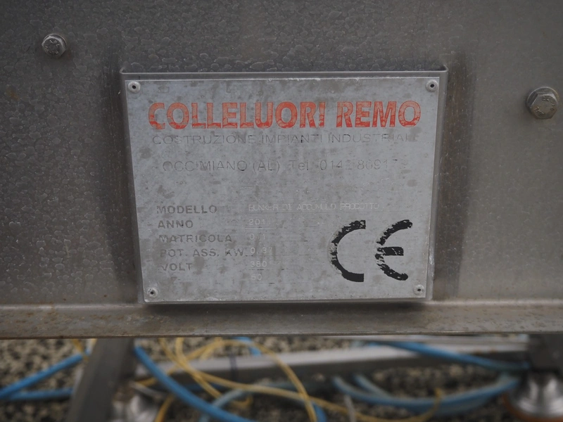 Colleluori Remo infeed bunker, model: BUNKER DI ACCUMULO PRODOTTO, machine number: 011, year of construction: 2011, 380 V, 50 Hz, 0.37 kW, plastic belt, belt width: 600 mm, total dimensions: 2050 mm x 910 mm x 1370 mm.