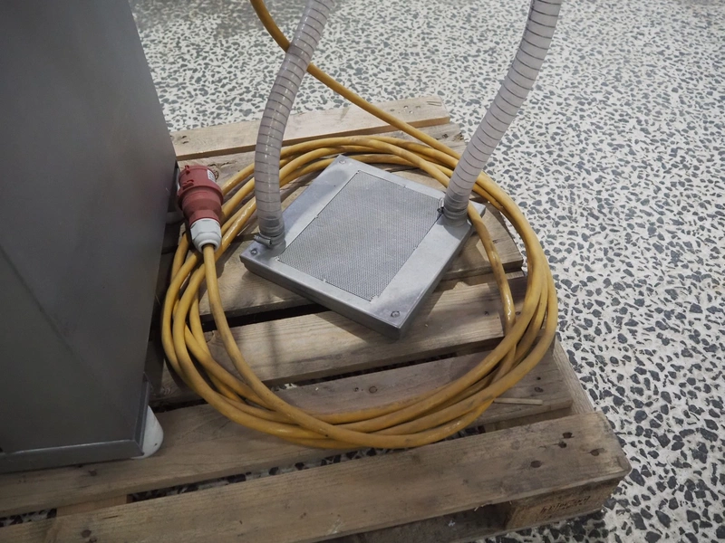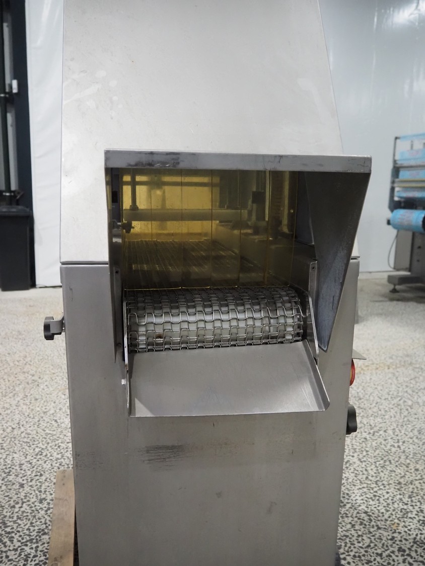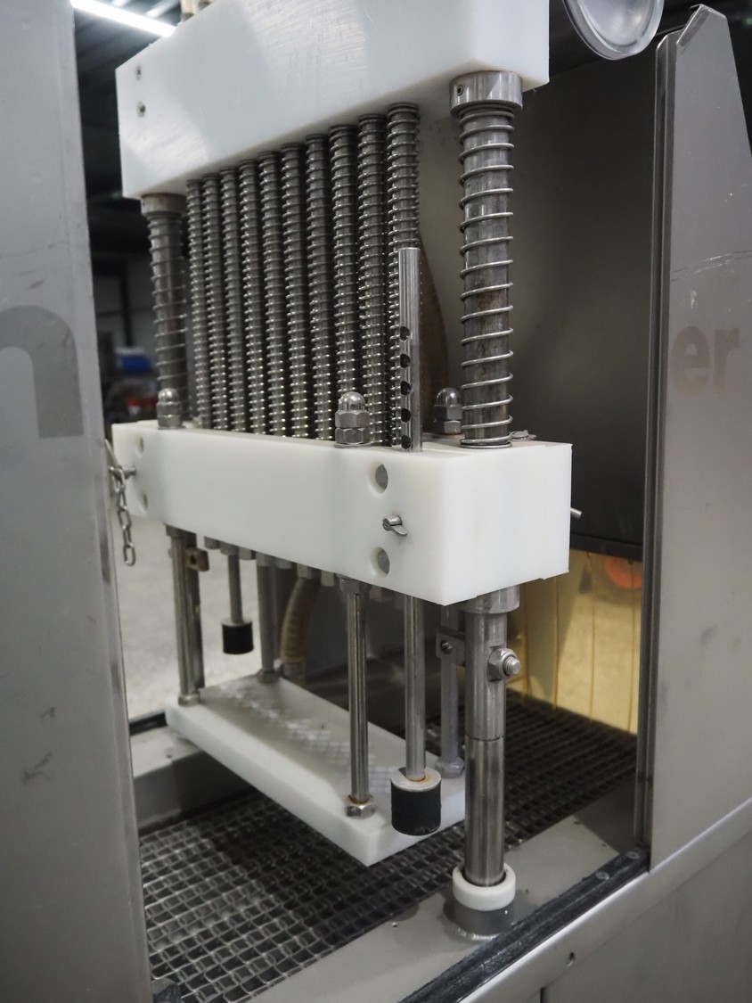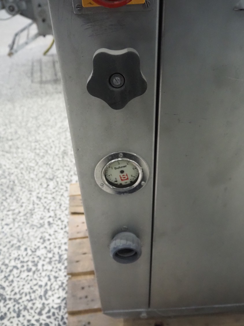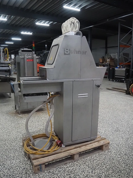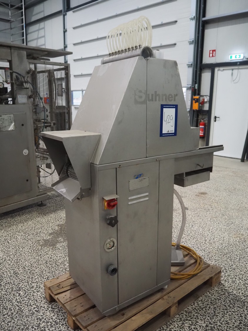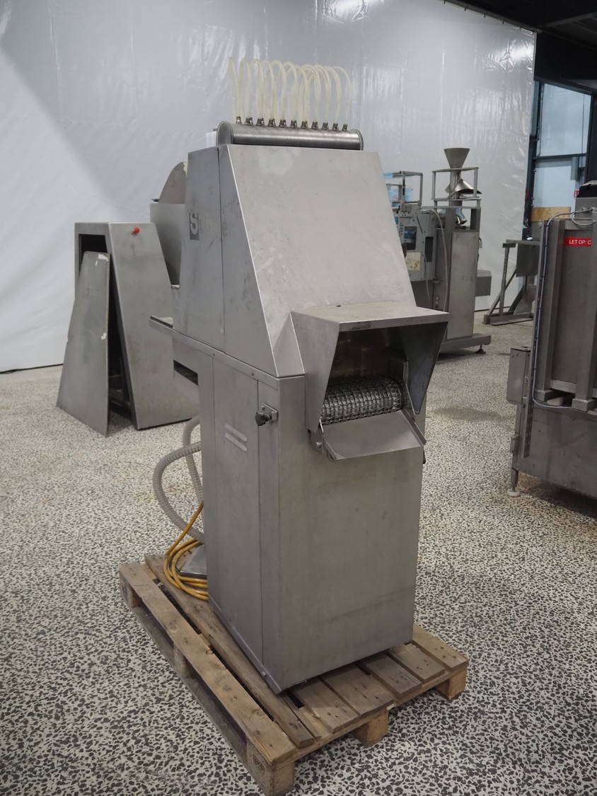 Suhner AG injector, type: WS 80 F, number: 9680203, 400 V, 50 Hz, 3.5 A, 1.1 kW, 80 needles, s/s mesh belt, belt width: 285 mm, total dimensions: 1300 mm x 500 mm x 1820 mm. Missing needles.