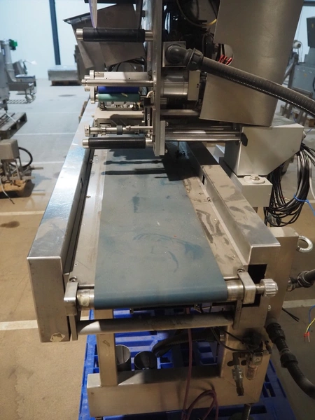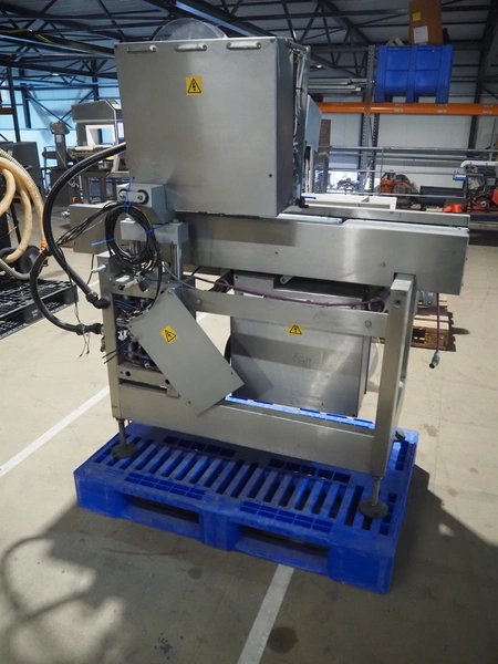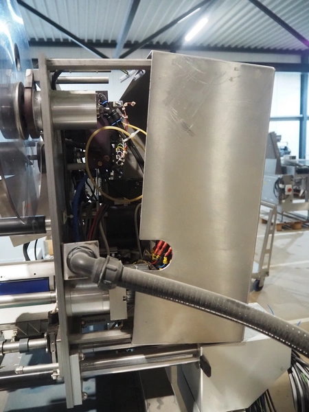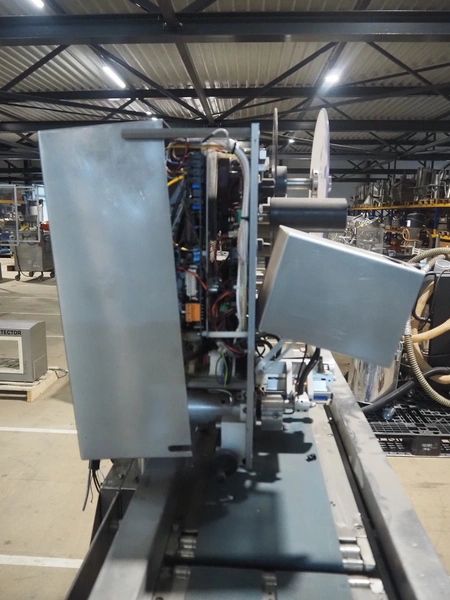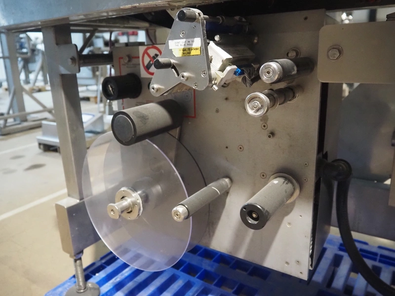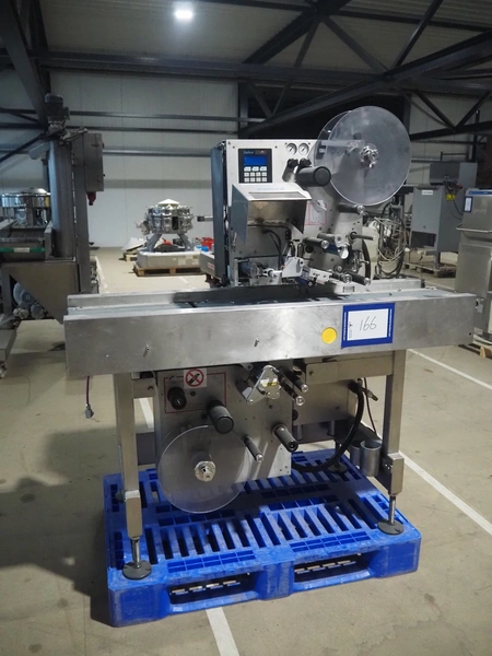 AEW Delford labelling machine with top and bottom labeller, plastic belts, belt width: (1x) 195 mm, (2x) 90 mm, total dimensions: 1500 mm x 600 mm x 1580 mm.