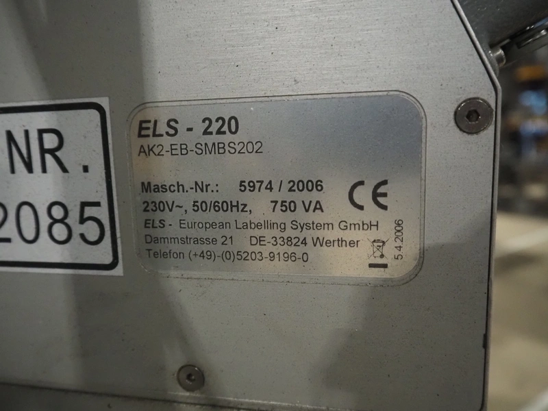 European Labelling System labelling unit, model: ELS-220, machine number: 5974/2006, 230 V, 1 Ph, 50/60 Hz, dimensions: 900 mm x 800 mm x 1450 mm.