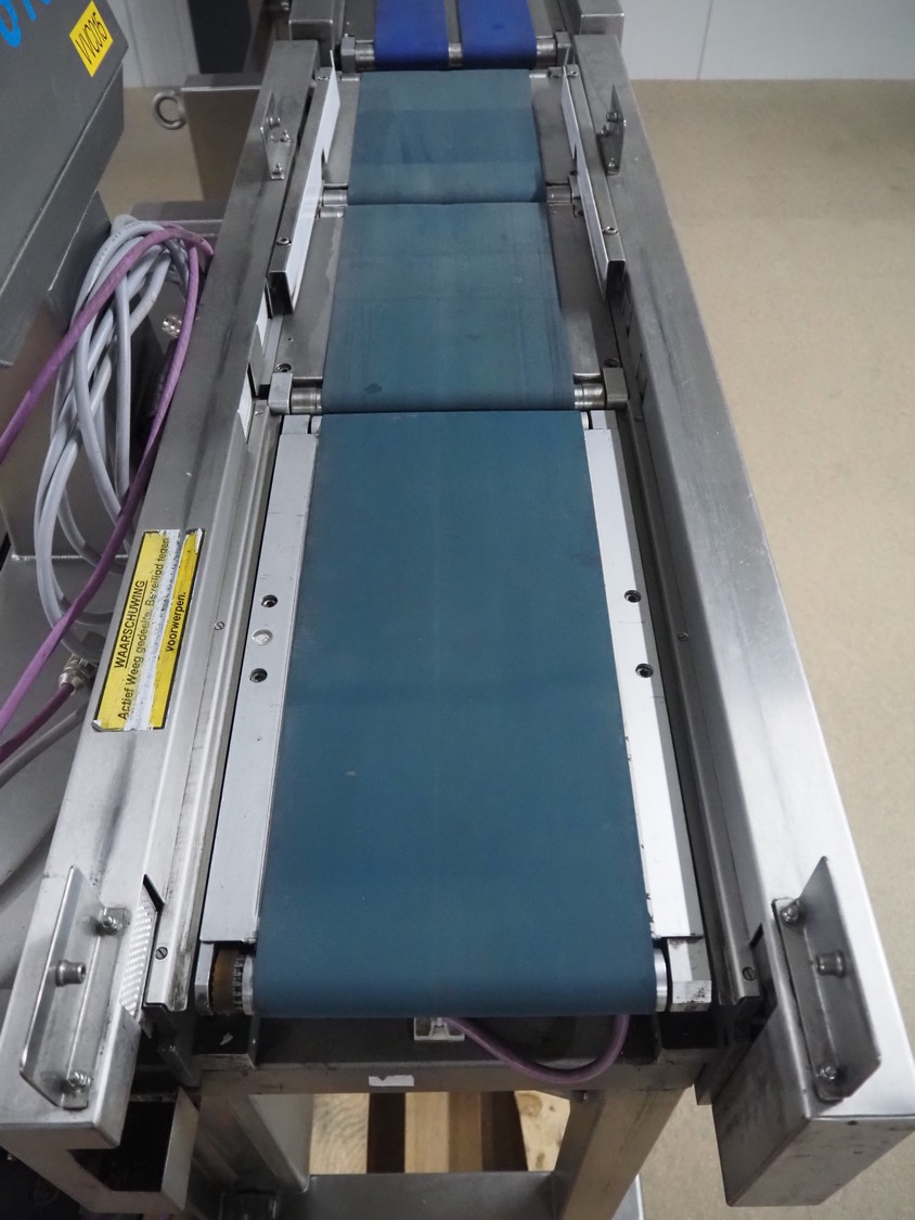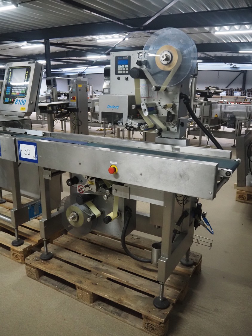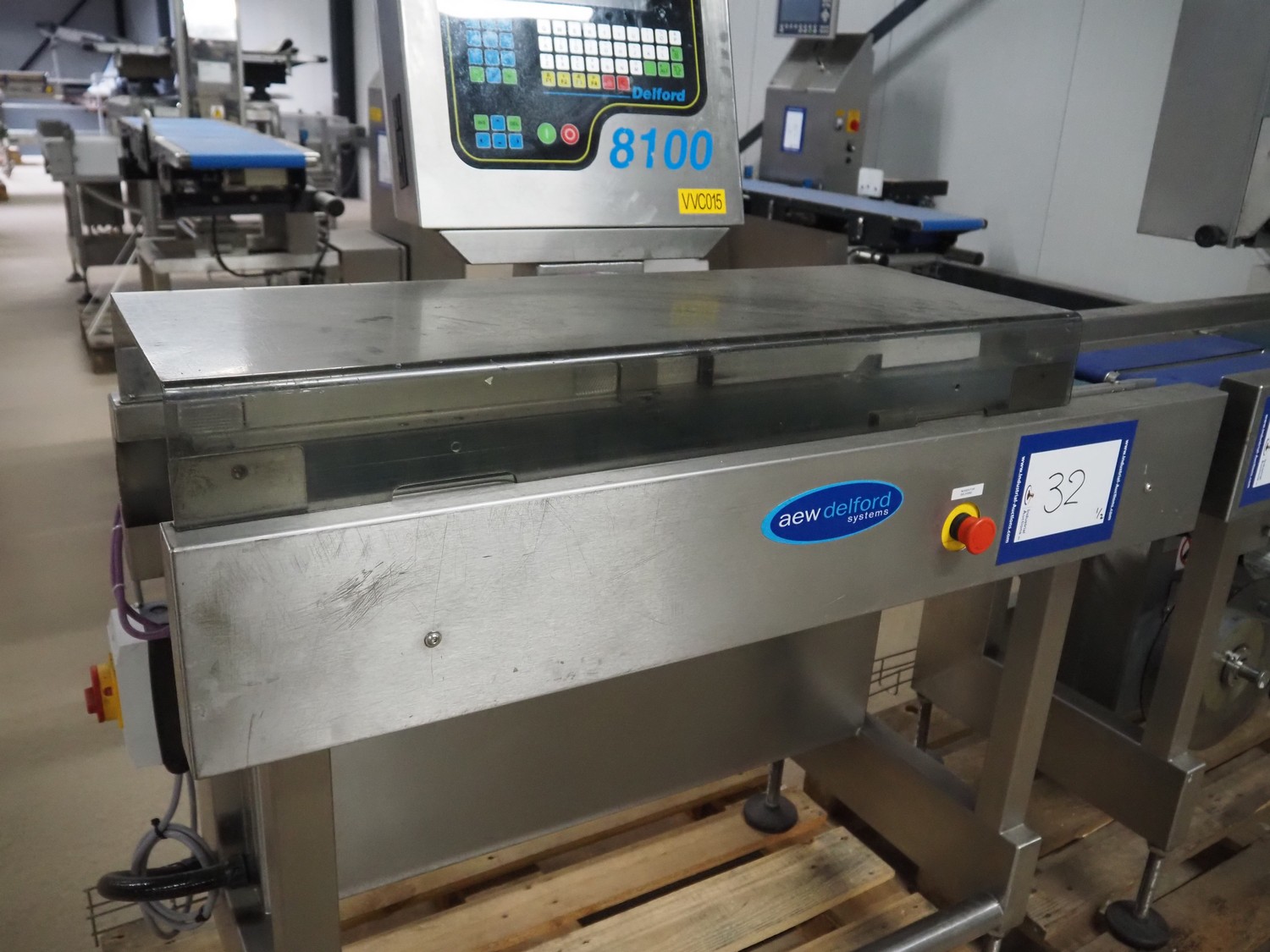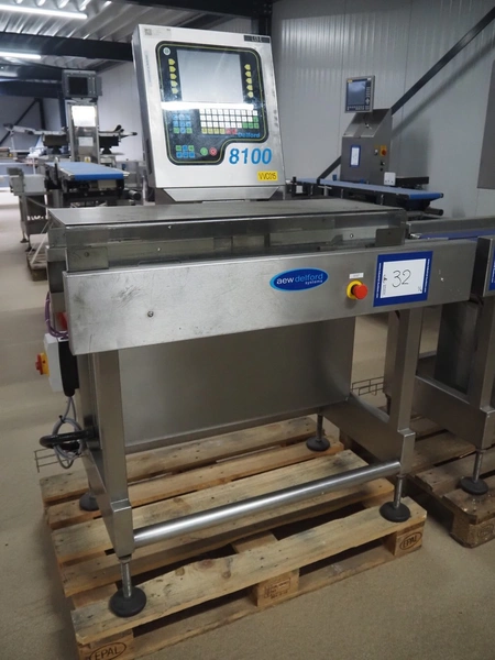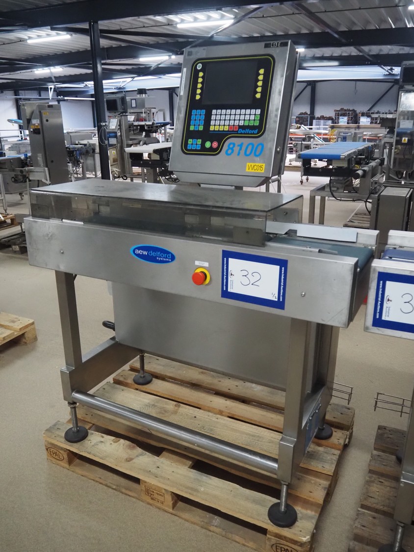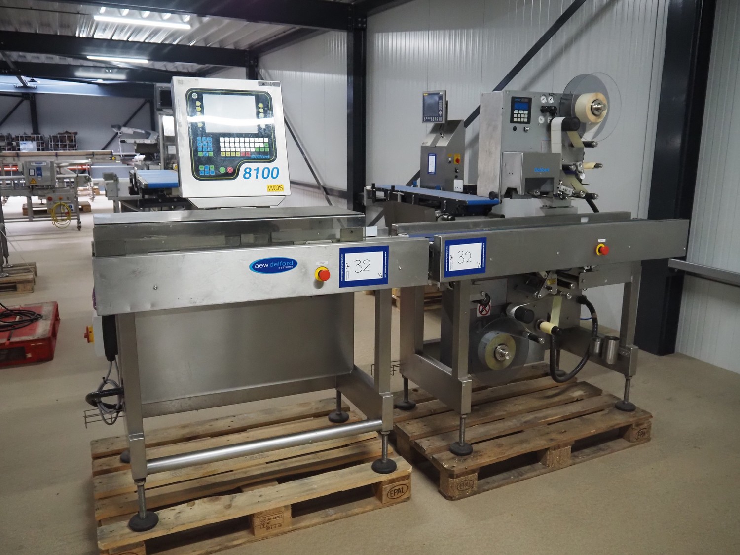 AEW Delford checkweigher with labelling machine, type checkweigher: 8060, fabrication number: 81133, year of construction: 2005, 230 V, 50 Hz, maximum weight: 1500-4000 gram, minimum weight: 20-40 gram, e =1-2 gram, T = -1000 gram, type labeller: 8000, plastic belt, belt width: (2x) 90 mm and 195 mm, dimensions checkweigher: 1500 mm x 700 mm x 1630 mm and dimensions labelling machine: 1200 mm x 700 mm x 1530 mm.