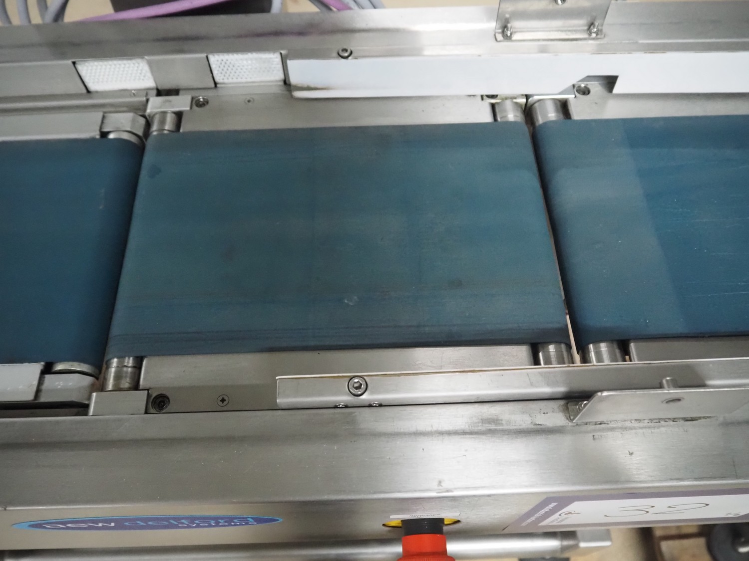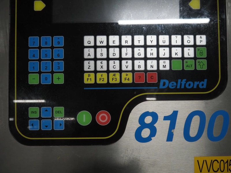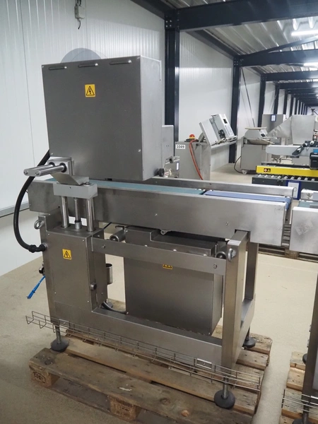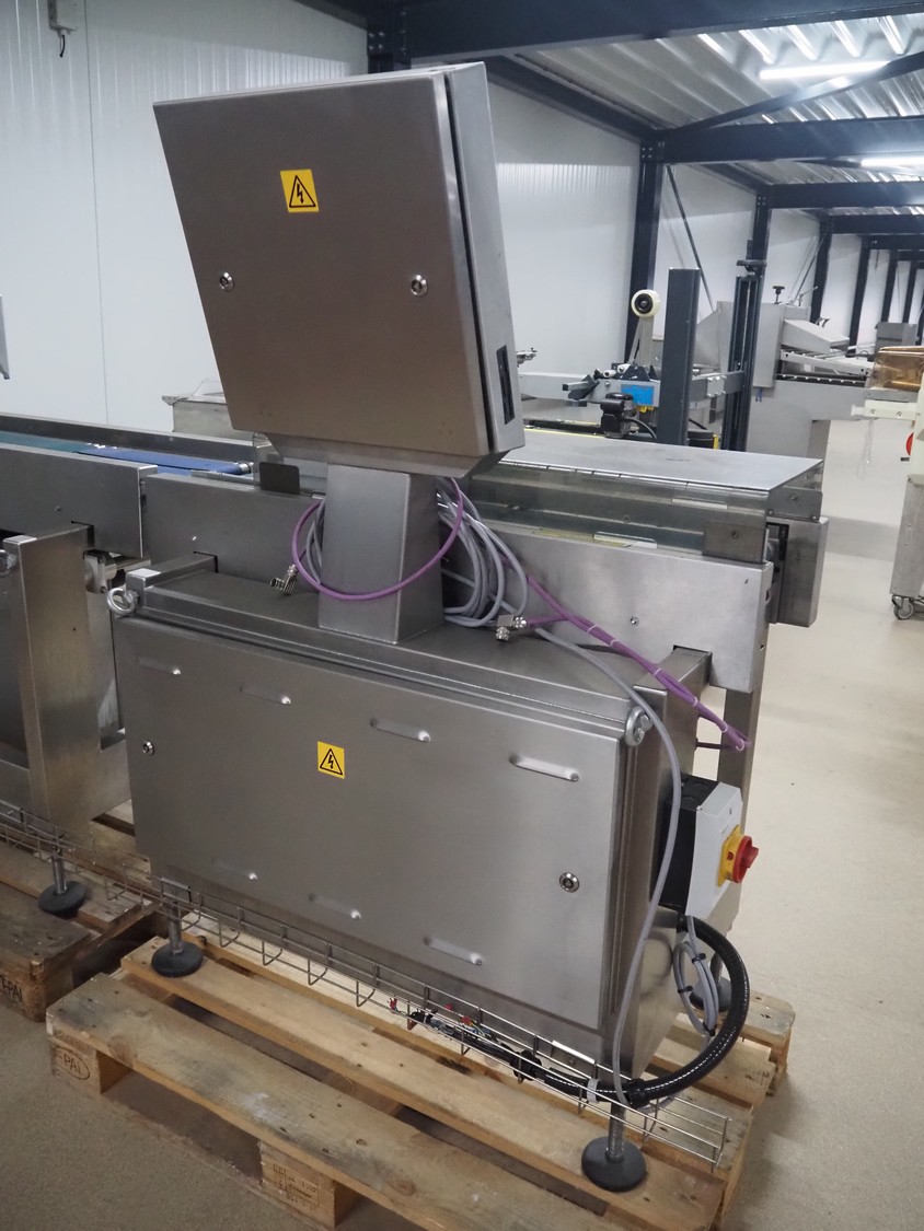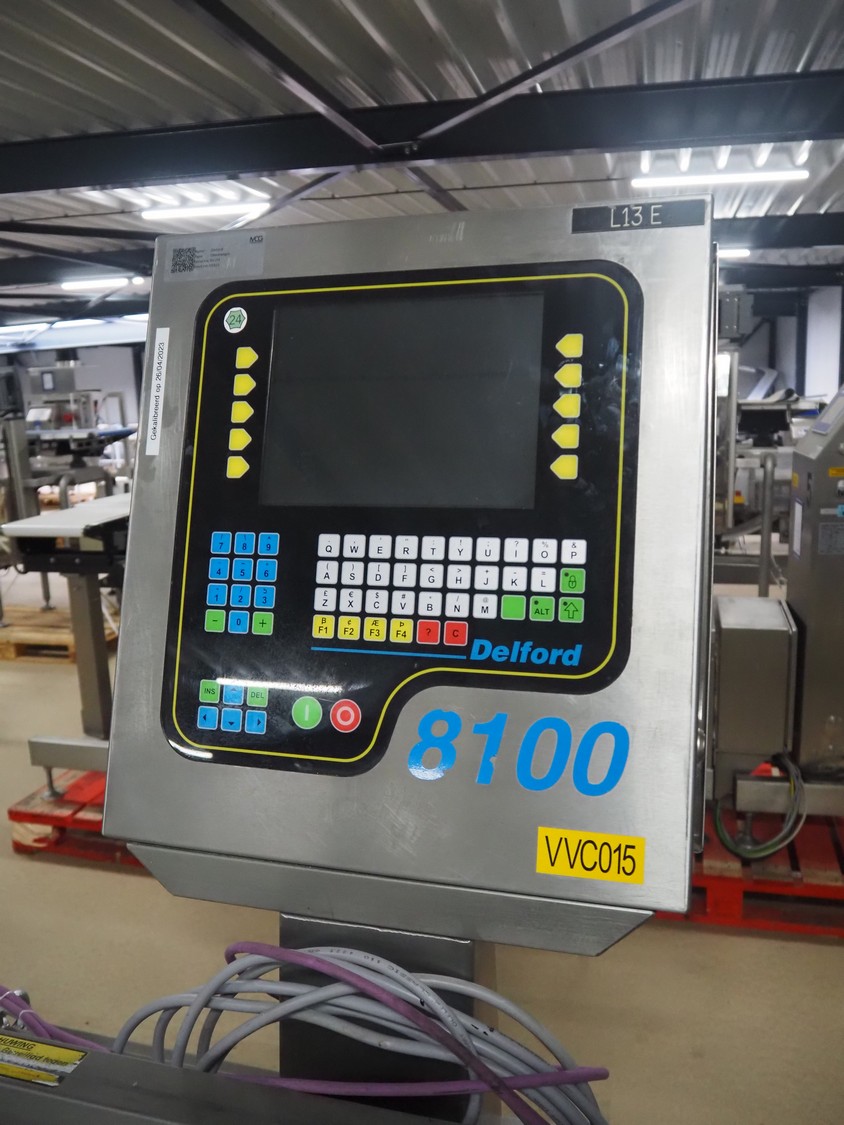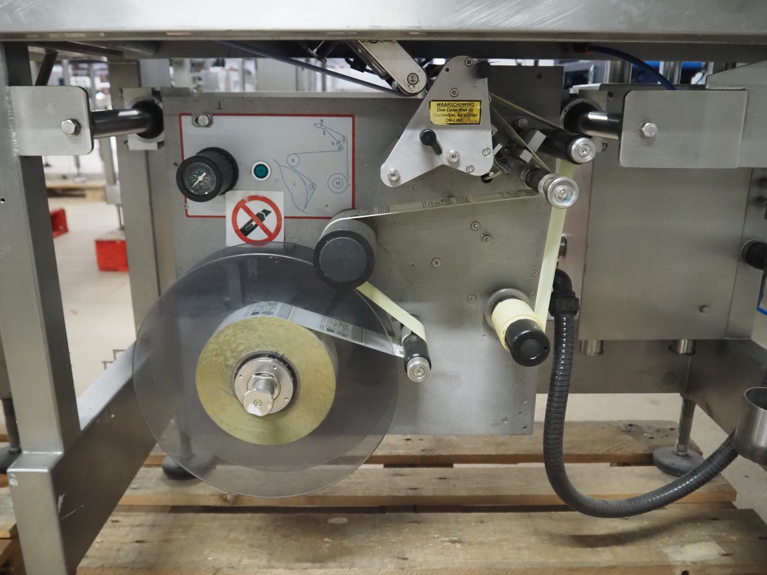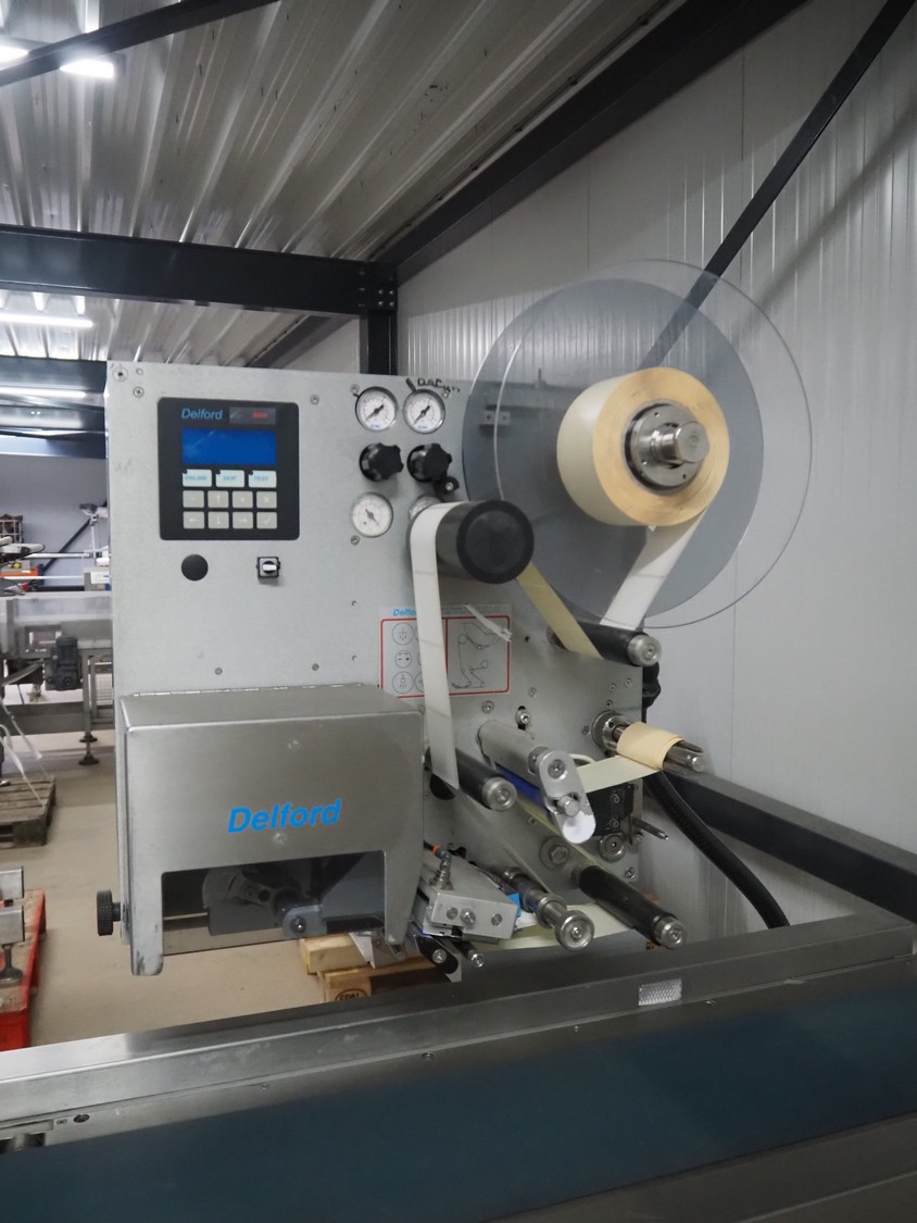 AEW Delford checkweigher with labelling machine, type checkweigher: 8060, fabrication number: 81133, year of construction: 2005, 230 V, 50 Hz, maximum weight: 1500-4000 gram, minimum weight: 20-40 gram, e =1-2 gram, T = -1000 gram, type labeller: 8000, plastic belt, belt width: (2x) 90 mm and 195 mm, dimensions checkweigher: 1500 mm x 700 mm x 1630 mm and dimensions labelling machine: 1200 mm x 700 mm x 1530 mm.