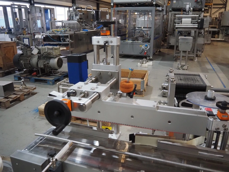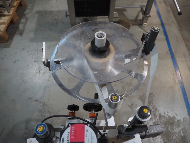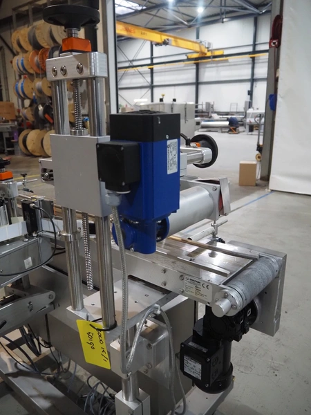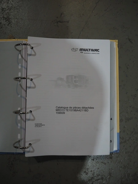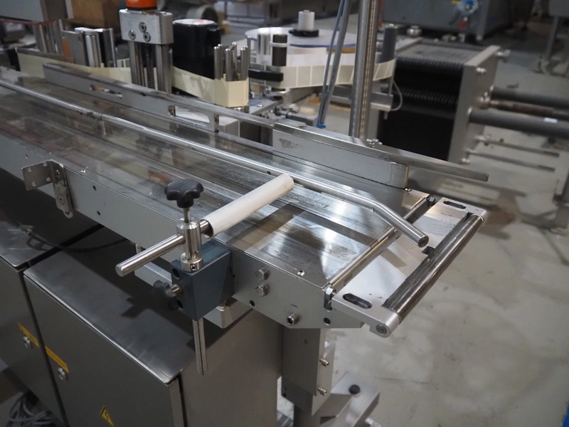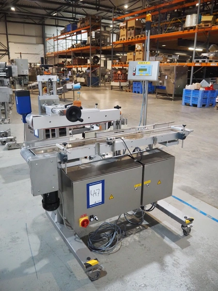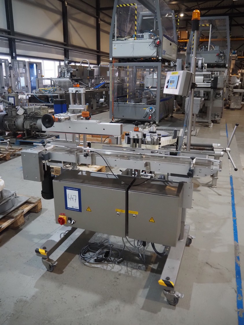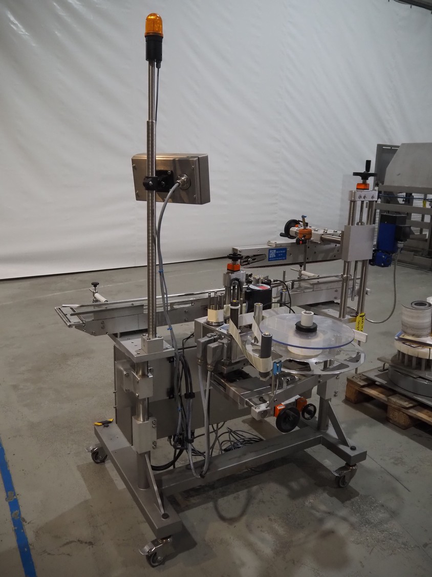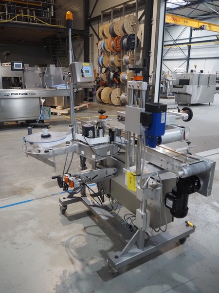 Multivac mobile labelling machine with side labeller, type: MR313, machine number: 159009, year of construction: 2012, 230 V, 50 Hz, plastic belt, belt width: 200 mm, total dimensions: 1500 mm x 1200 mm x 1850 mm.
