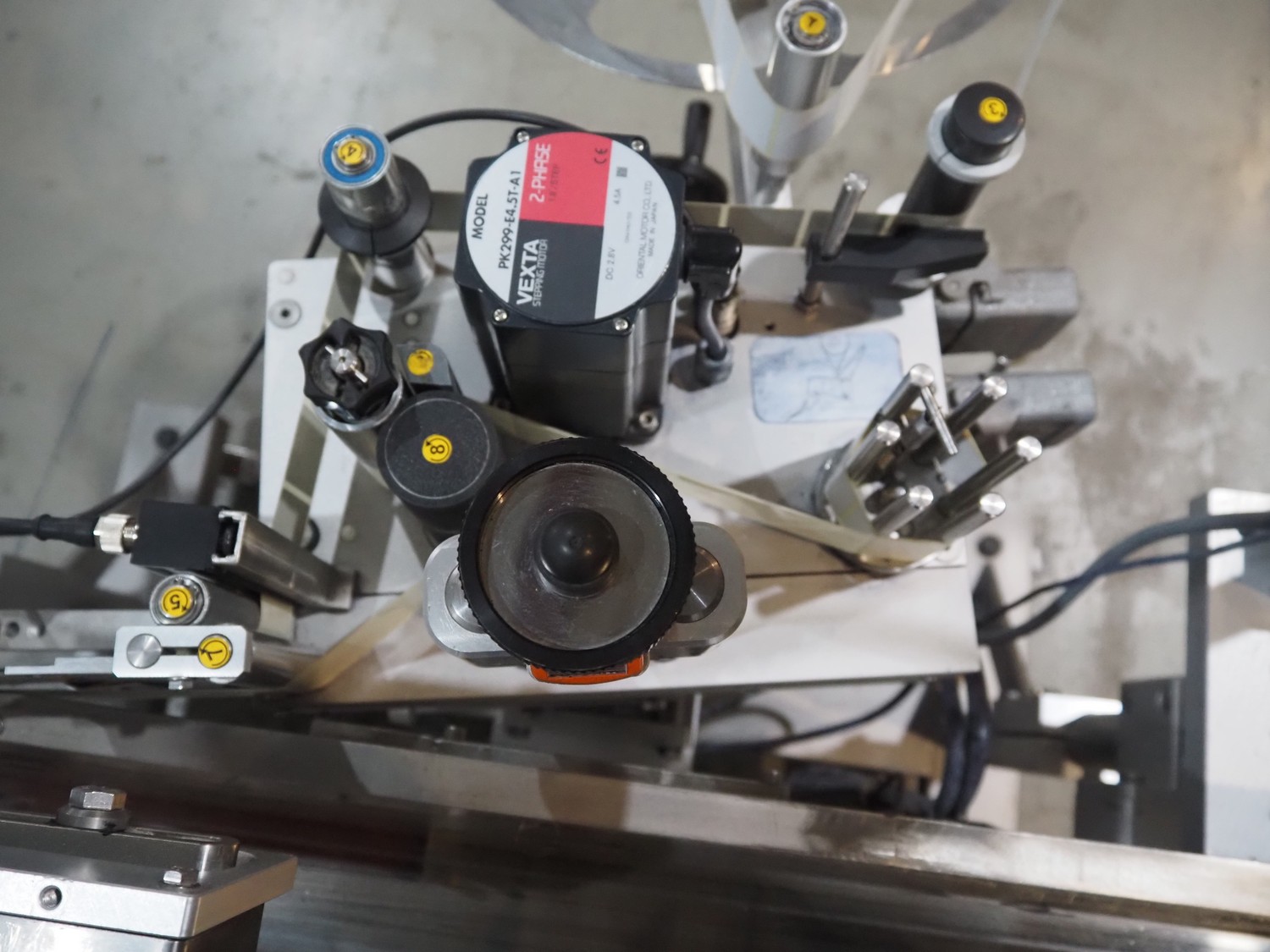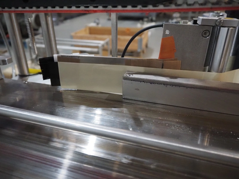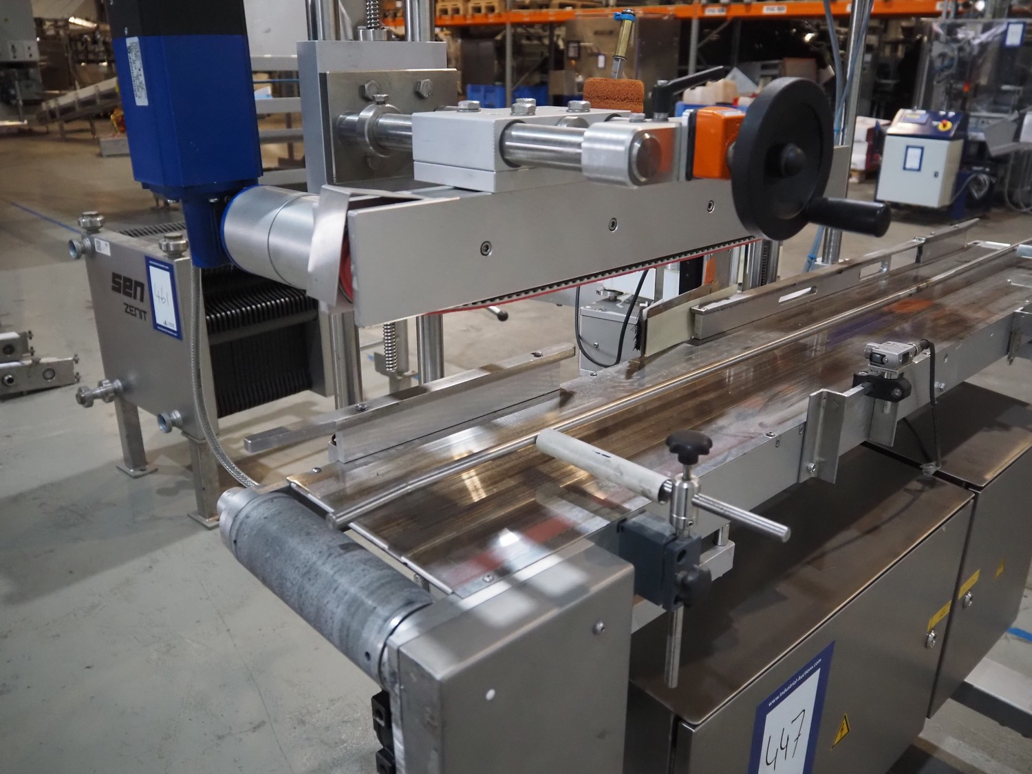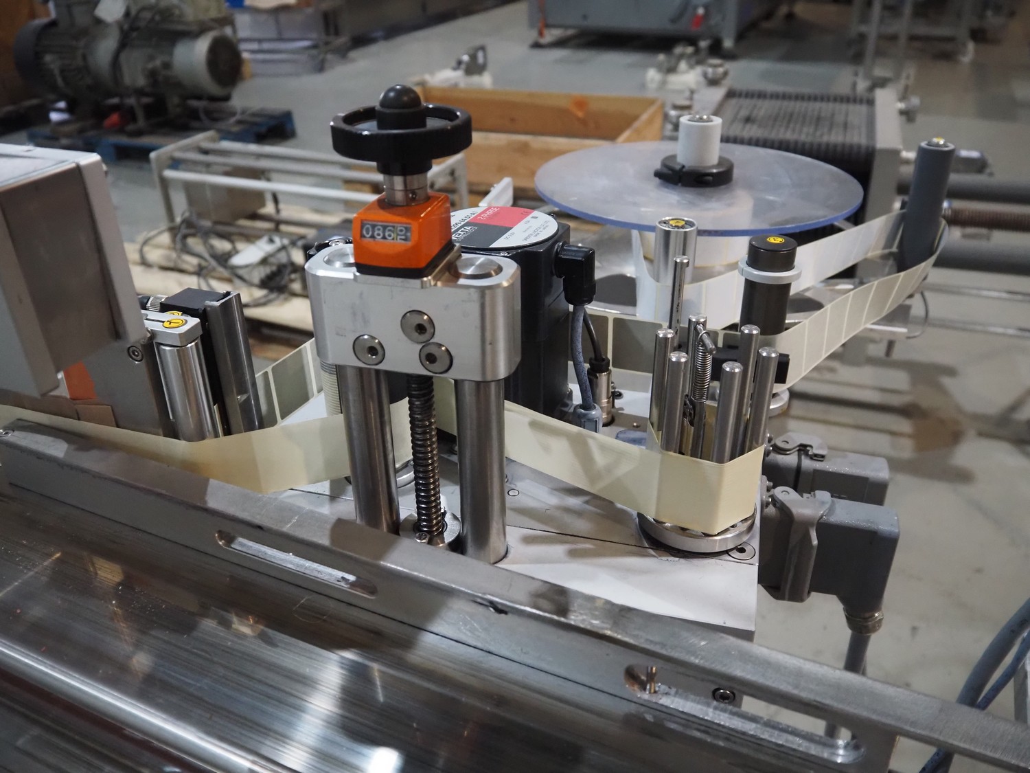 Multivac mobile labelling machine with side labeller, type: MR313, machine number: 159009, year of construction: 2012, 230 V, 50 Hz, plastic belt, belt width: 200 mm, total dimensions: 1500 mm x 1200 mm x 1850 mm.