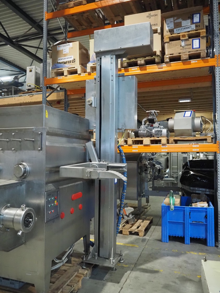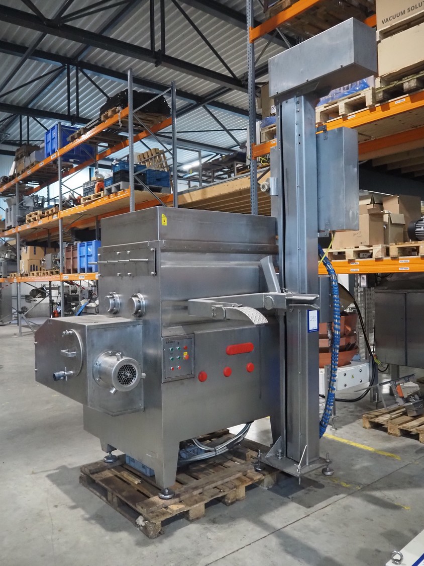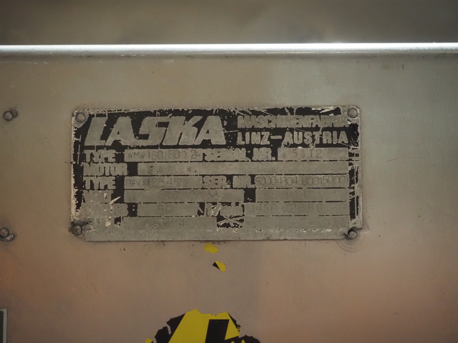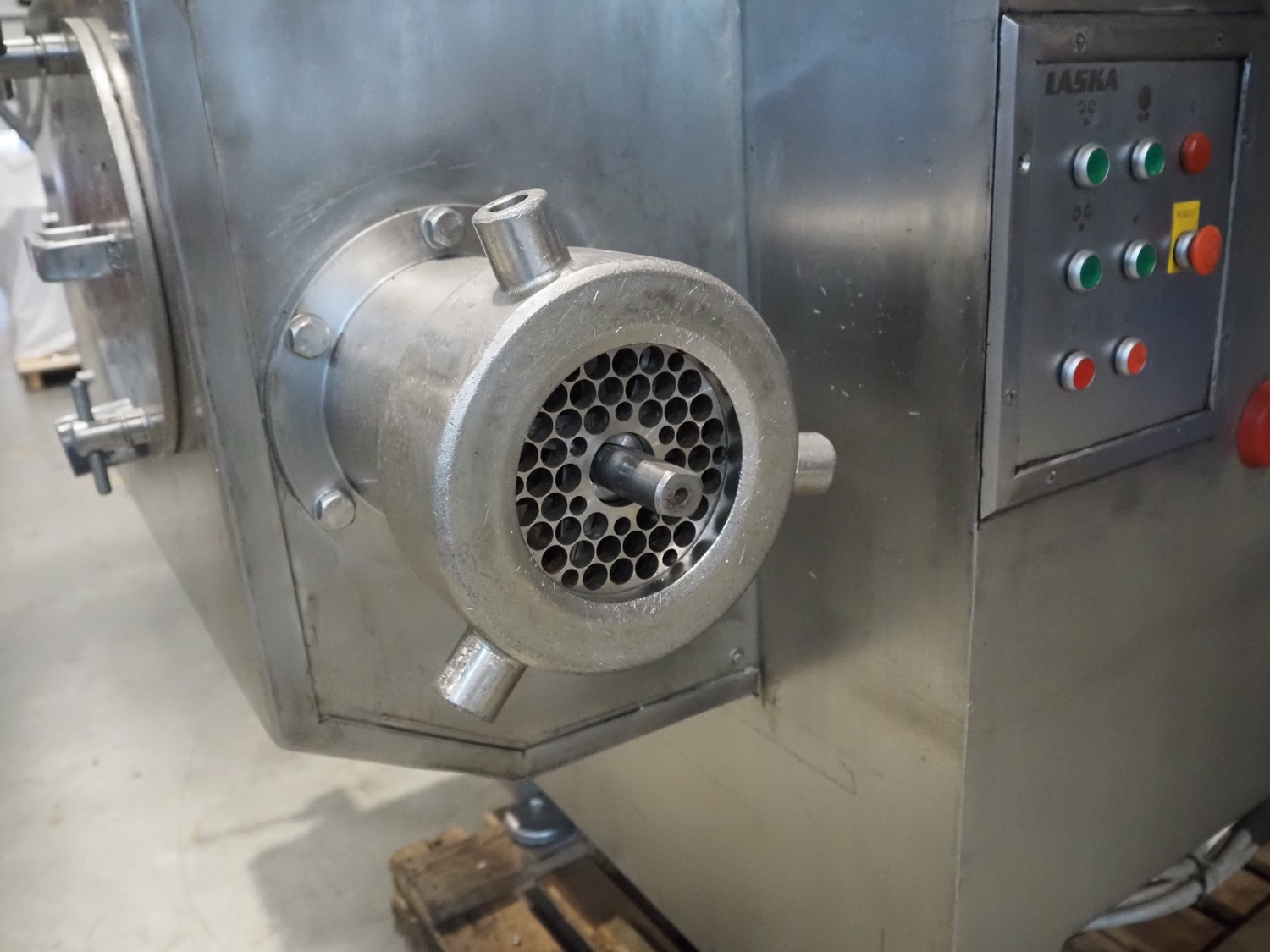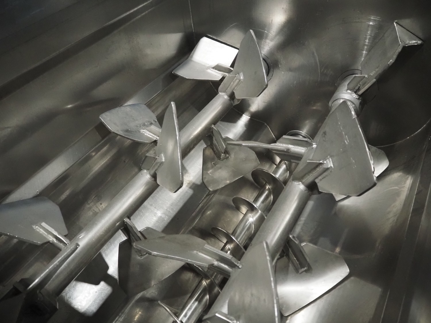 Laska double shaft paddle mixer-grinder, type: WMW 160/800 2A, serial number: 5312, 380 V, 50 Hz, 8/11 A, 3.3/4 kW, plate diameter: 160 mm, volume: 800 liter, total dimensions: 2300 mm x 2150 mm x 3450 mm.