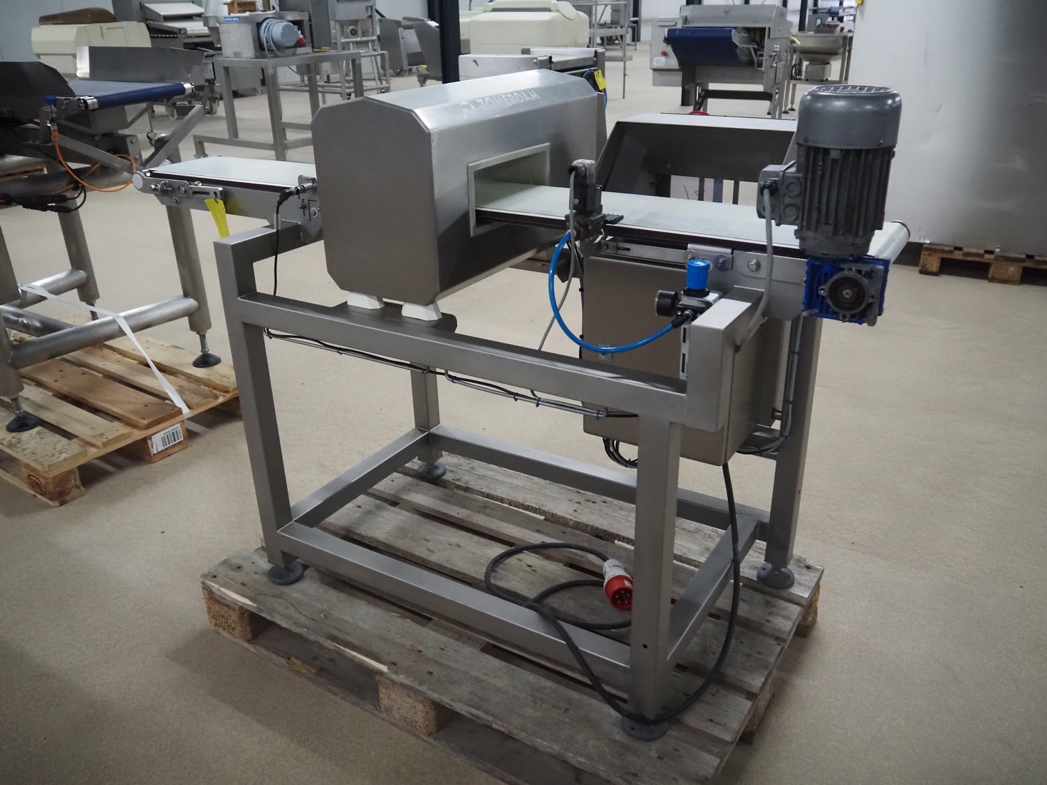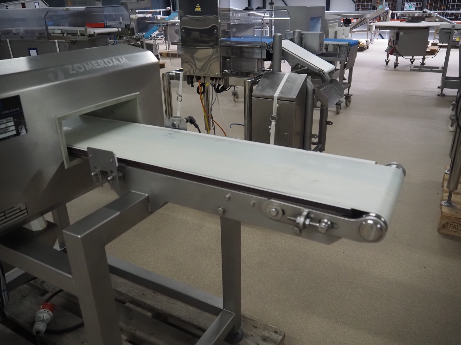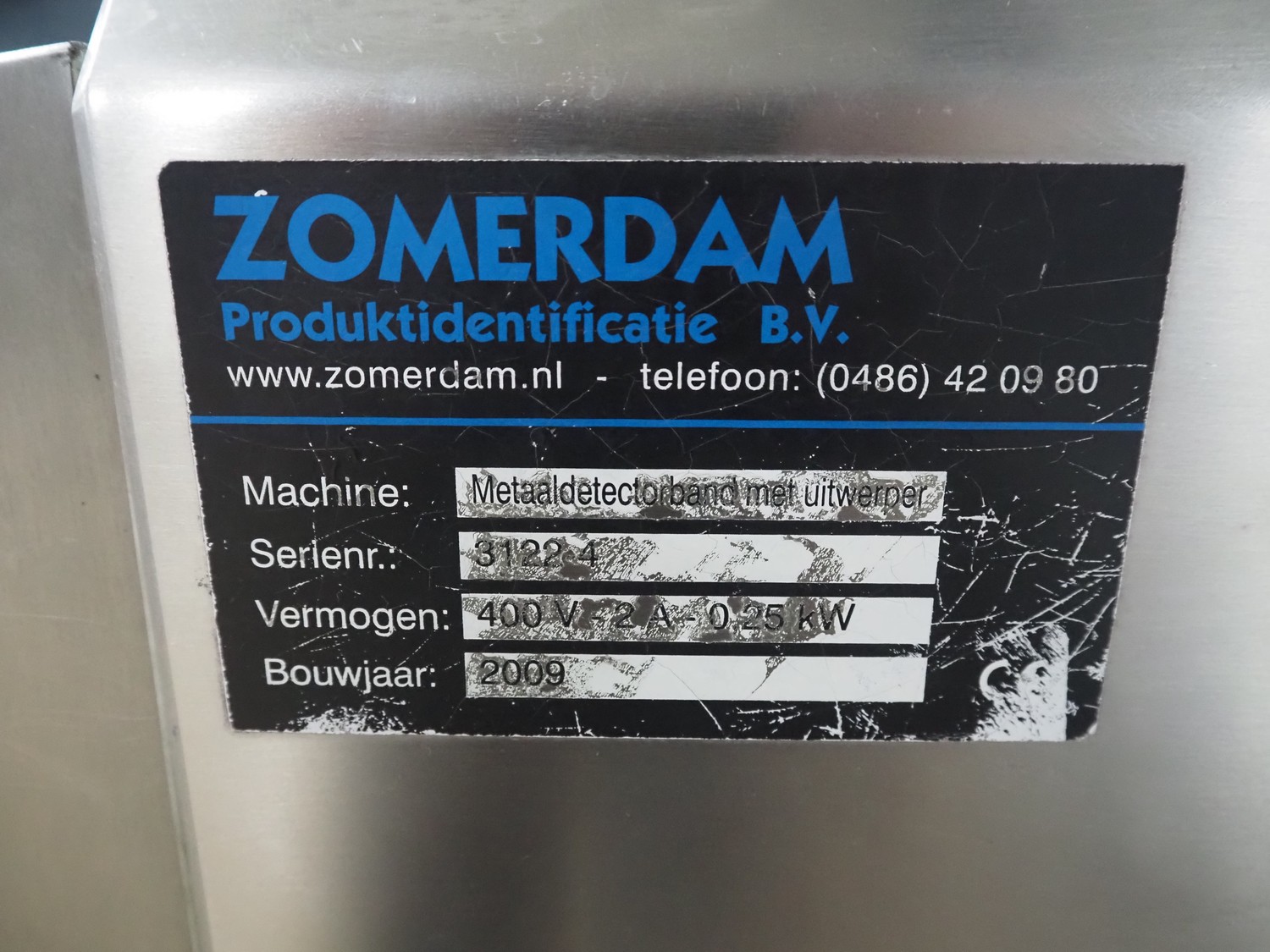 Zomerdam metal detector with rejector, serial number: 31224, 400 V, 2 A, 0.25 kW, year of construction: 2009, plastic belt, belt width: 200 mm, clearance: 250 mm x 70 mm, total dimensions: 1680 mm x 800 mm x 1050 mm.