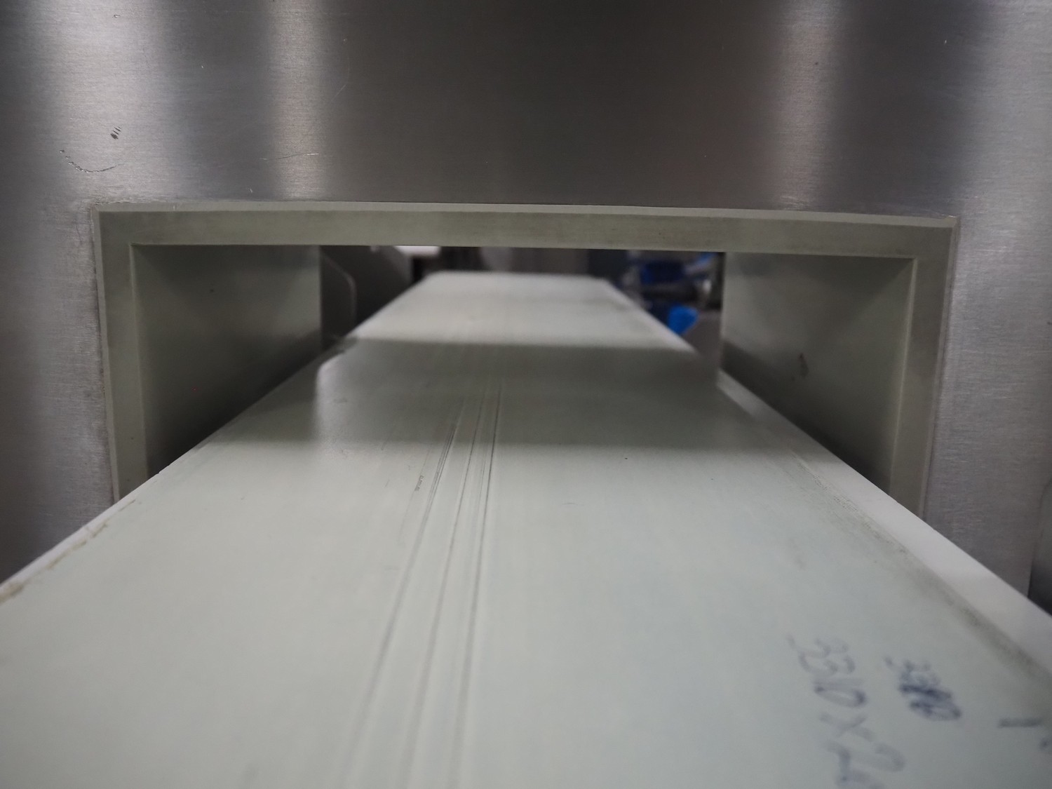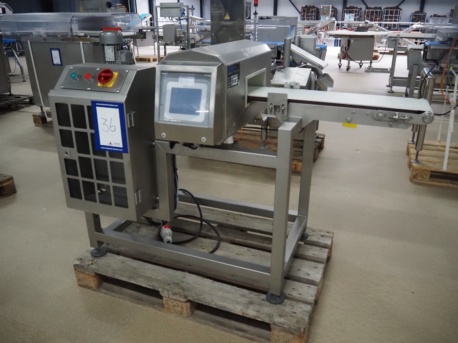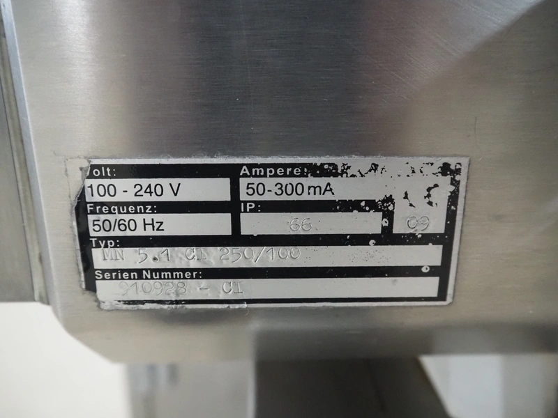 Zomerdam metal detector with rejector, serial number: 31224, 400 V, 2 A, 0.25 kW, year of construction: 2009, plastic belt, belt width: 200 mm, clearance: 250 mm x 70 mm, total dimensions: 1680 mm x 800 mm x 1050 mm.