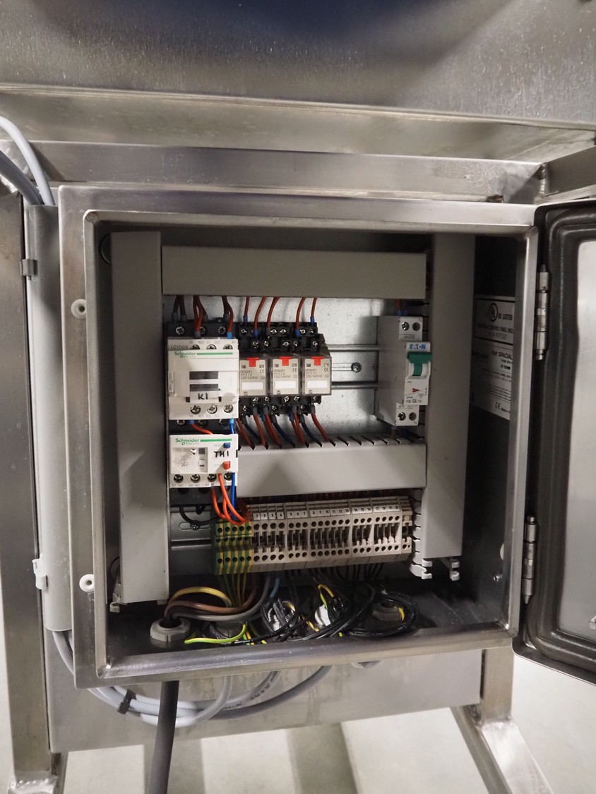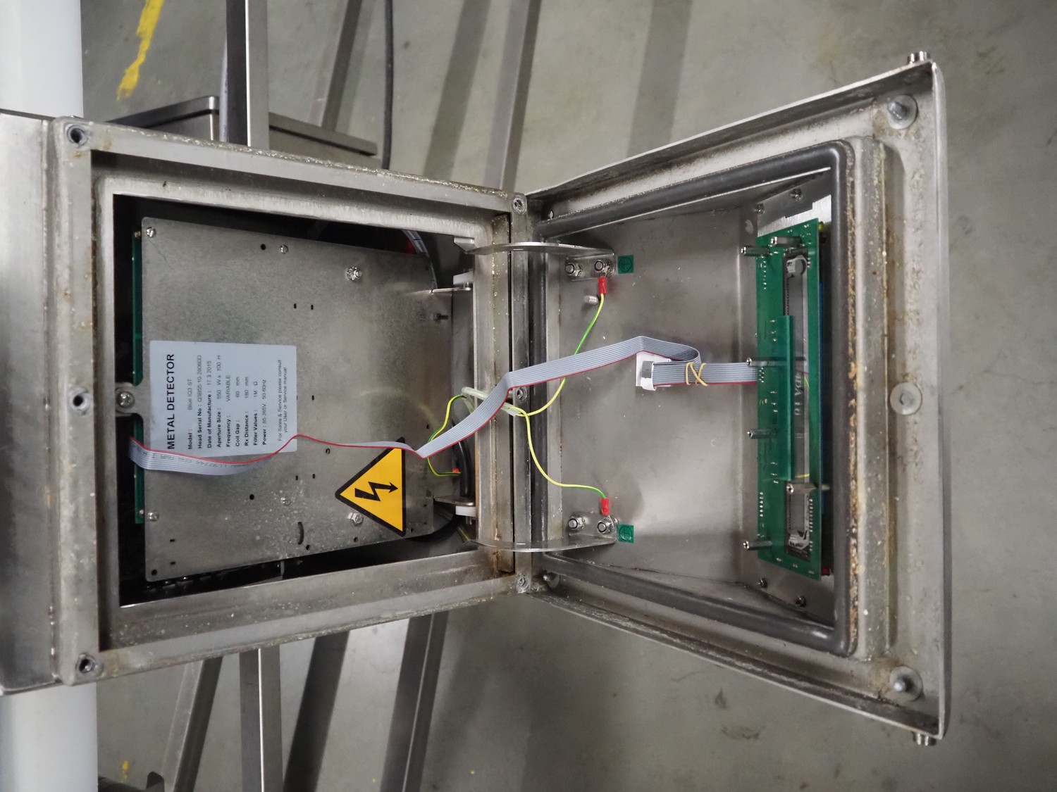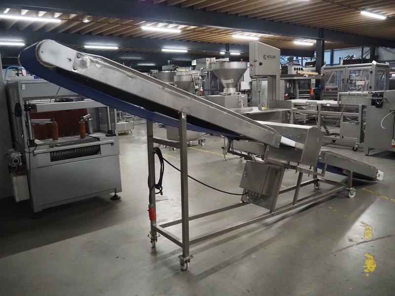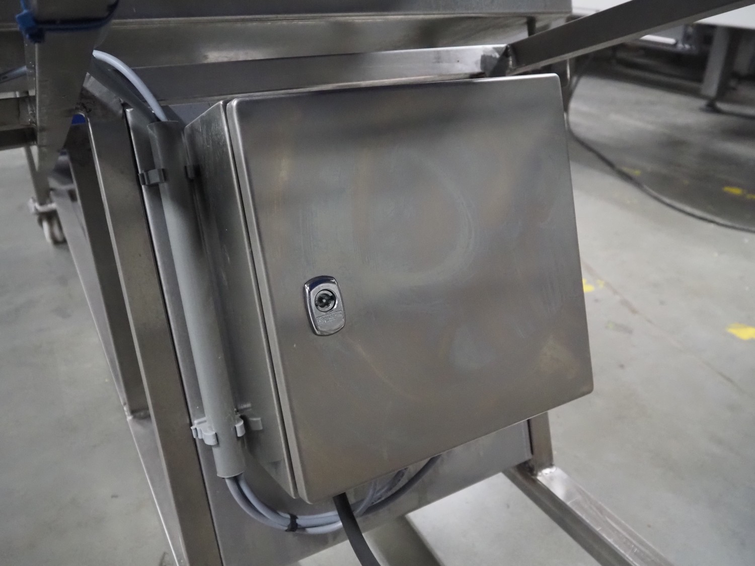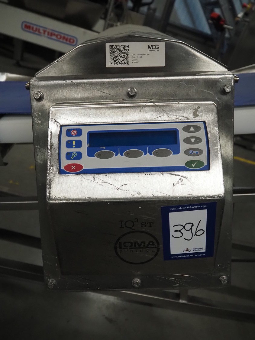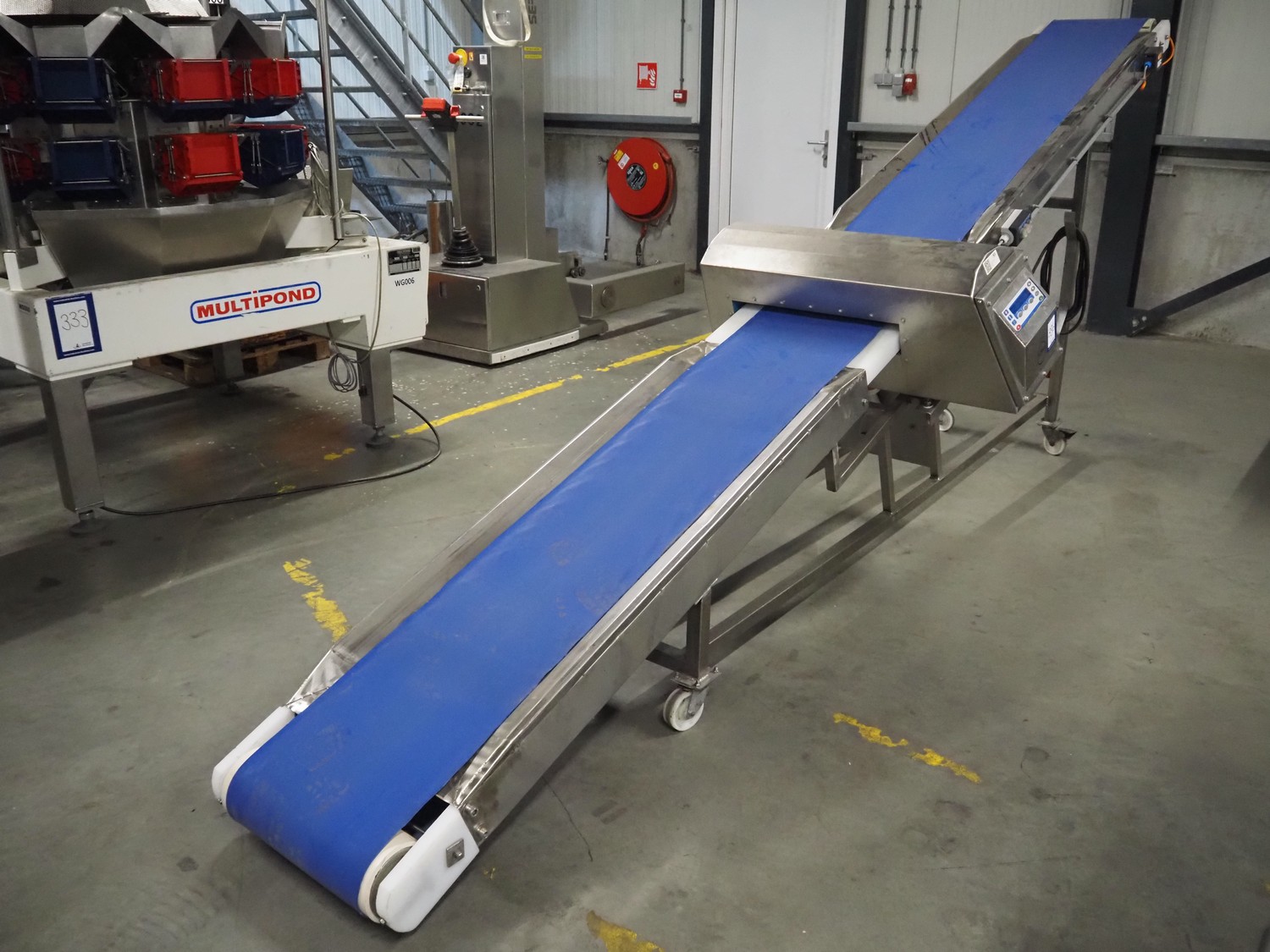 Loma Systems metal detector on mobile elevating belt, type: Blue IQ3 ST, serial number: Q3B55-10-28060D, year of construction: 17.3.2015, 110-240 V, 1 Ph, 50/60 Hz, 0.3-0.6 A, plastic belt, belt width: 410, clearance: 550 mm x 30 mm, elevating height: 1750 mm, total dimensions: 4600 mm x 1030 mm x 1760 mm.
