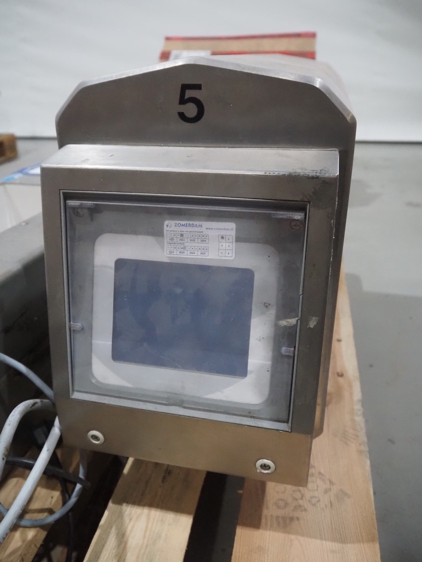 Zomerdam metal detecting head, type: MN 5.1 CI 300/150, serial number: 910208 CI, 100-240 V, 50/60 Hz, 50-300 mA, clearance: 300 mm x 150 mm, total dimensions: 750 mm x 260 mm x 400 mm.