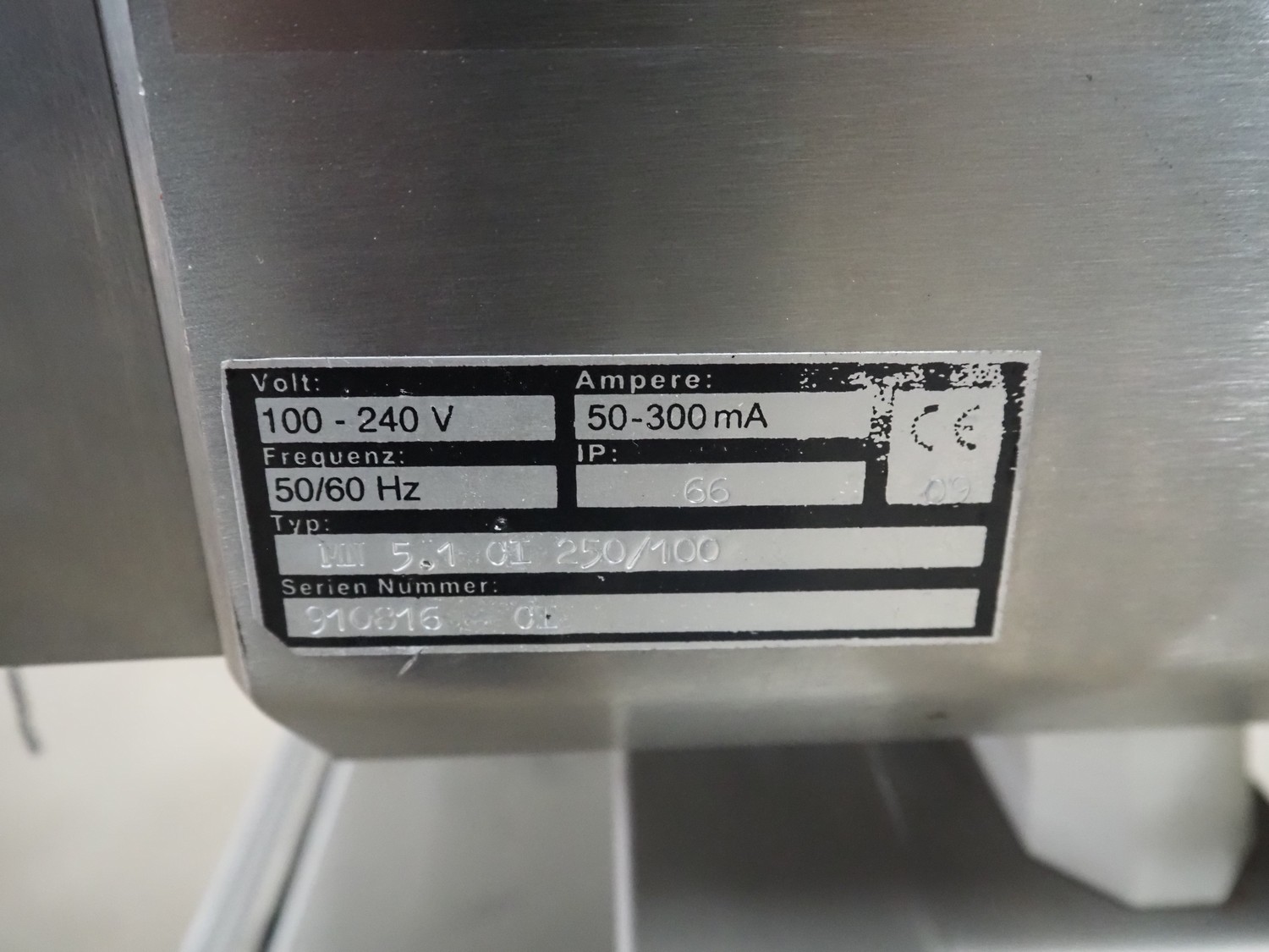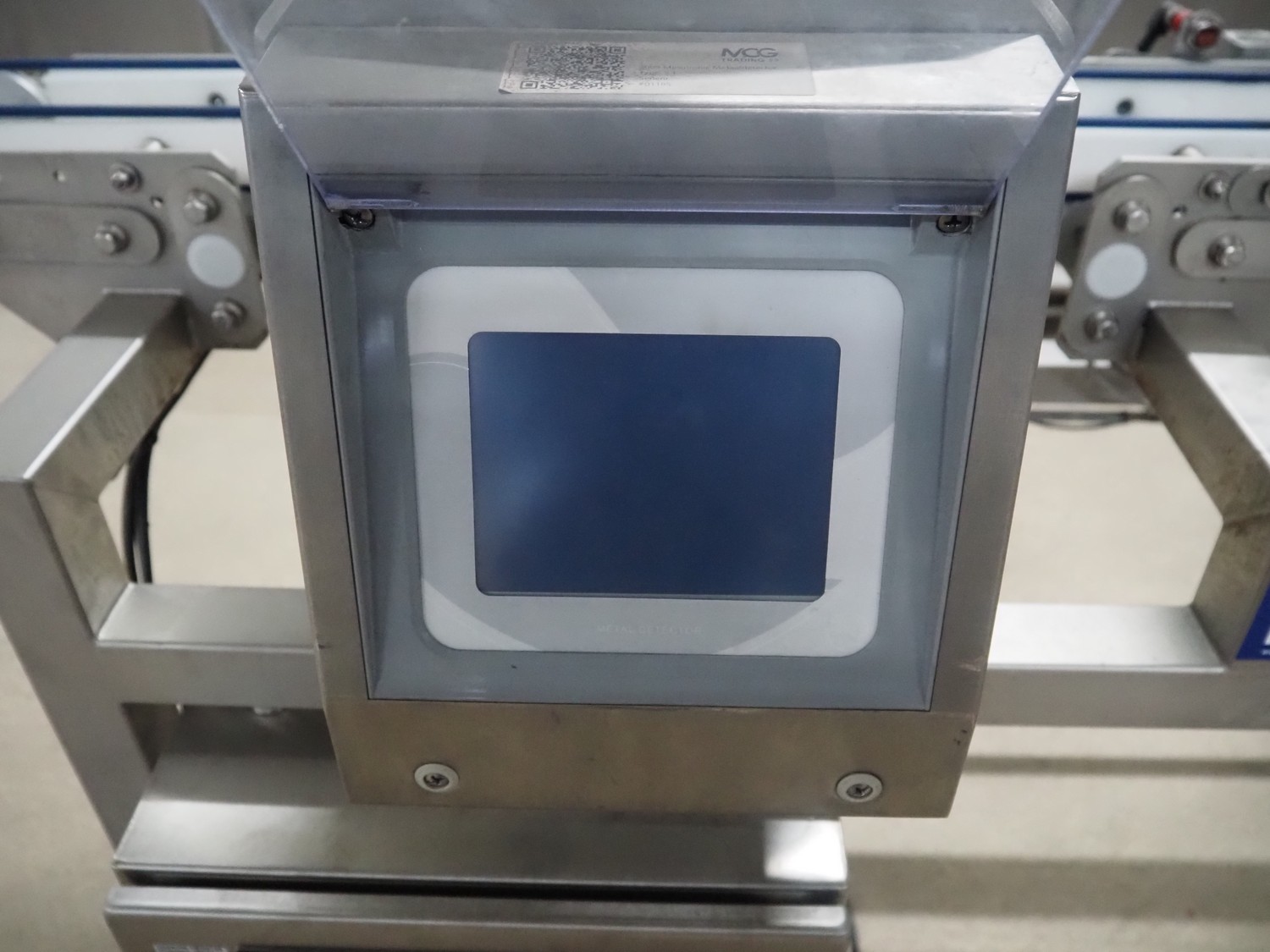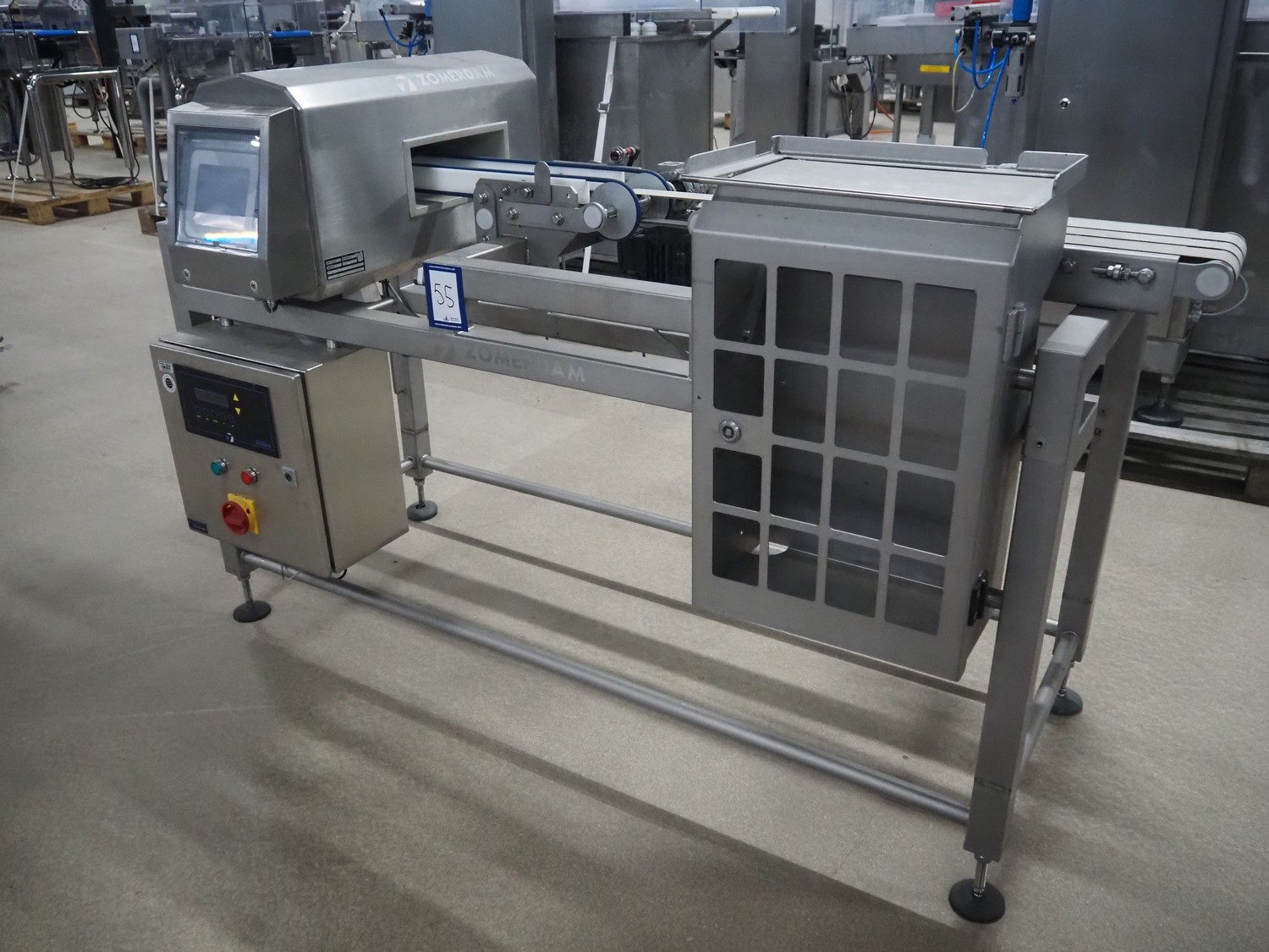 Zomerdam metal detector with rejector, type: MN 5.1 CI 250/100, serial number: 910816-CI, year of construction: 2009, 100/240 V, 50/60 Hz, 50/300 mA, string belt and plastic belt, belt width: 265 mm, clearance: 500 mm x 107 mm, total dimensions: 850 mm x 1850 mm x 1100 mm.
