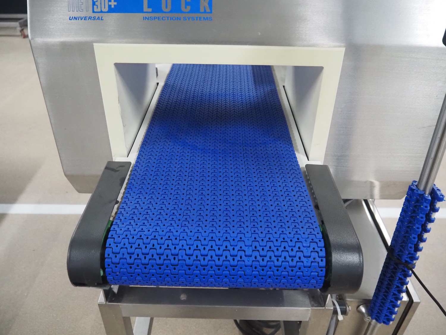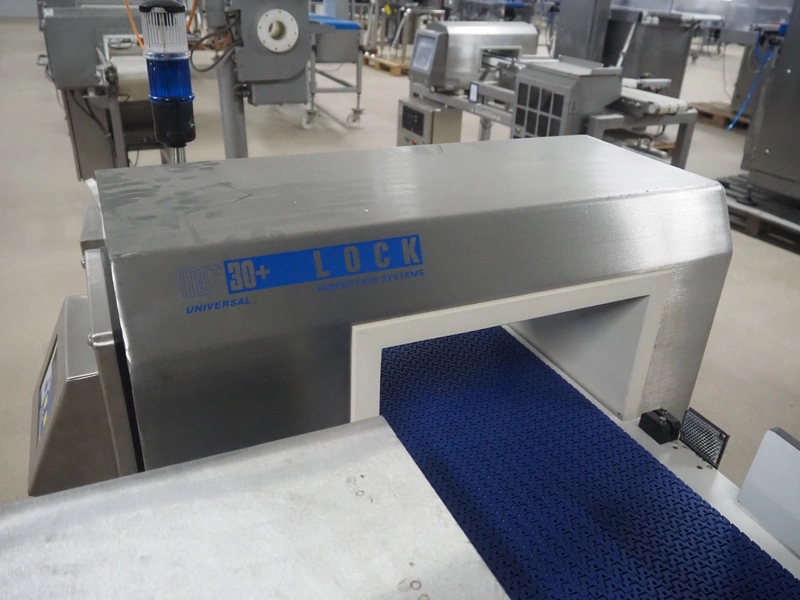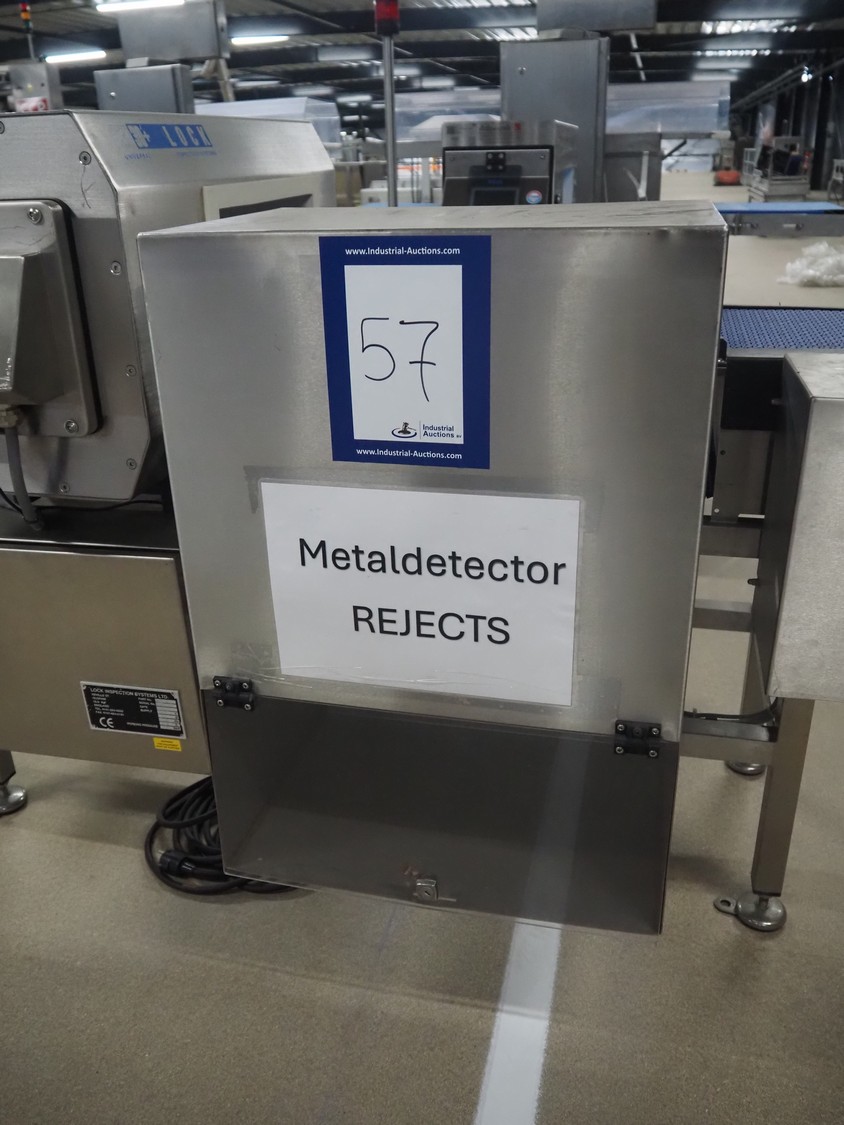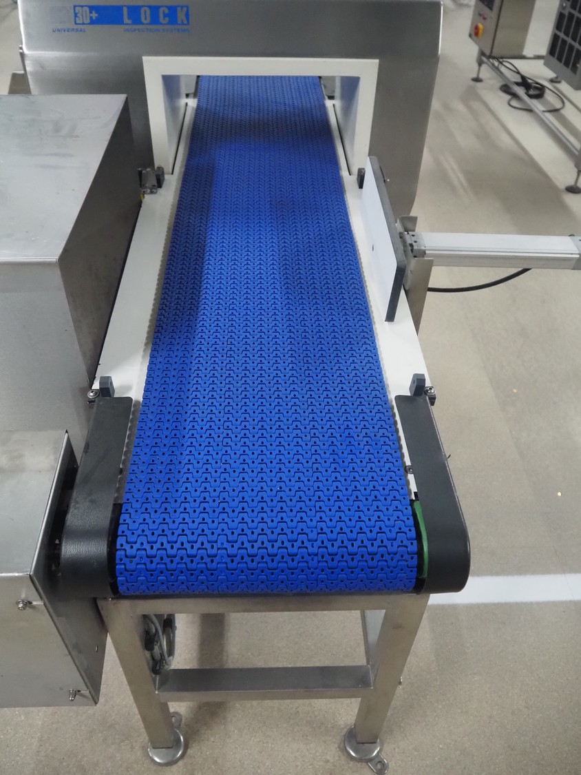 Lock Inspection Systems Ltd metal detector with rejector, serial number: 45296/1, year of construction: 12/10, 230 V, 1 Ph, 50 0.8 A, 5.5 bar, plastic belt, belt width: 300 mm, clearance: 350 mm x 170 mm, total dimensions: 1550 mm x 1100 mm x 1300 mm.